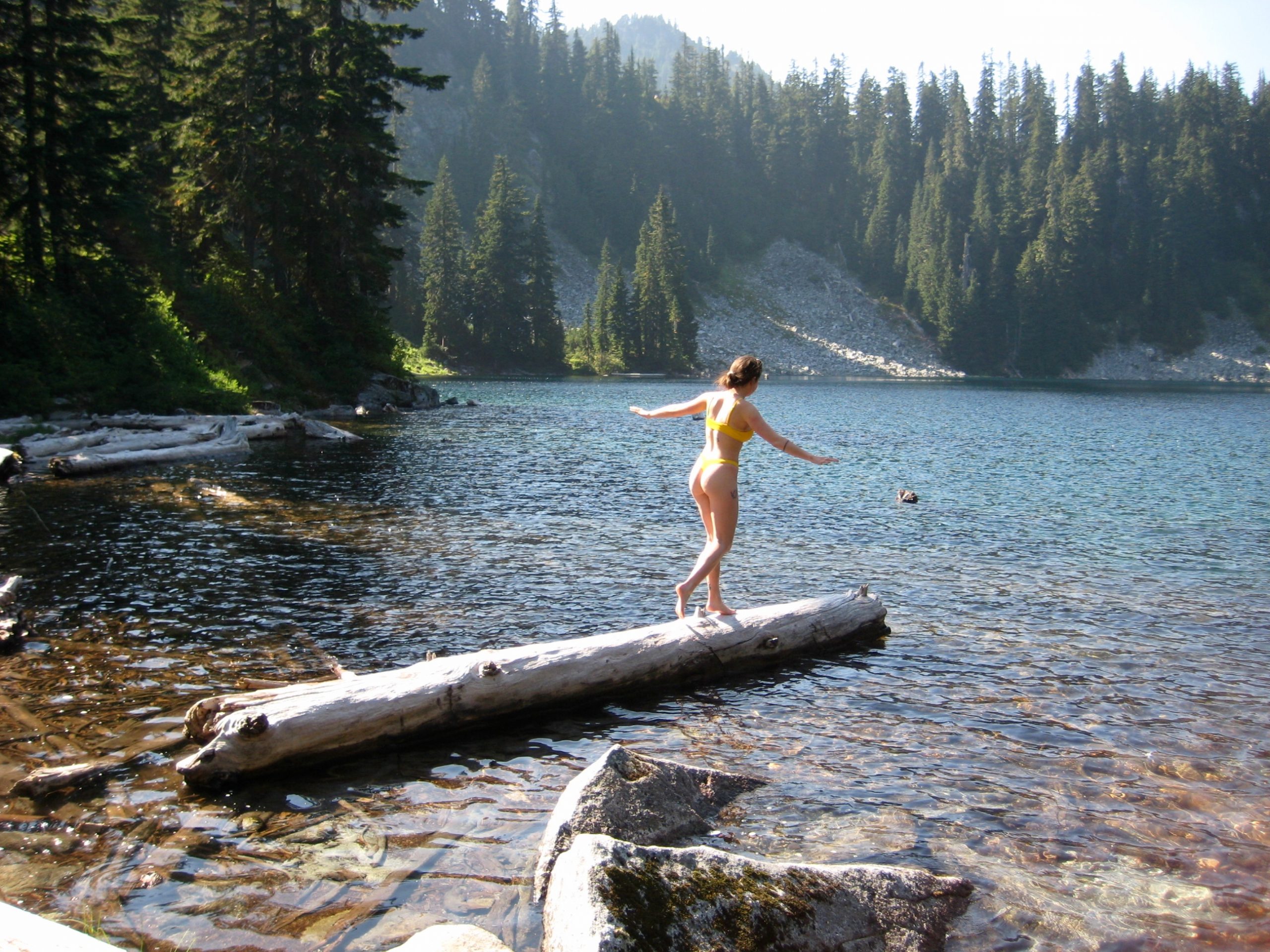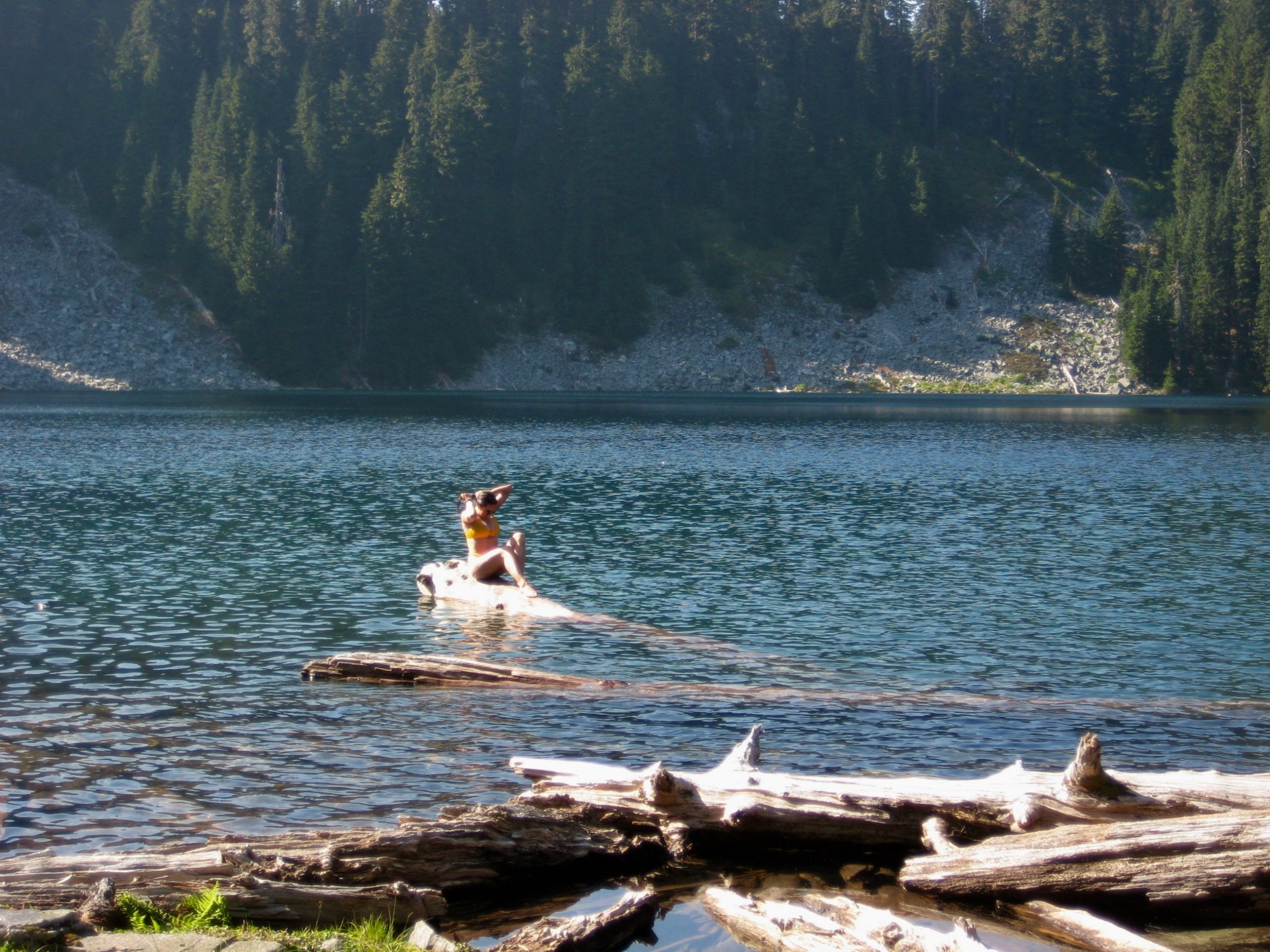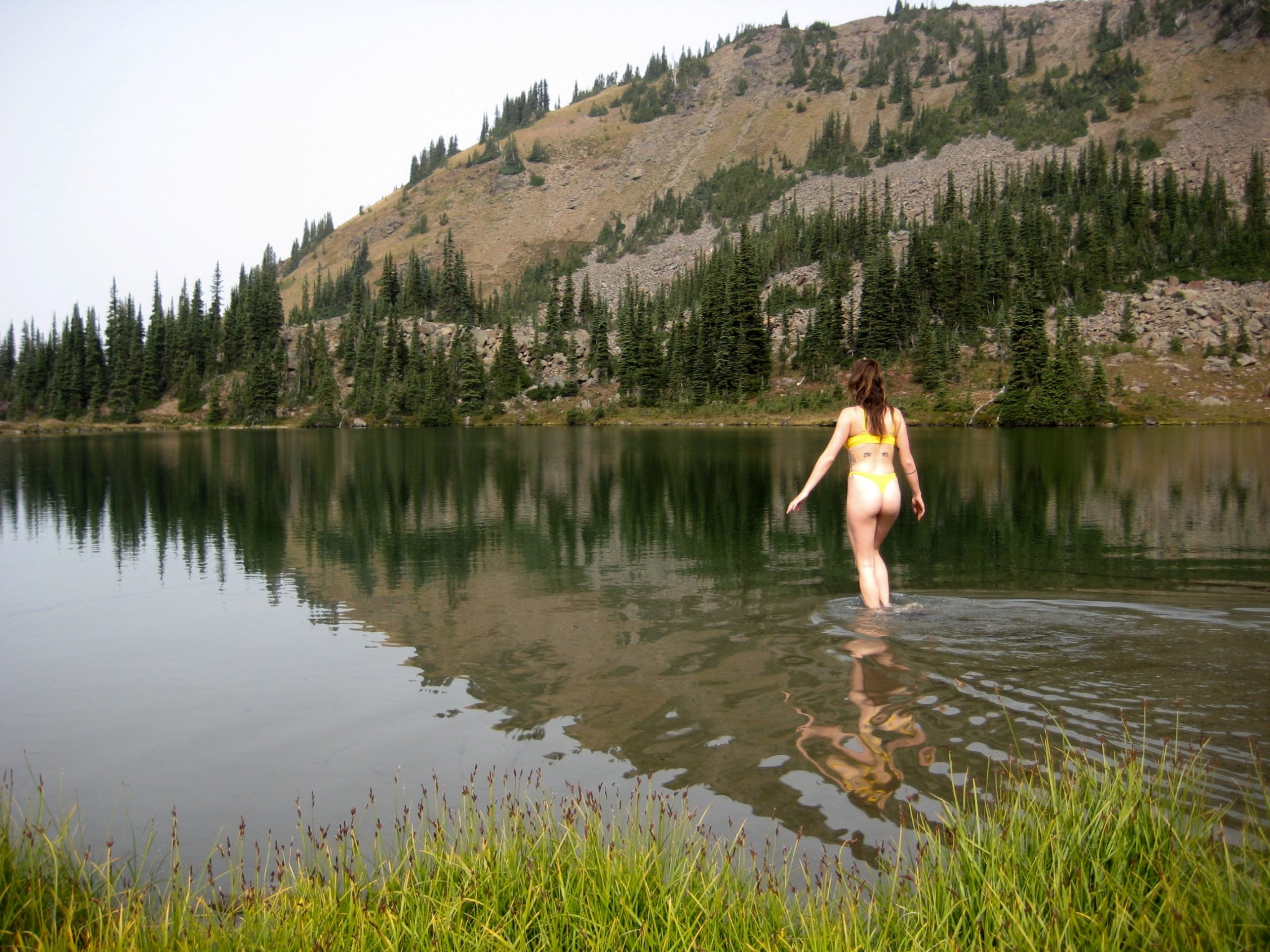Turning northward on the Wildhorse Creek Trail, we hiked over to the Lake Grace Trail junction (1.7 hours + 250 feet from Camp 2).  Eileen proceeded down-valley at a leisurely pace, whereas Brooke and I took the opportunity for a sidetrip up to Lake Grace (2.5 hours + 1150 feet from Camp 2).  Naturally, Brooke took a cooling dip in the lake.