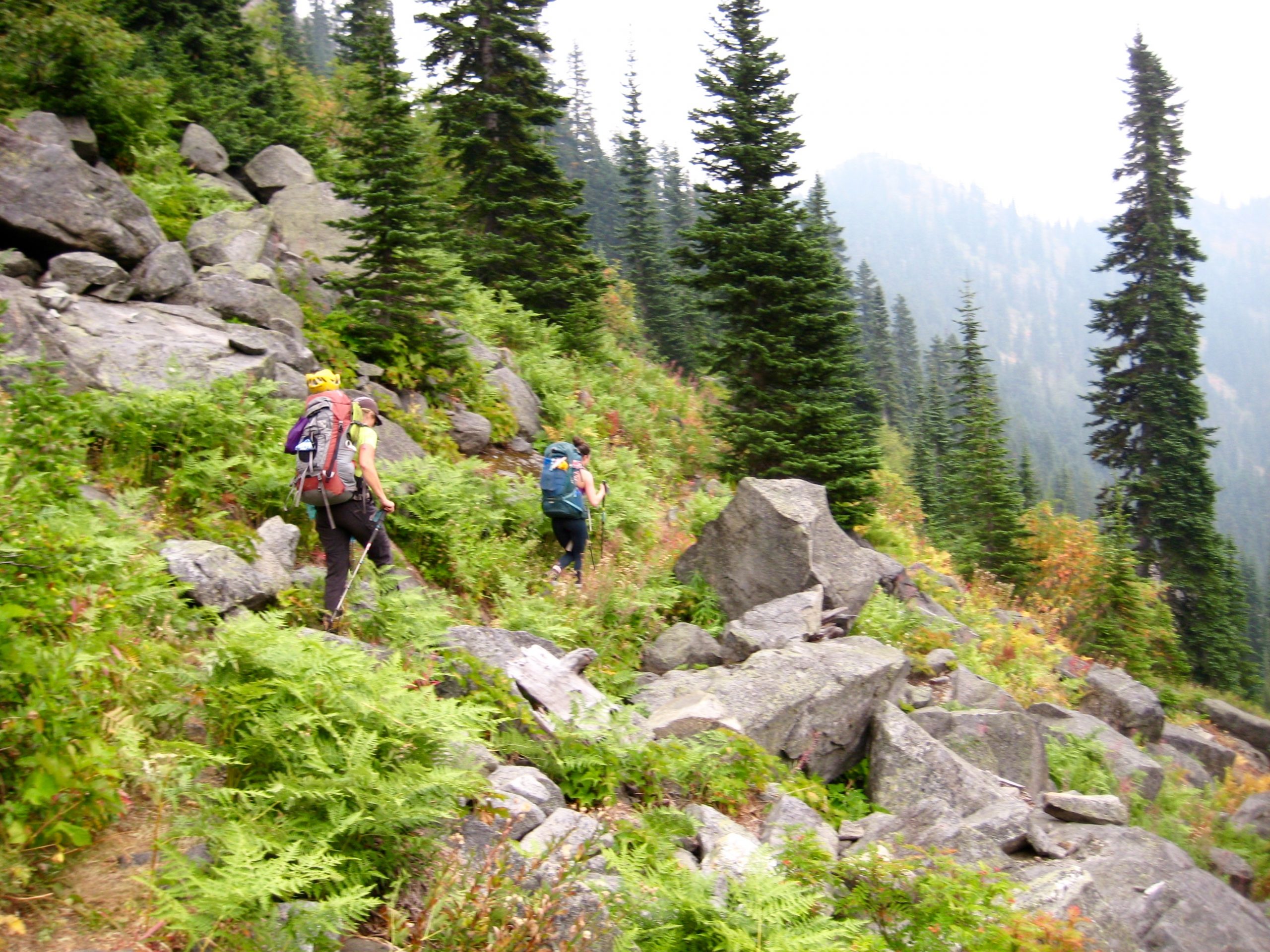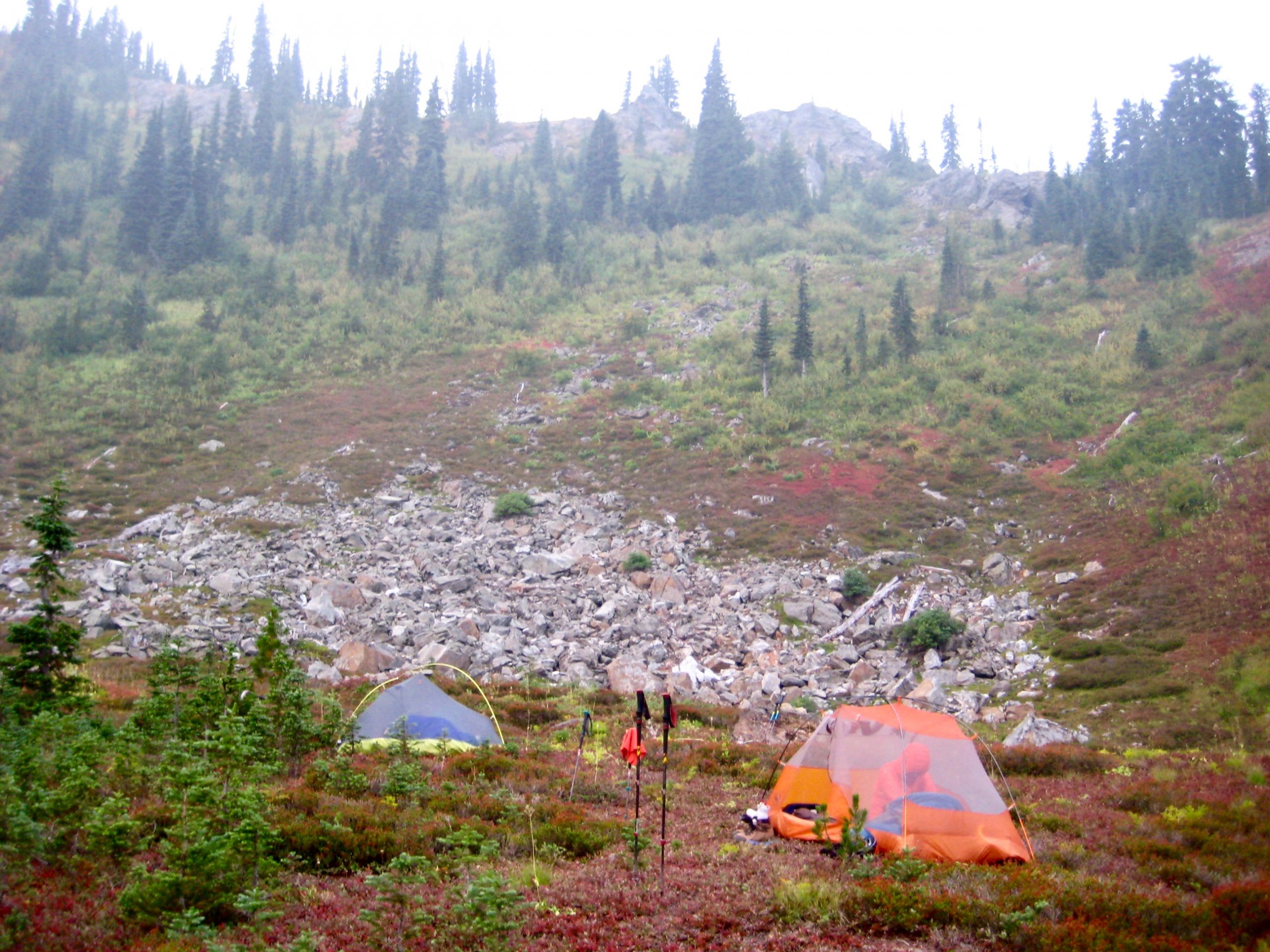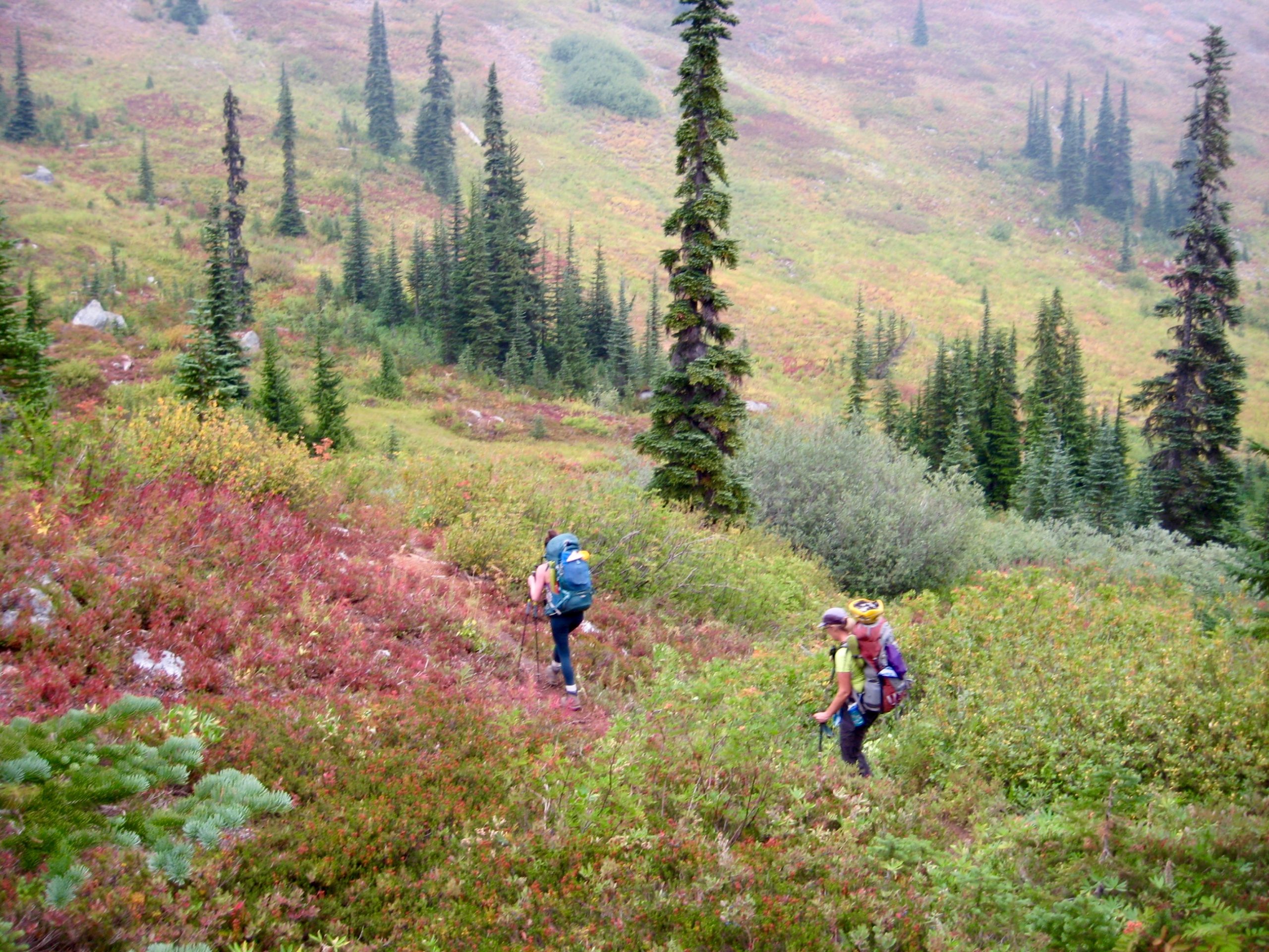 After a quick water stop at Lower Doelle Lake (6.8 hours from Camp 1), we continued down to Doughgod Meadow on an overgrown trail.  Autumn color was starting to tinge the vegetation here, and the huckleberries were deliciously ripe.
