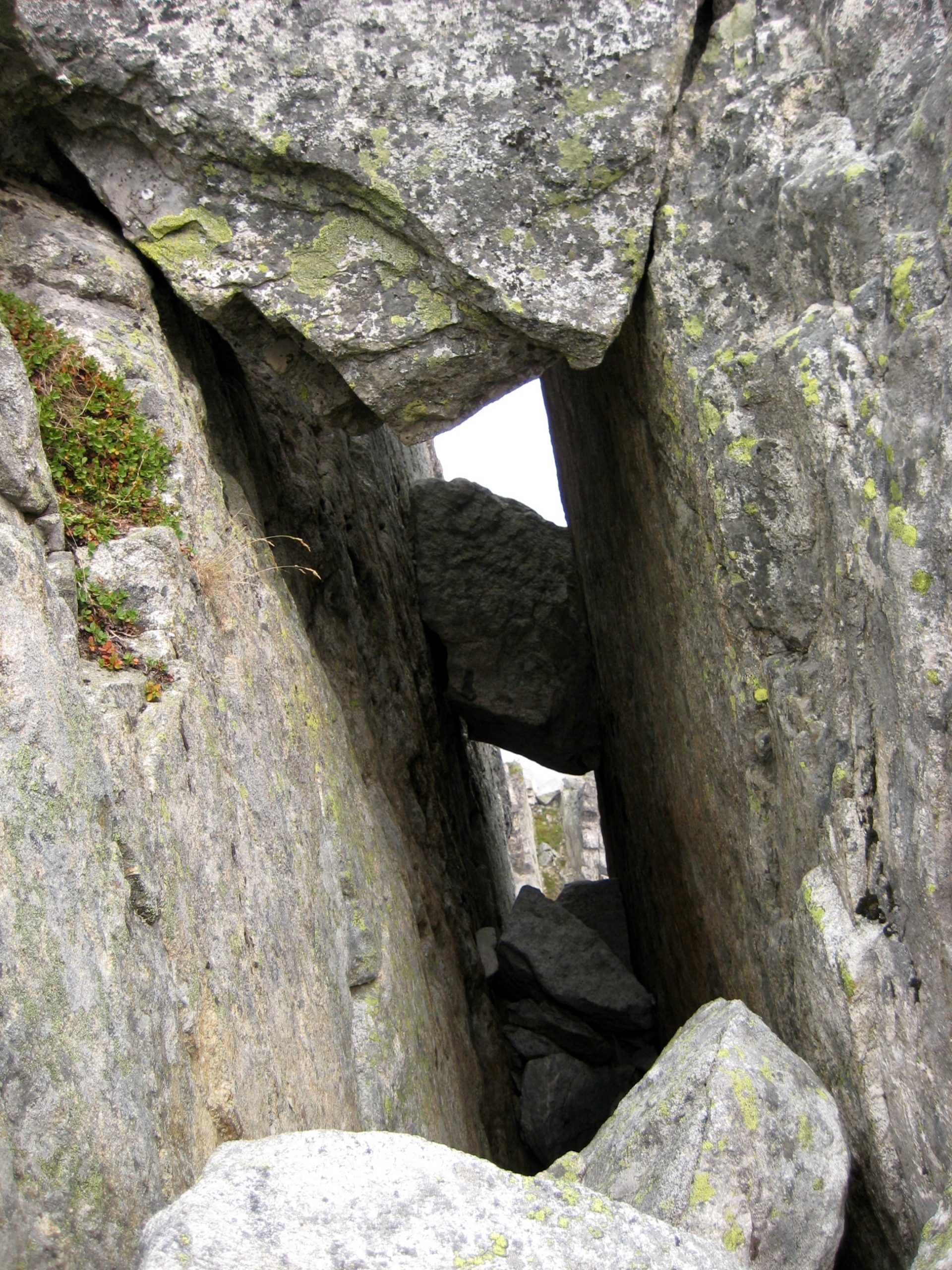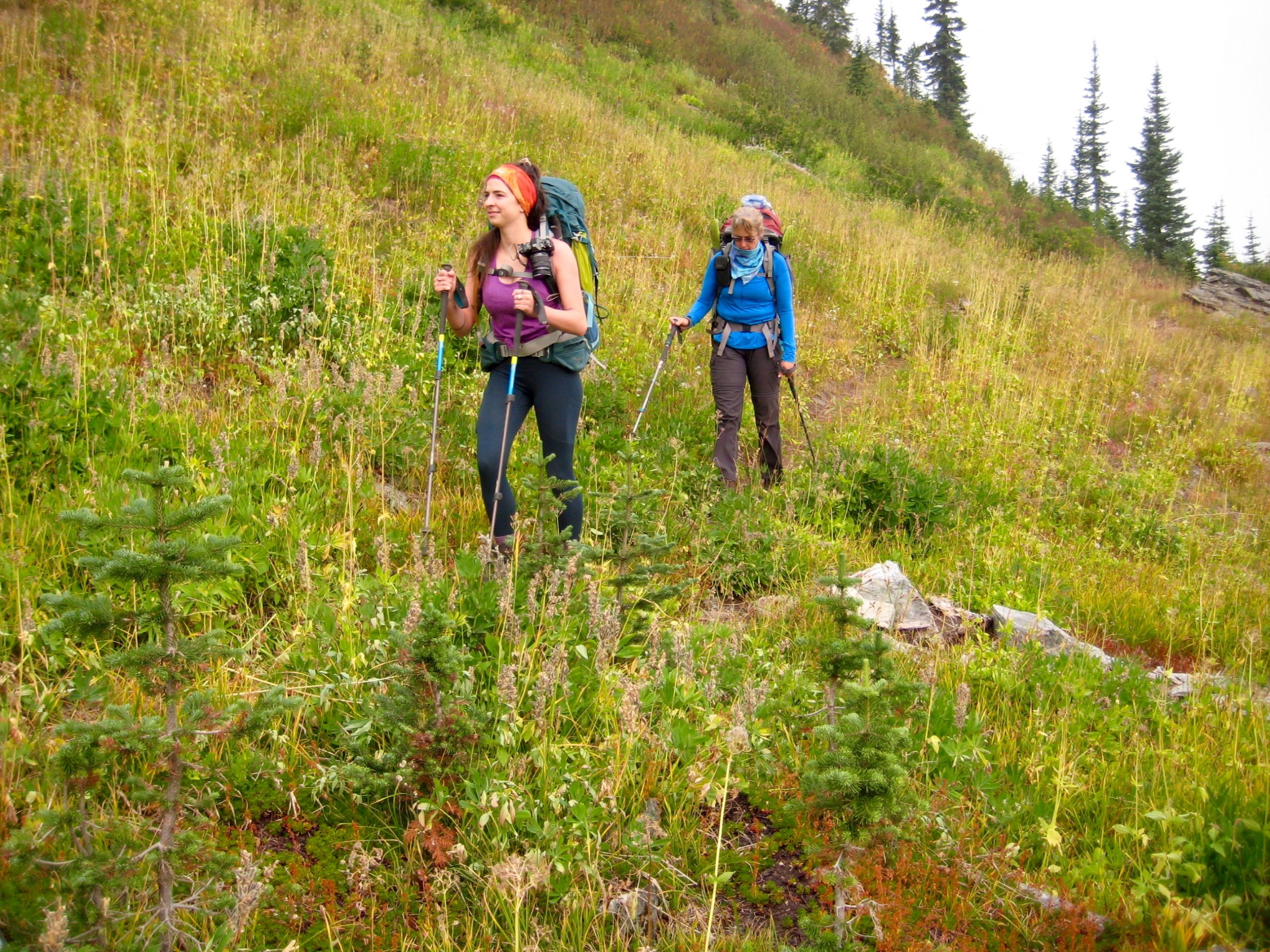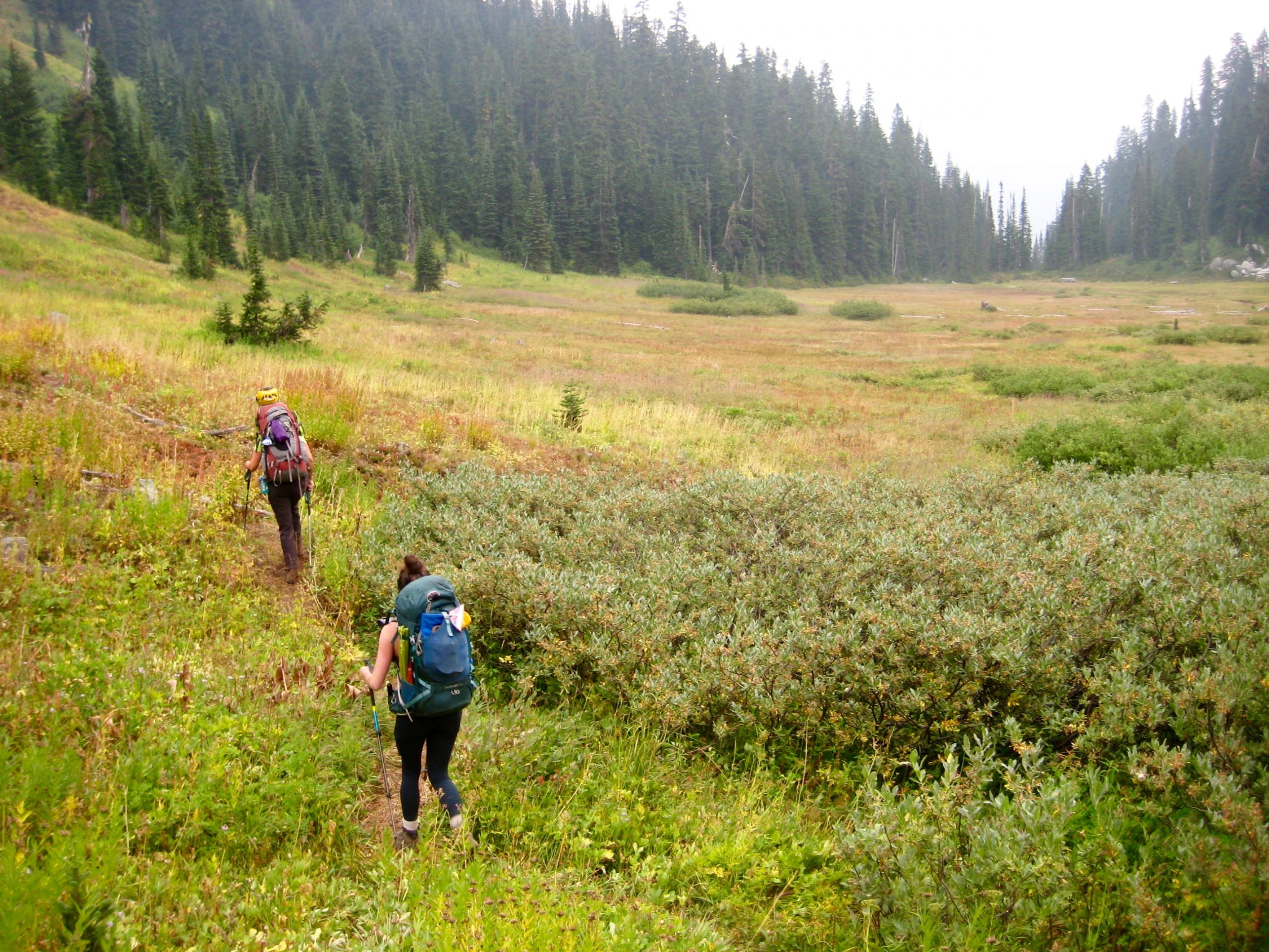 After a quick water stop at Lower Doelle Lake (6.8 hours from Camp 1), we continued down to Doughgod Meadow on an overgrown trail.  Autumn color was starting to tinge the vegetation here, and the huckleberries were deliciously ripe.