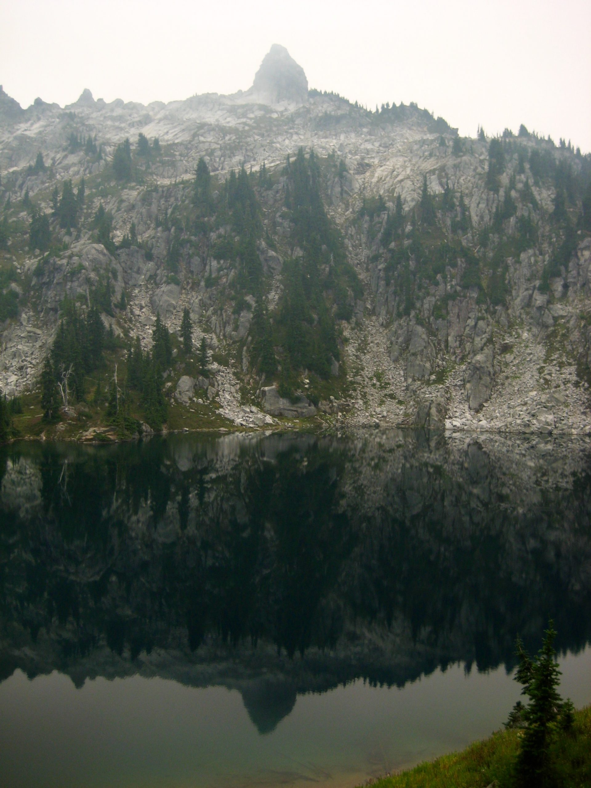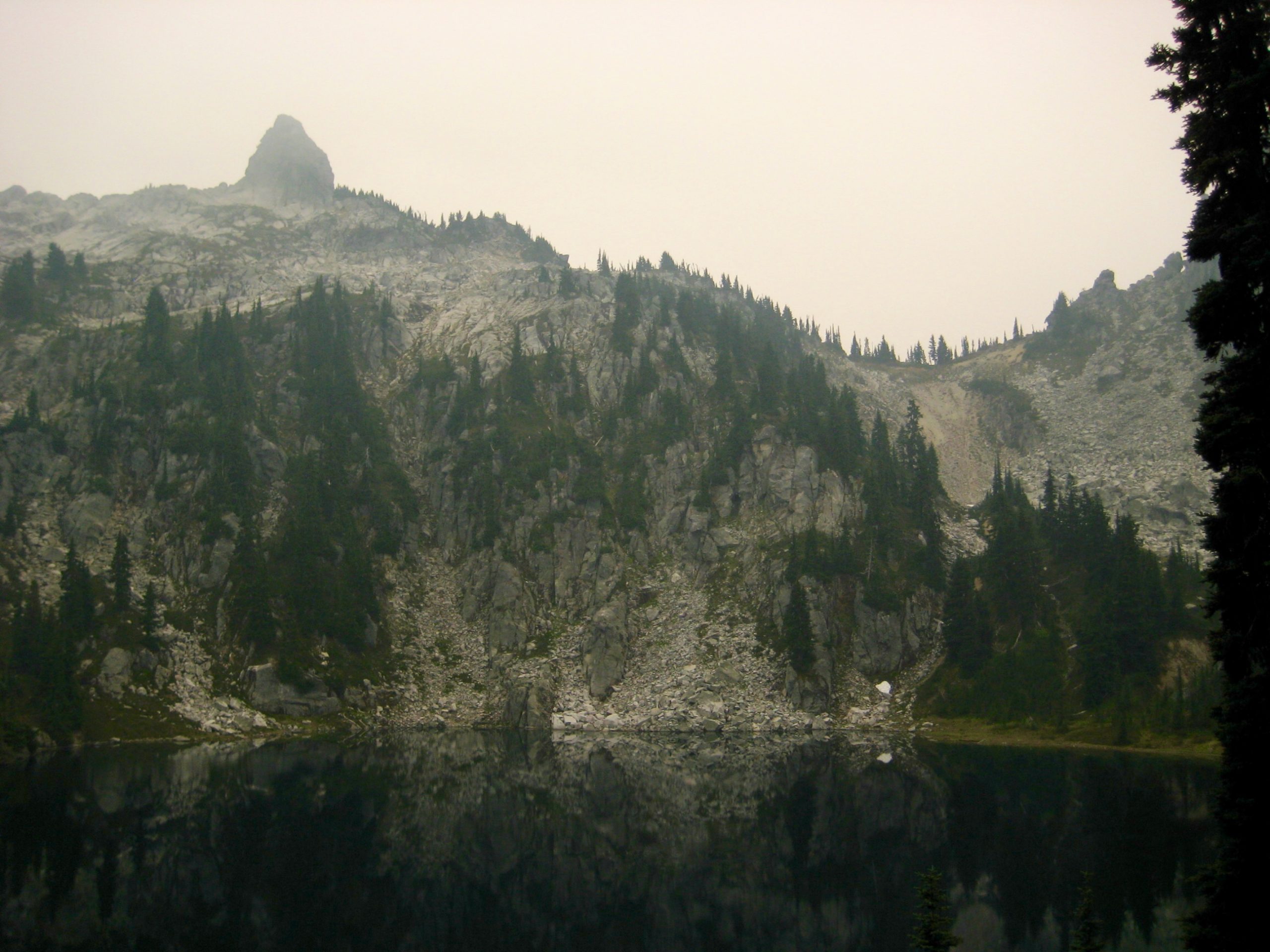Feeling refreshed, we returned to our backpacks (2.2 hours RT) and hurried down-valley.  We reached the Whitepine Creek Trailhead at 5:00pm (8.0 hours + 1600 feet from Camp 2).  Jim A and Sarah B were waiting there with Eileen, ready to whisk us back to our car at Stevens Pass.  Their willingness to provide bail-out service during this extremely smoky weekend adventure was greatly appreciated!