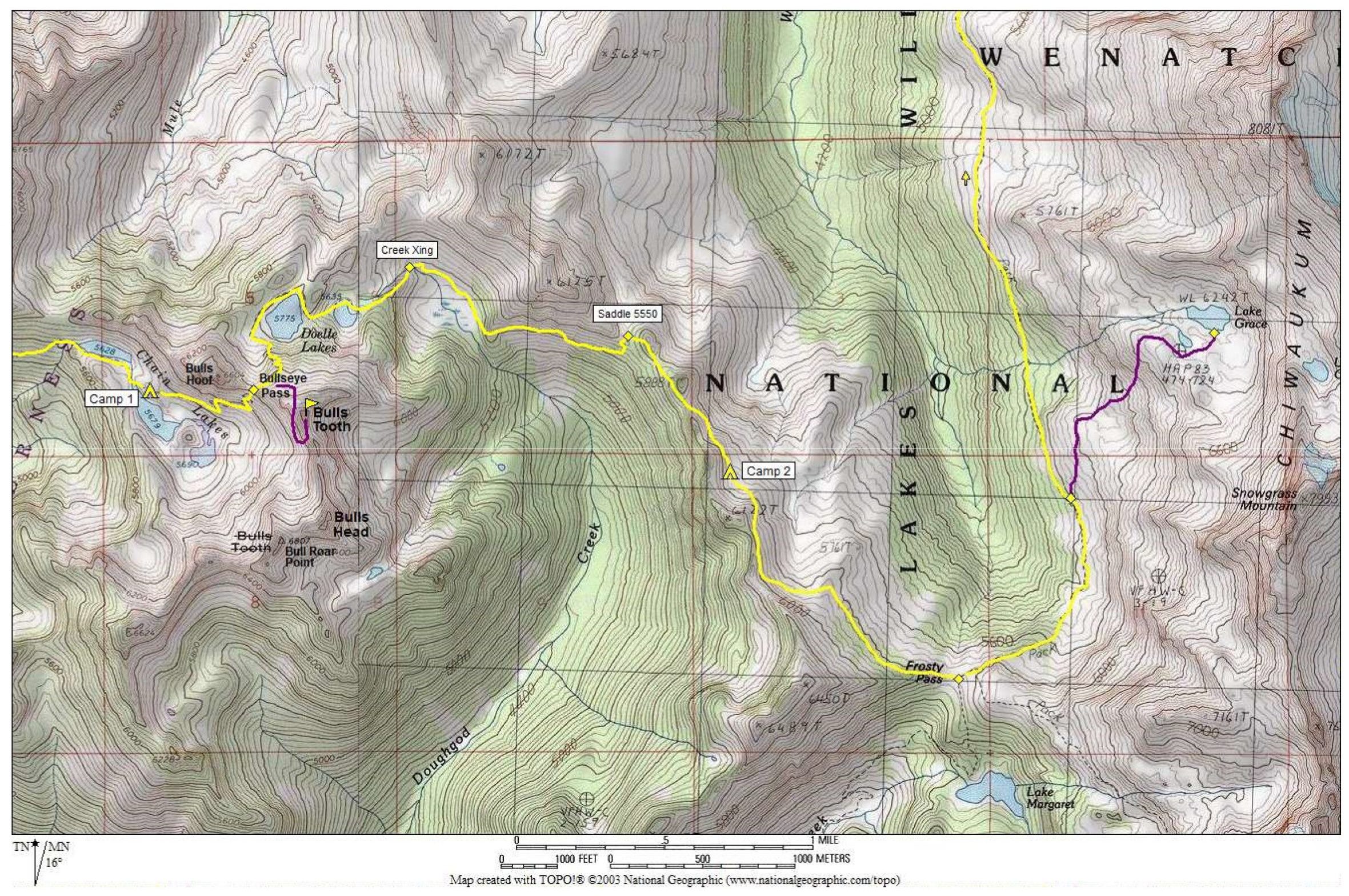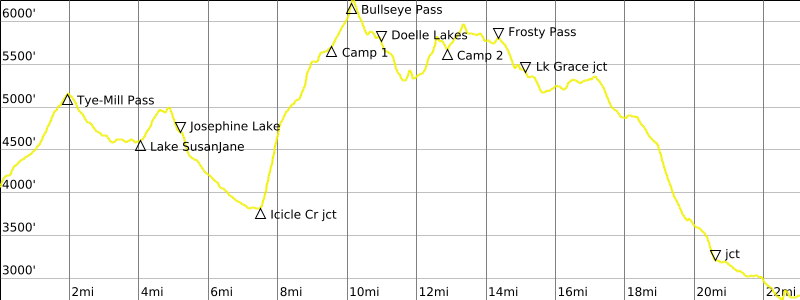 • Bullseye Pass (6200-foot trail pass between Chain Lakes and Doelle Lakes)