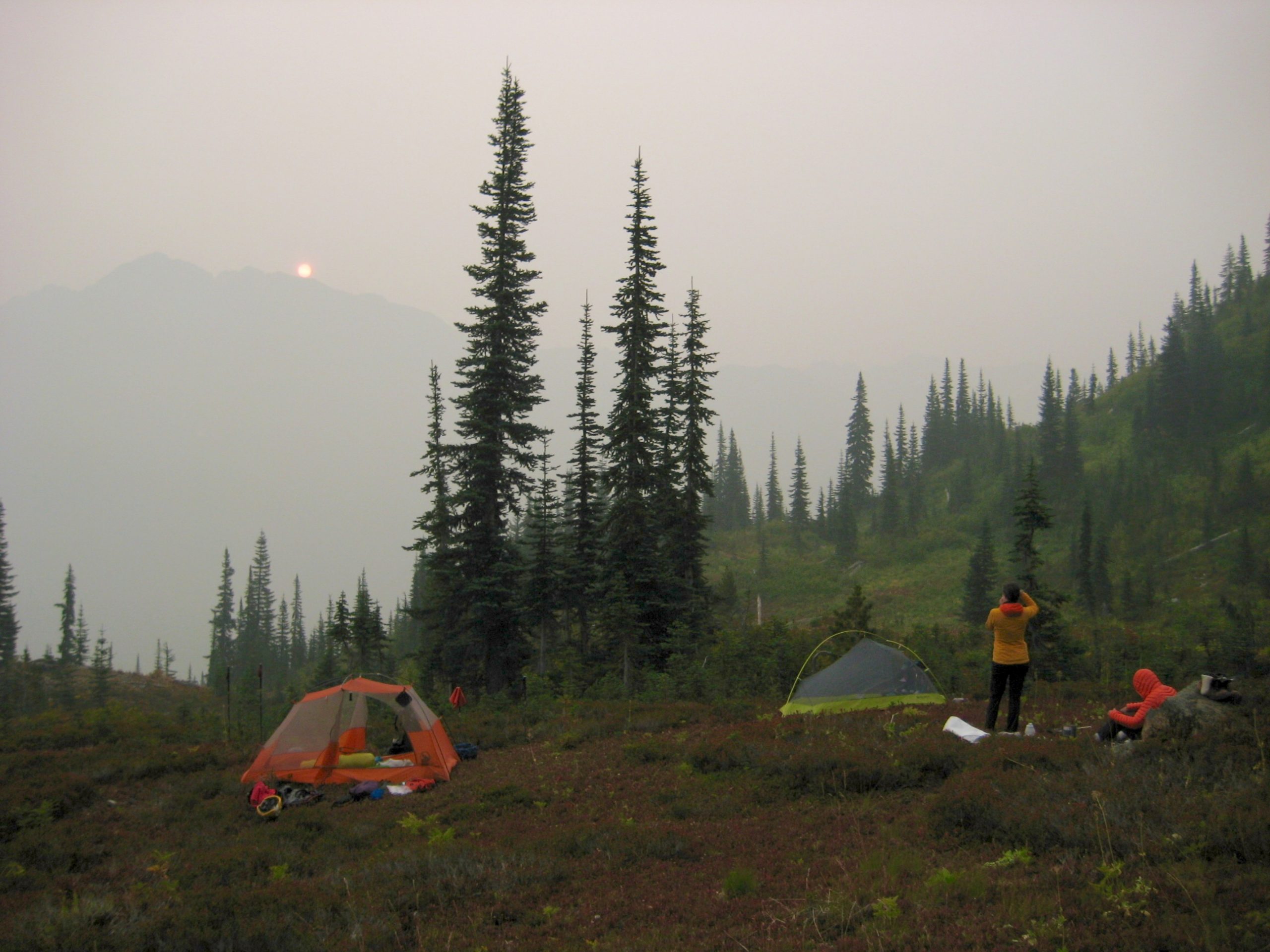 Our original intent was to reach Frosty Pass today; descend to Icicle Creek and hike back up to Josephine Lake tomorrow; and finish at Stevens Pass the next day.  However, the eerie, smoke-induced twilight and declining air quality prompted us to recalculate once again.  We stopped in a small basin on the eastern side of the ridge and made camp shortly before 7:00pm (9.0 hours + 2000 feet from Camp 1).  Eileen then used a satellite texter to contact Jim A, our inveterate ground man, and arrange for a pickup at the Whitepine Creek Trailhead tomorrow.