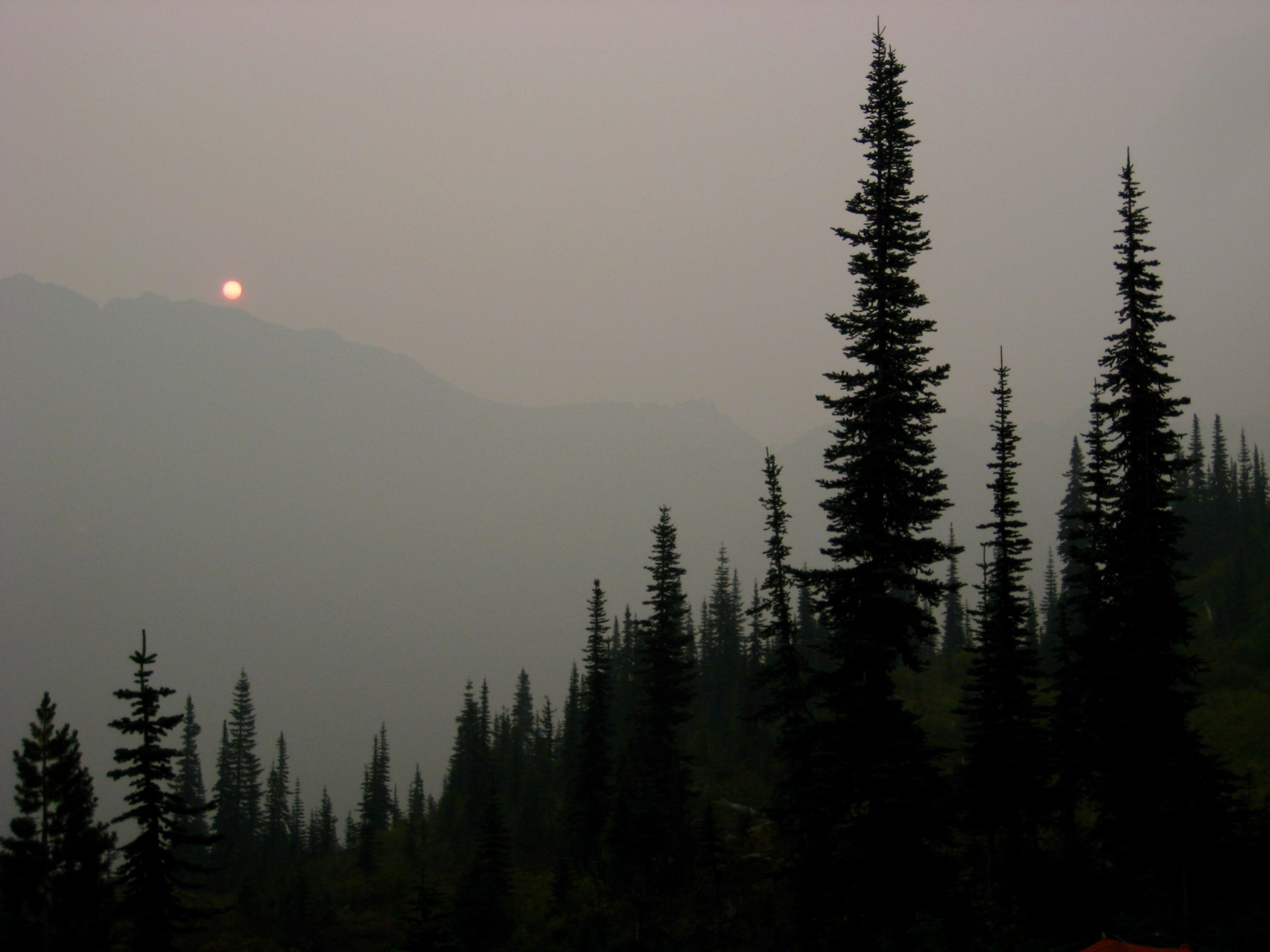 The night had again been calm, dry, and overcast.  In the morning, a Martianesque sun—barely visible through the dense smoke—rose over the ridge to our east.