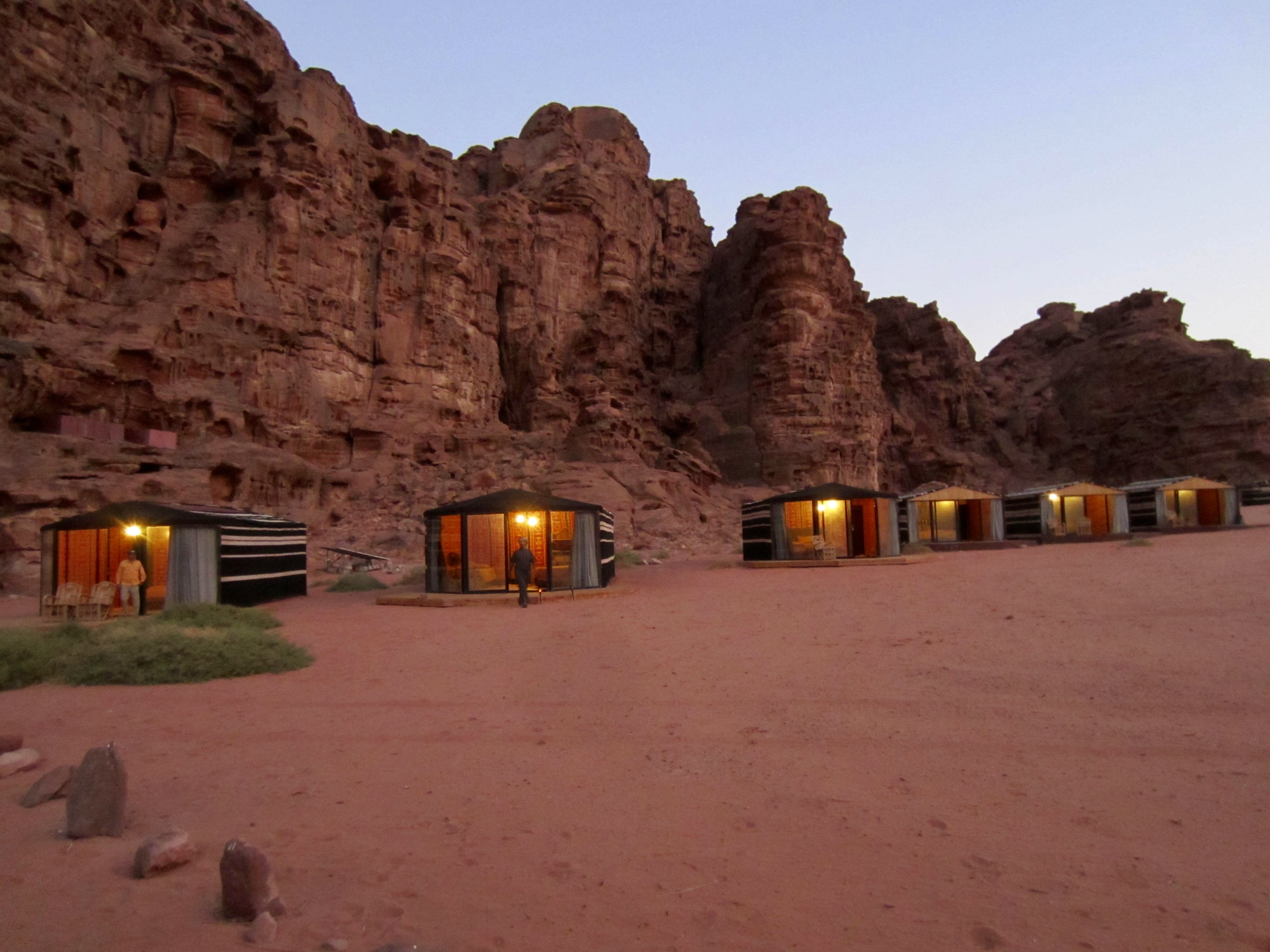 Our group stayed in a Bedouin desert camp consisting of six “luxury” cabins, several “basic” cabins, and a dining hall. Each night, we were served a dinner of marinated meat and vegetables cooked in the traditional zarb, or sand barbecue, method. This ancient method involves placing food in a cylindrical pit with wood embers and then covering it with sand for several hours. The result is visually impressive and very tasty.