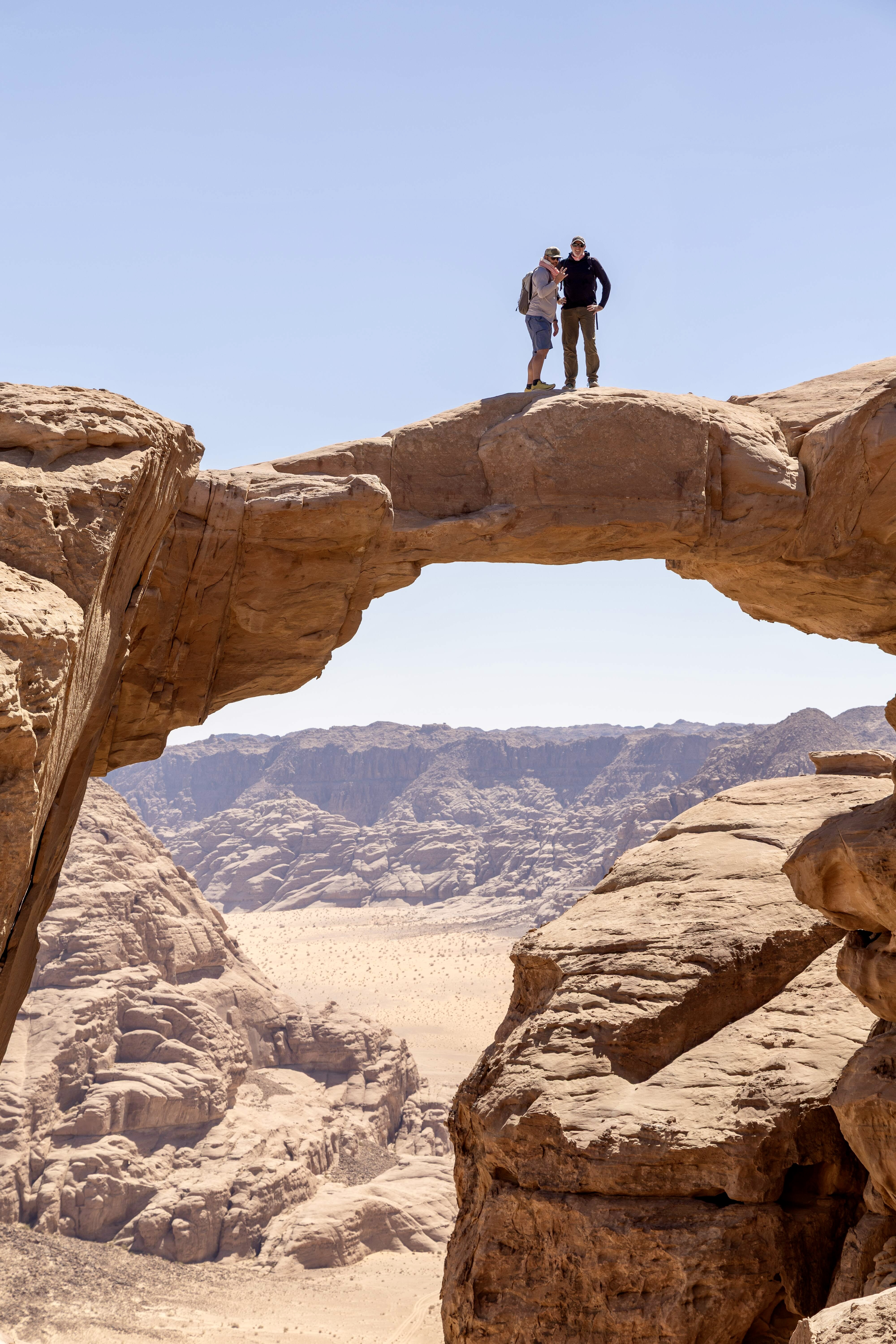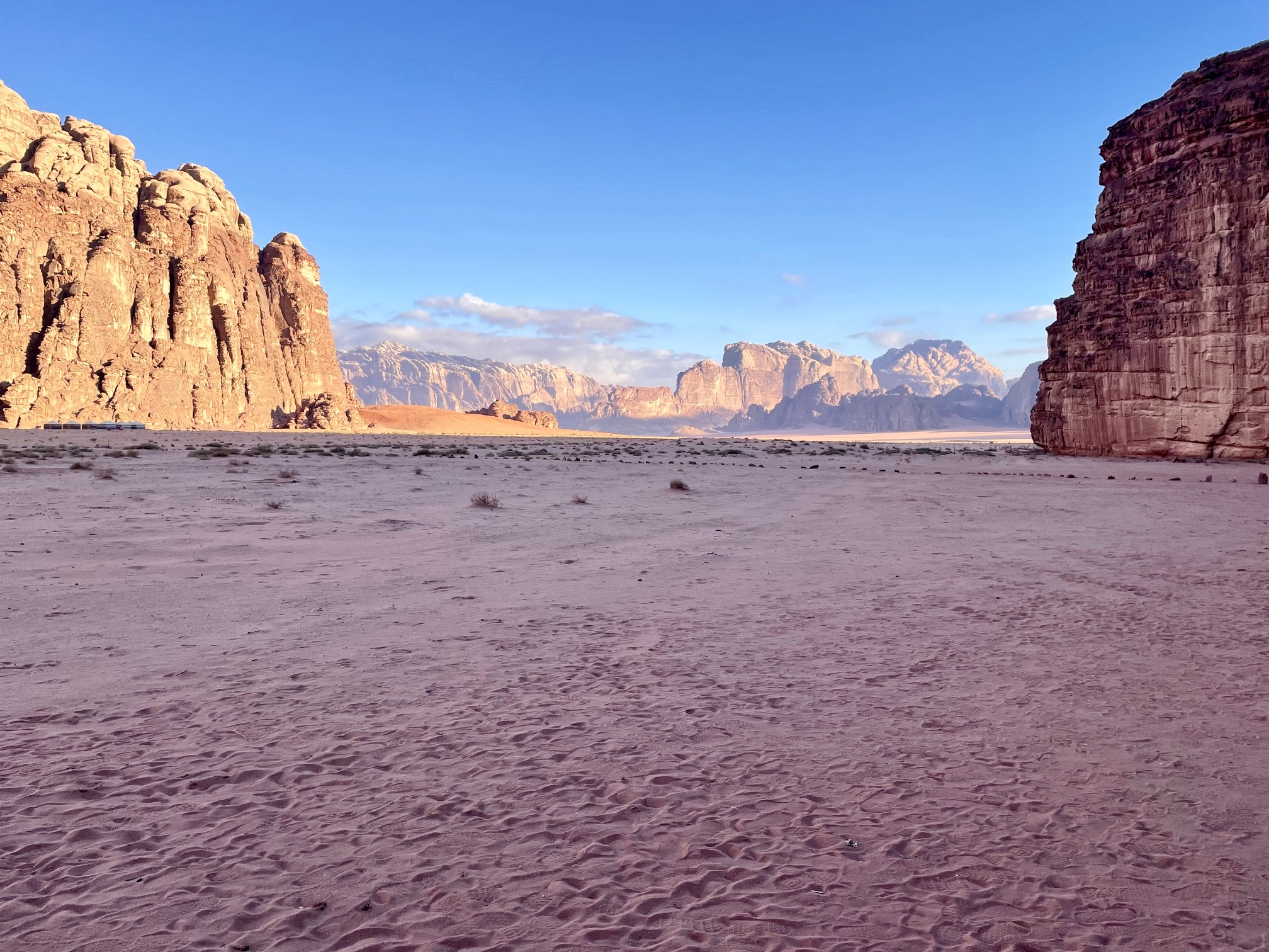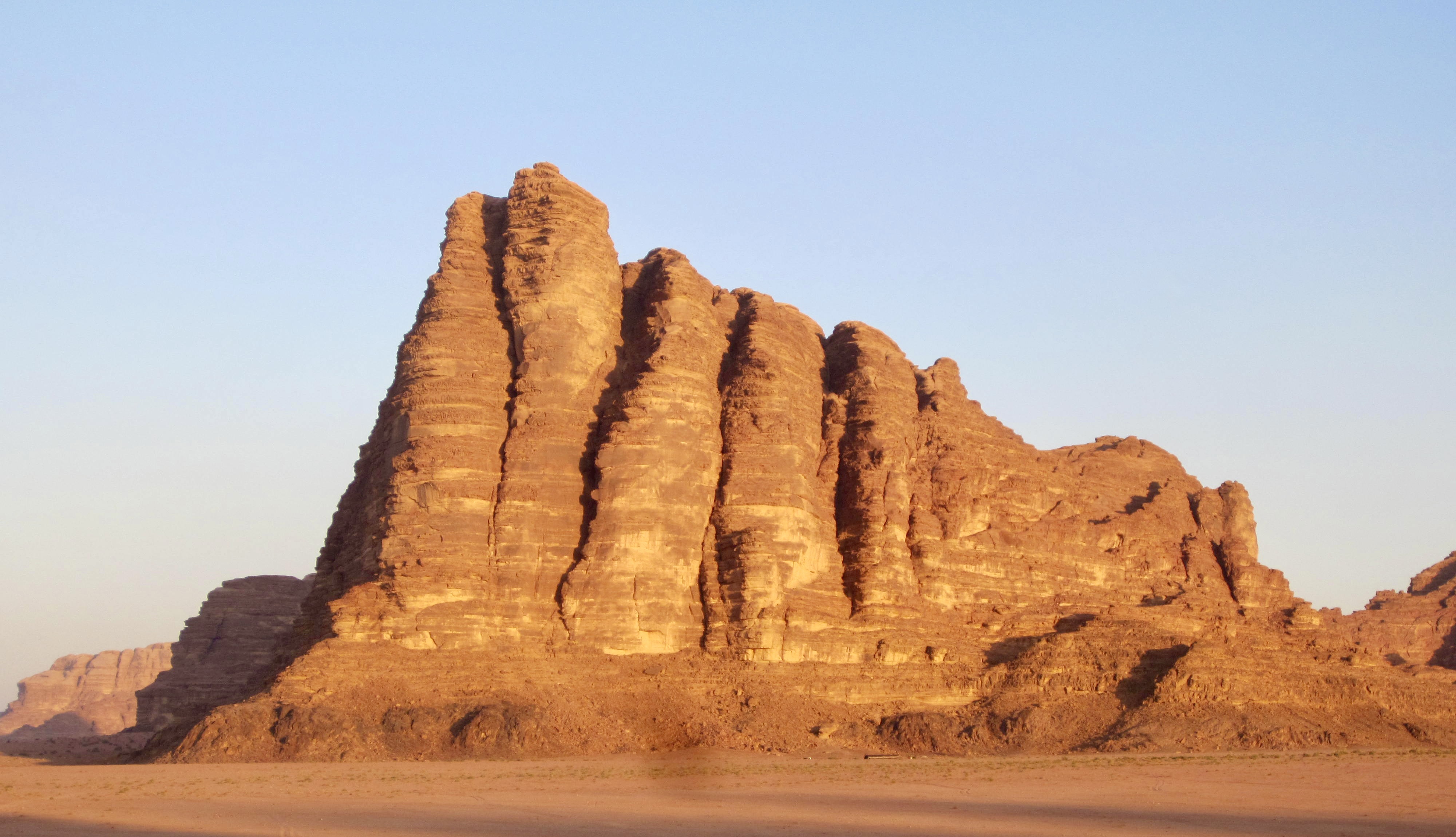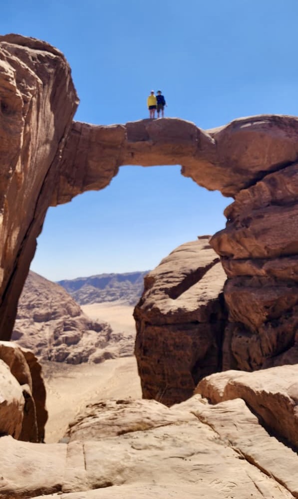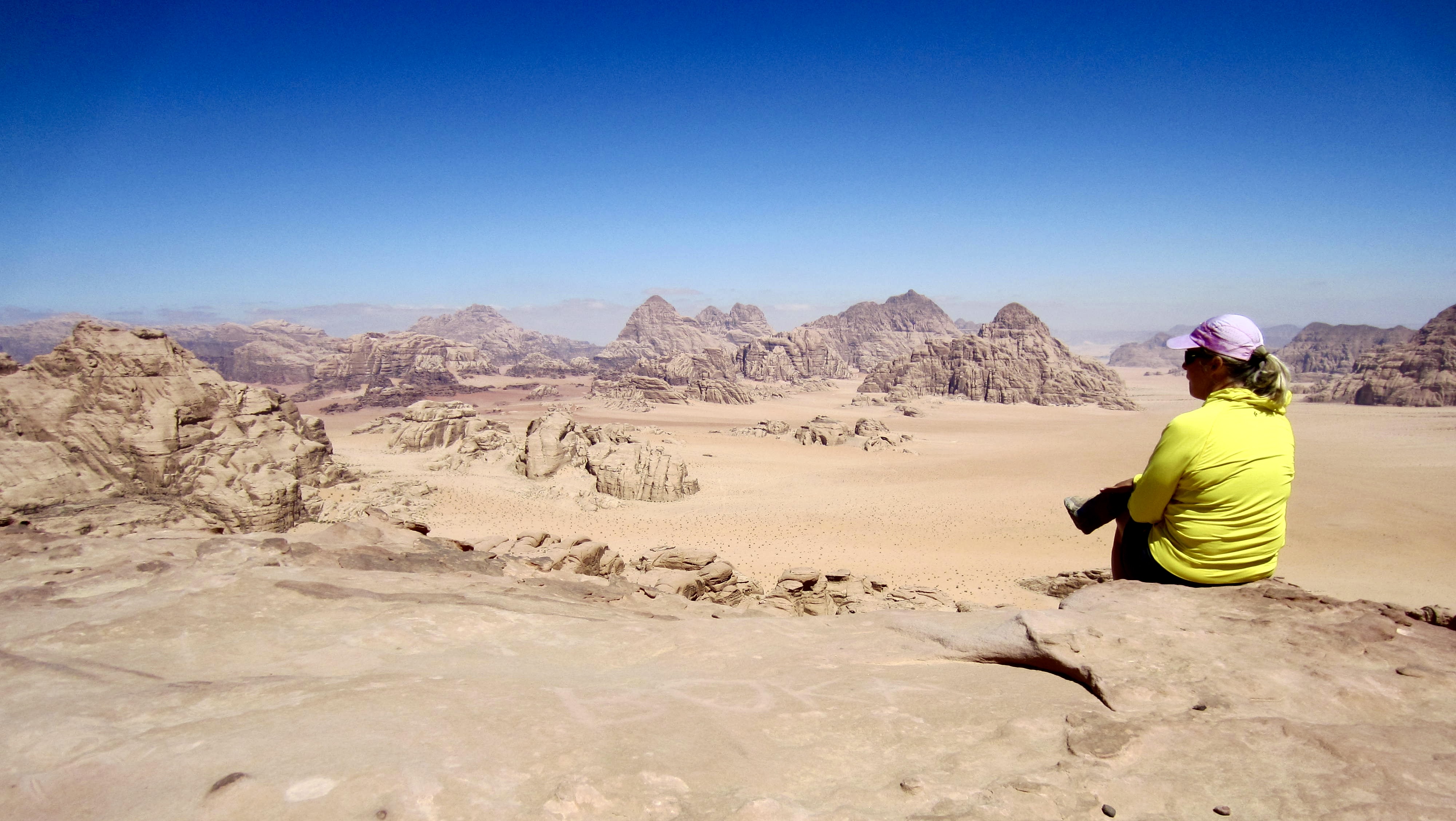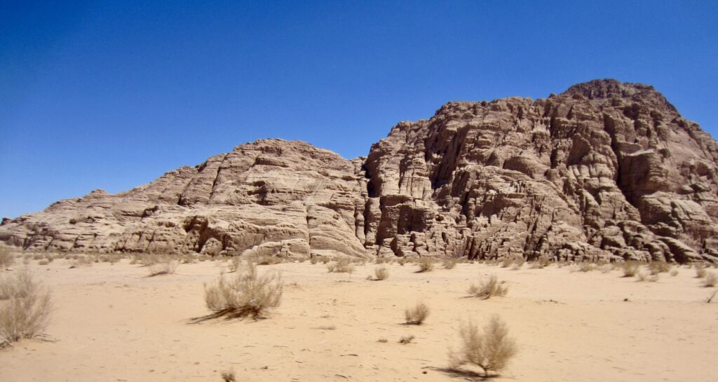 From the area around the arch, we obtained a great view of the surrounding plains and peaks of Wadi Rum. It has such an otherworldly appearance. The endless desert plain with the sandstone “icebergs” looks so much like a contrived movie set!