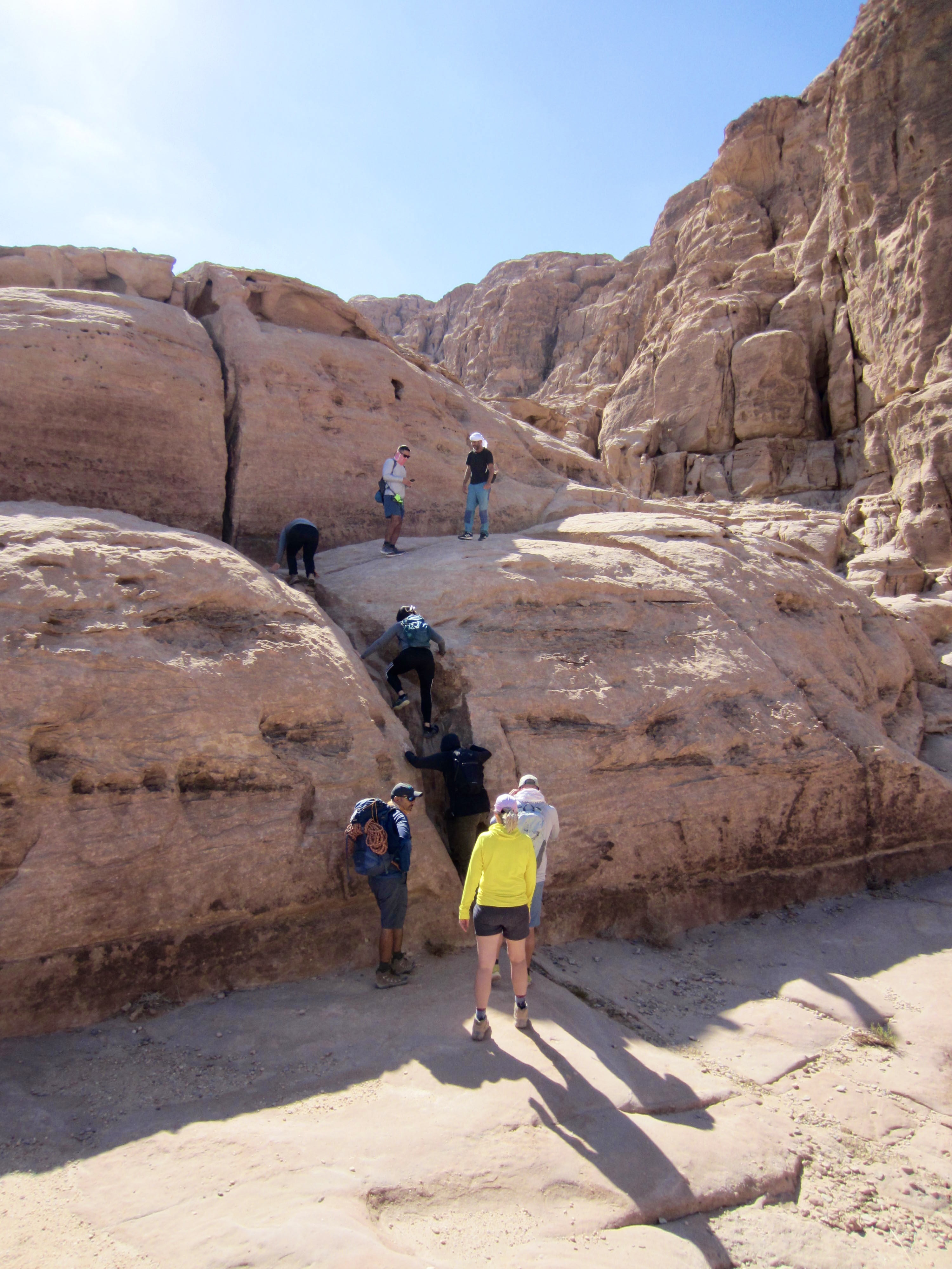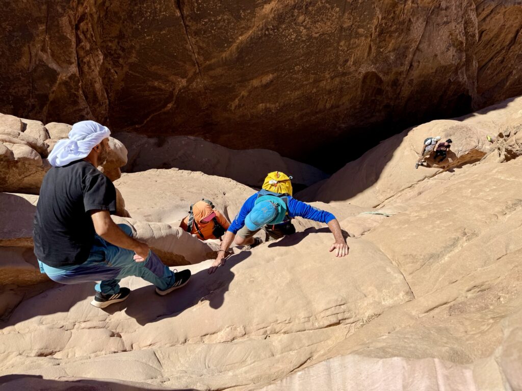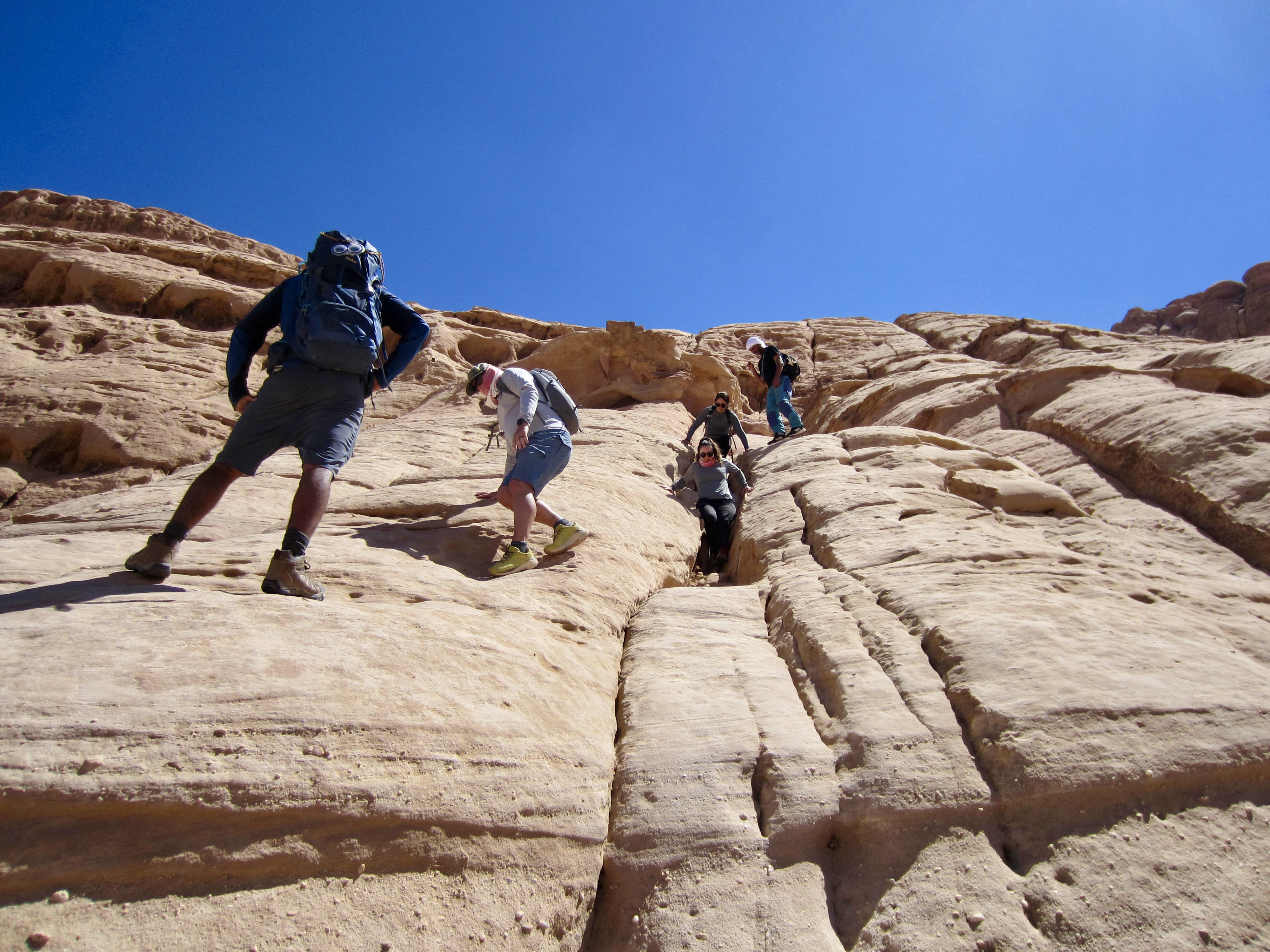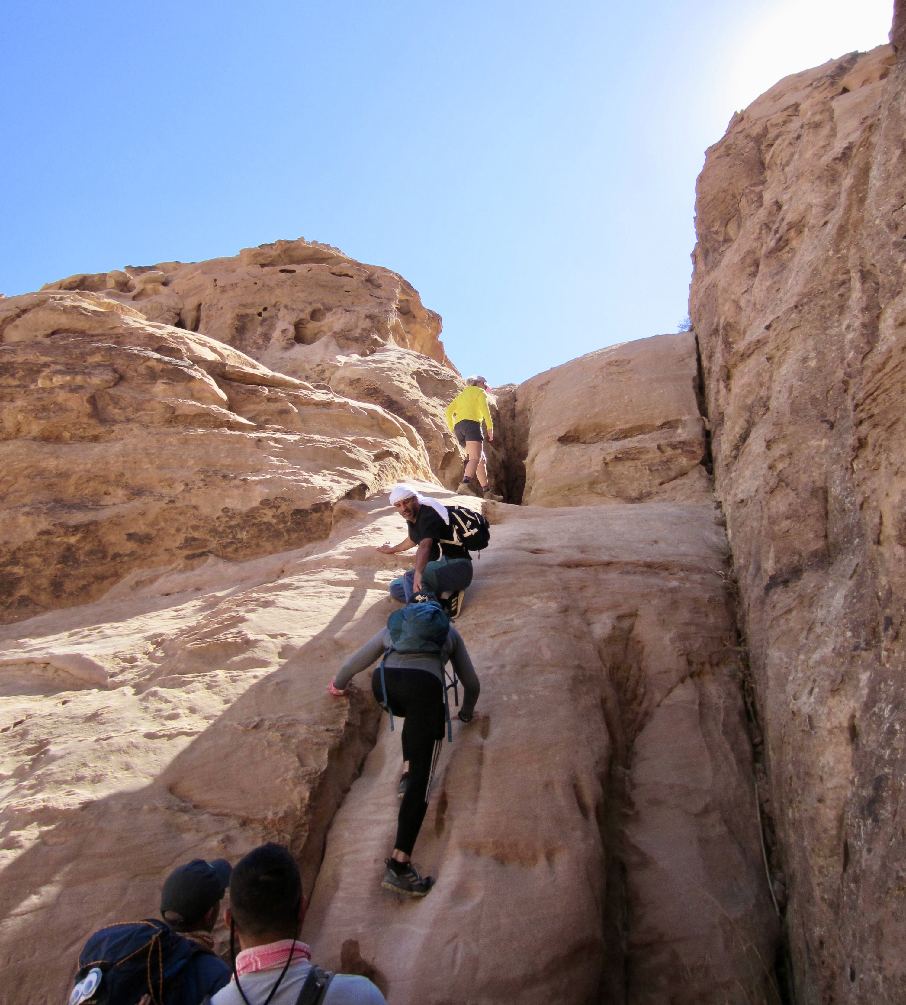 During our group’s stay in Wadi Rum, James and Mahmoud teamed up with Odai, a local climbing guide, to lead a scramble up Burdah (or Bardeh) Mountain. Seven of us clients—Brian, Edwin, Eileen, Elizabeth, Laura, Storm, and me—were excited to join the fun. Meanwhile, Brooke was leading the rest of our group on a camel ride.