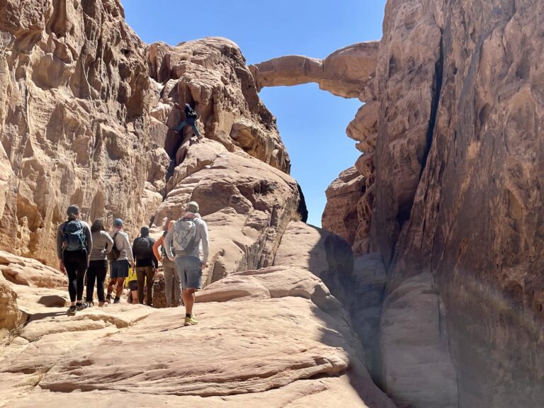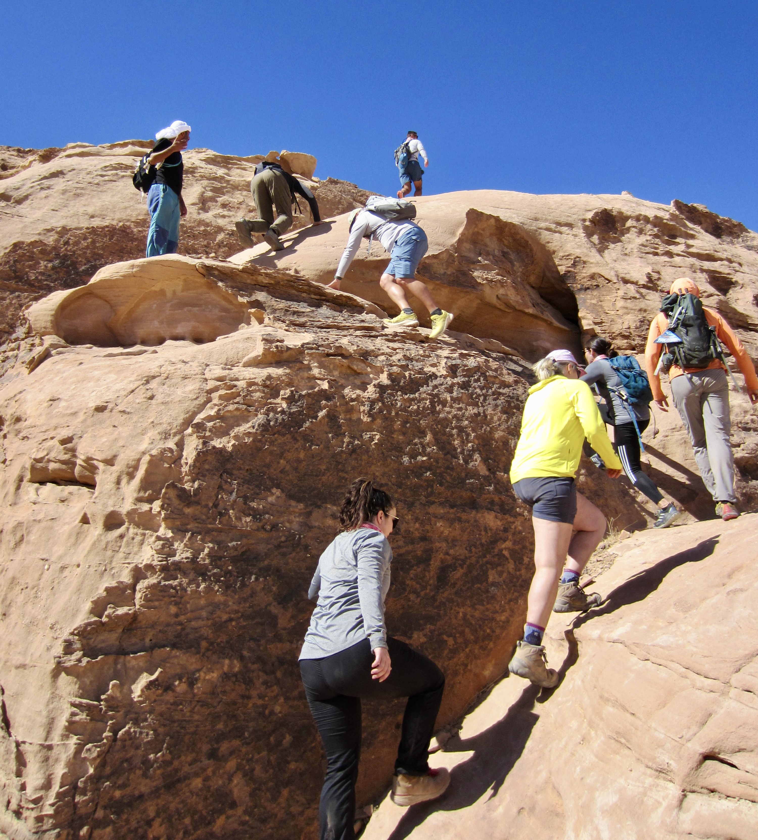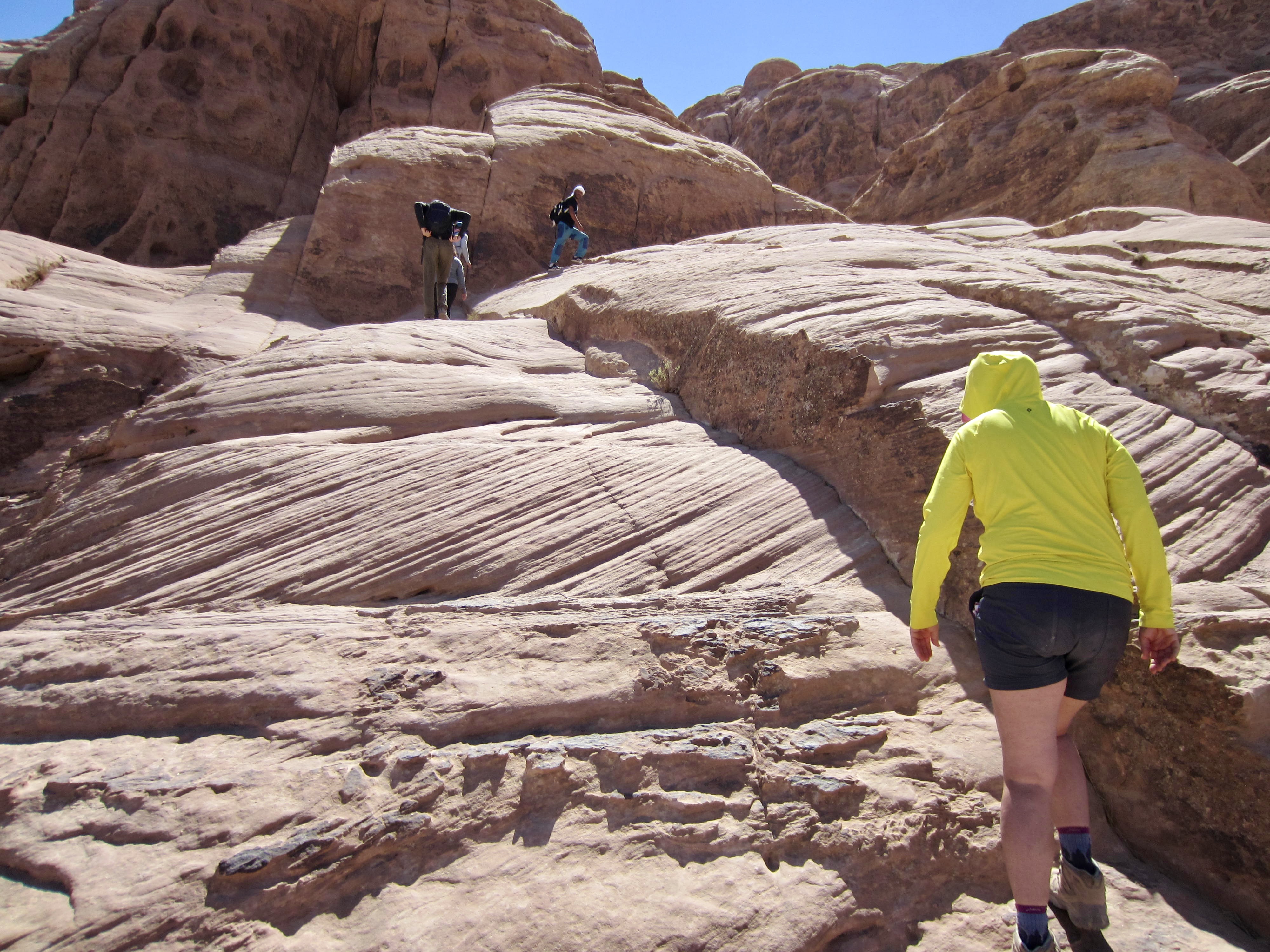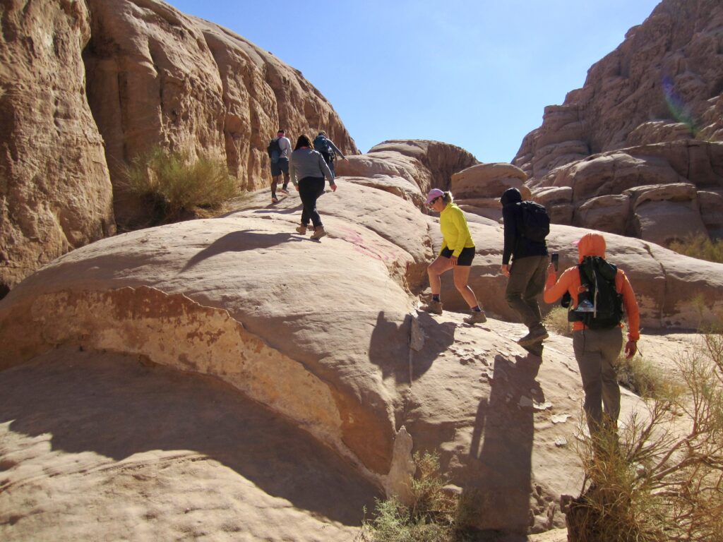 During our group’s stay in Wadi Rum, James and Mahmoud teamed up with Odai, a local climbing guide, to lead a scramble up Burdah (or Bardeh) Mountain. Seven of us clients—Brian, Edwin, Eileen, Elizabeth, Laura, Storm, and me—were excited to join the fun. Meanwhile, Brooke was leading the rest of our group on a camel ride.