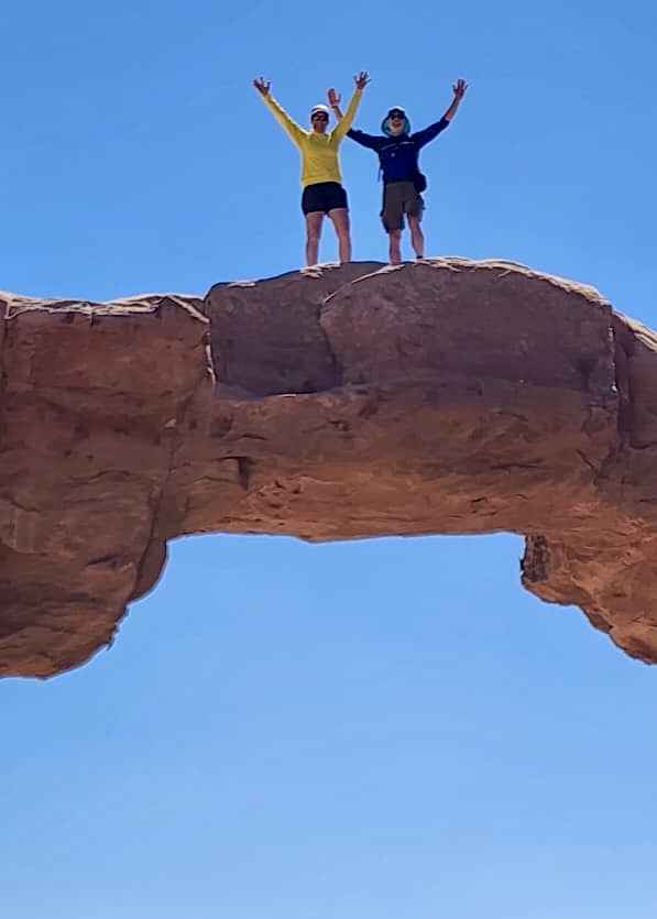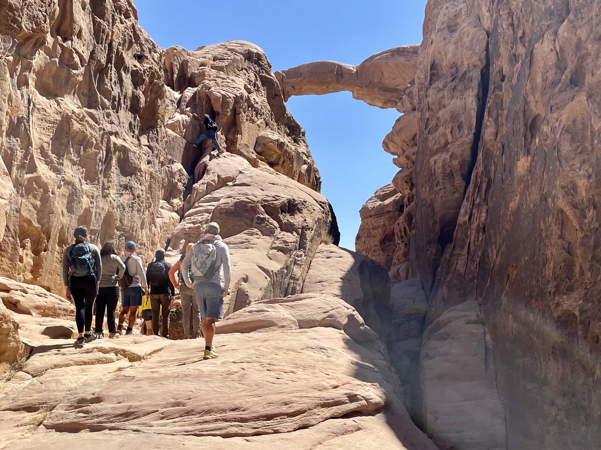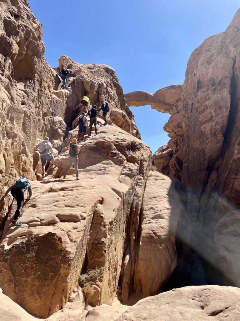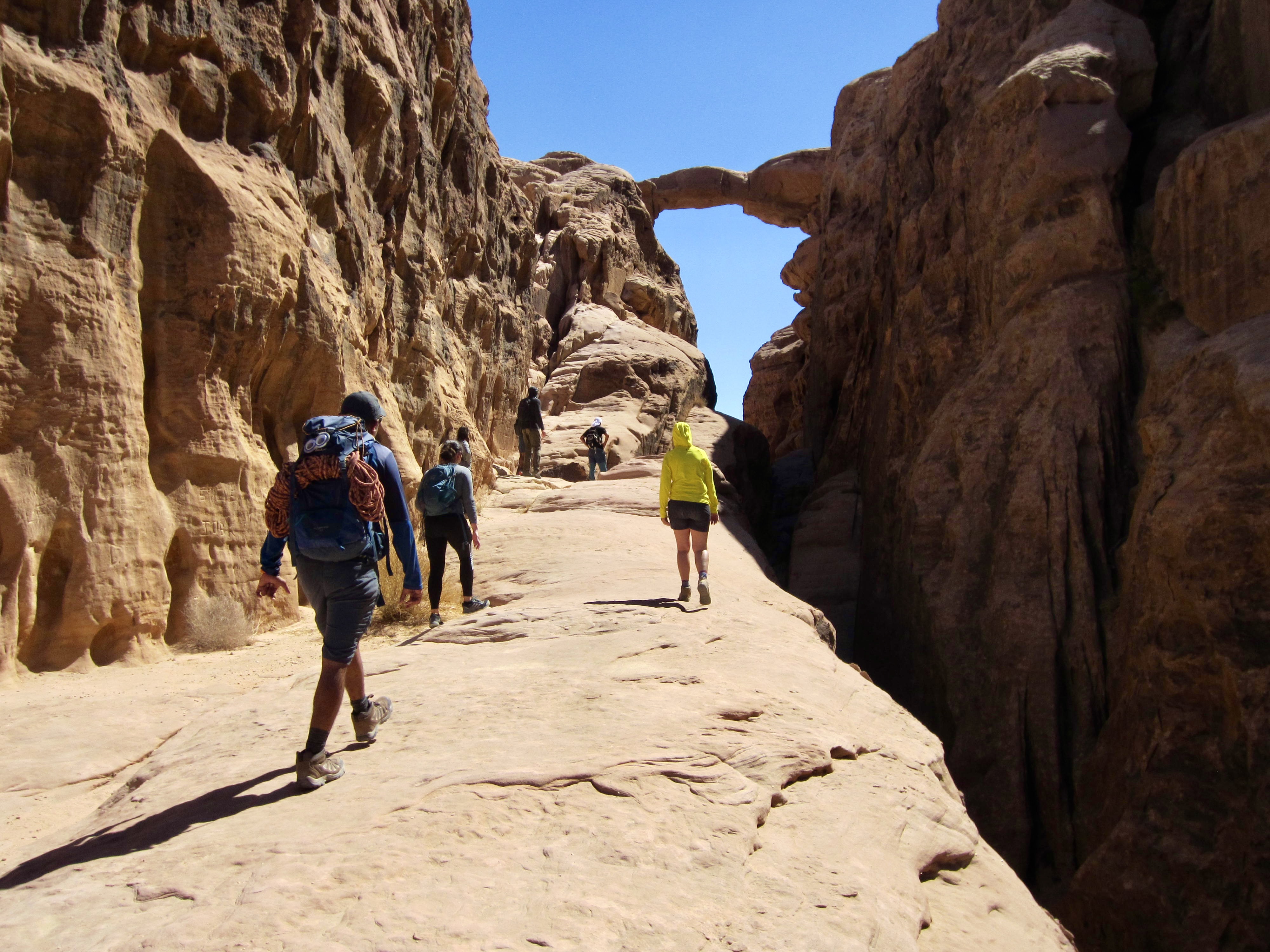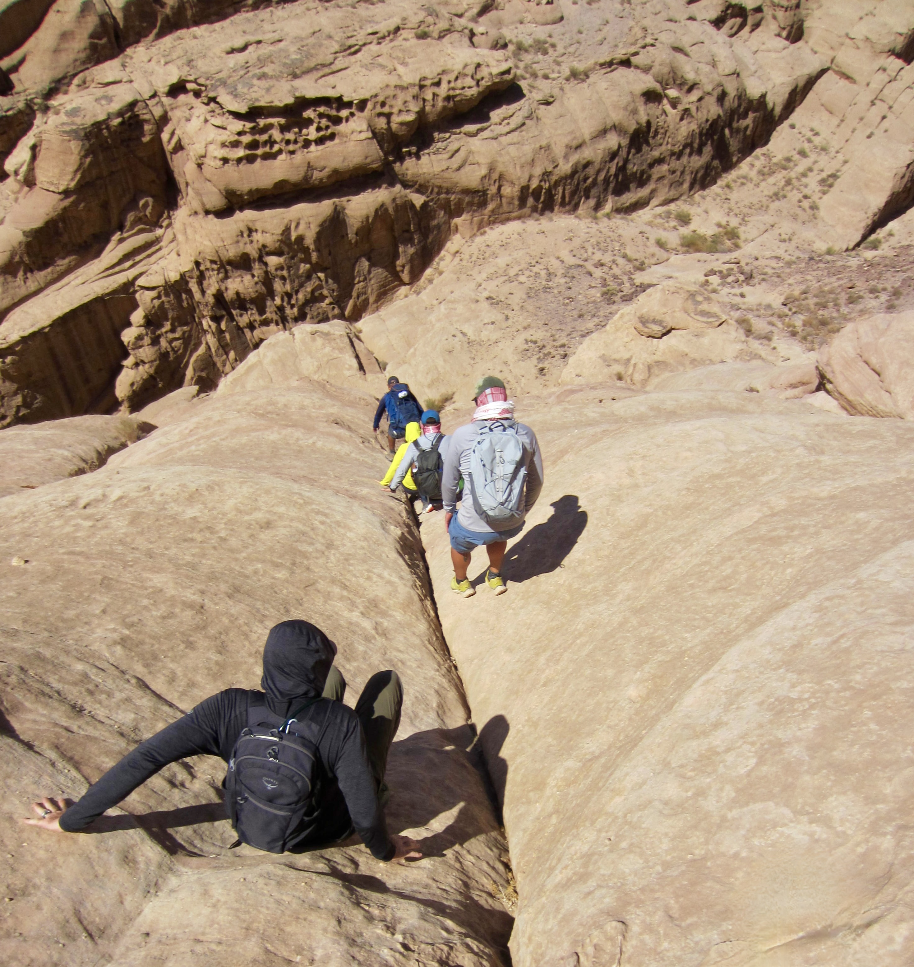 After a steady gain of nearly 800 feet / 250 meters, we gained a look at our destination: the Burdah (or Bardeh) Bridge. This natural sandstone arch provides a dramatic photo opportunity for anyone making the ascent. A short but fairly exposed Class 3 scramble took us to the top of the arch.