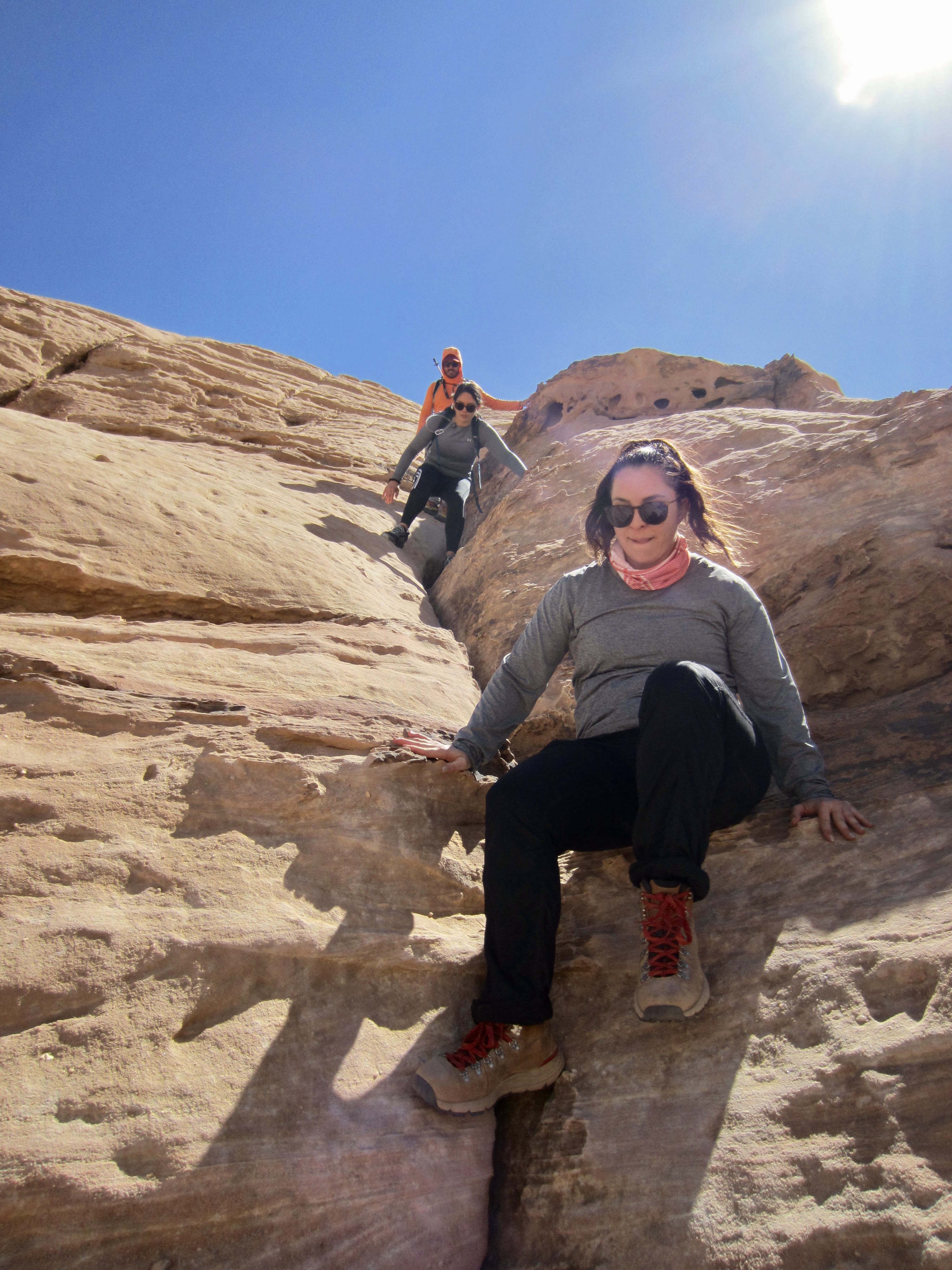 Odai led us on a convoluted route up a major cleft in the northern side of the mountain. His chosen route involved lots of Class 2 and 3 scrambling up ramps, ribs, cracks, and chimneys. The sandstone was solid and grippy and totally fun!