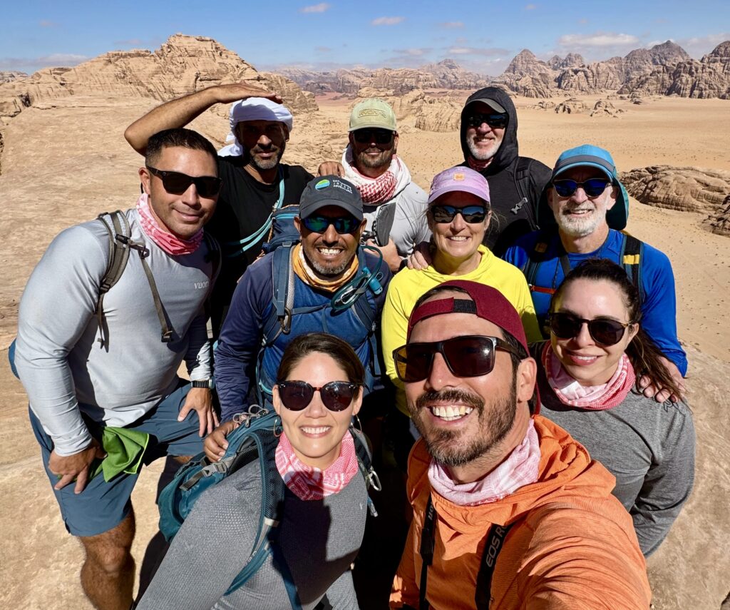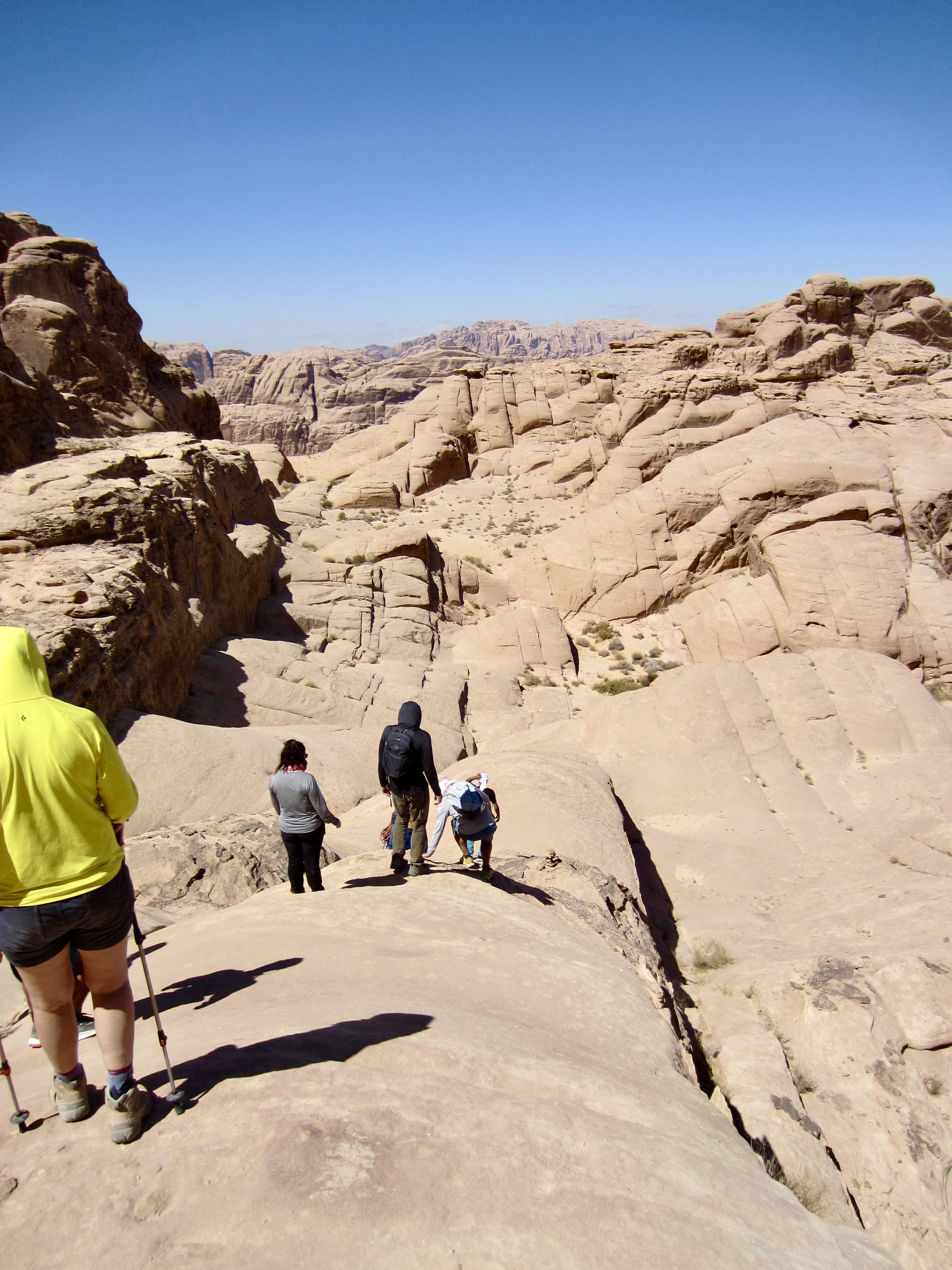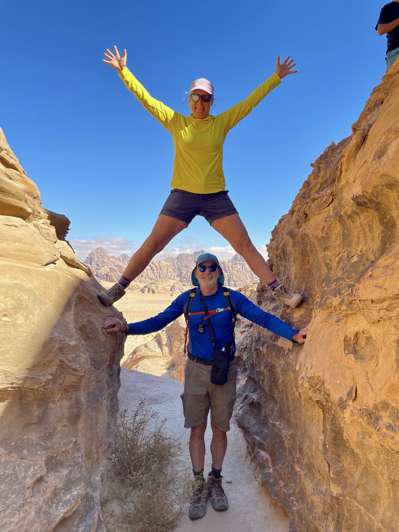 During our time in Jordan, Eileen and I spent two nights in Wadi Rum with our 15-person trekking group, which included executive guides Brooke and James of Adventures Beyond (provisional name); regional guide Mahmoud of Experience Jordan Adventures; and ten other clients: Barbara, Brian, Courtney, Edwin, Elizabeth, Josh, Laura, Melissa, Stephen, and Storm.