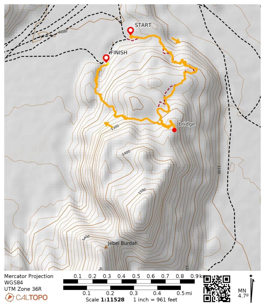 Starting Point: Northern base of Burdah Mountain (Elev. 3630 feet / 1100 meters)