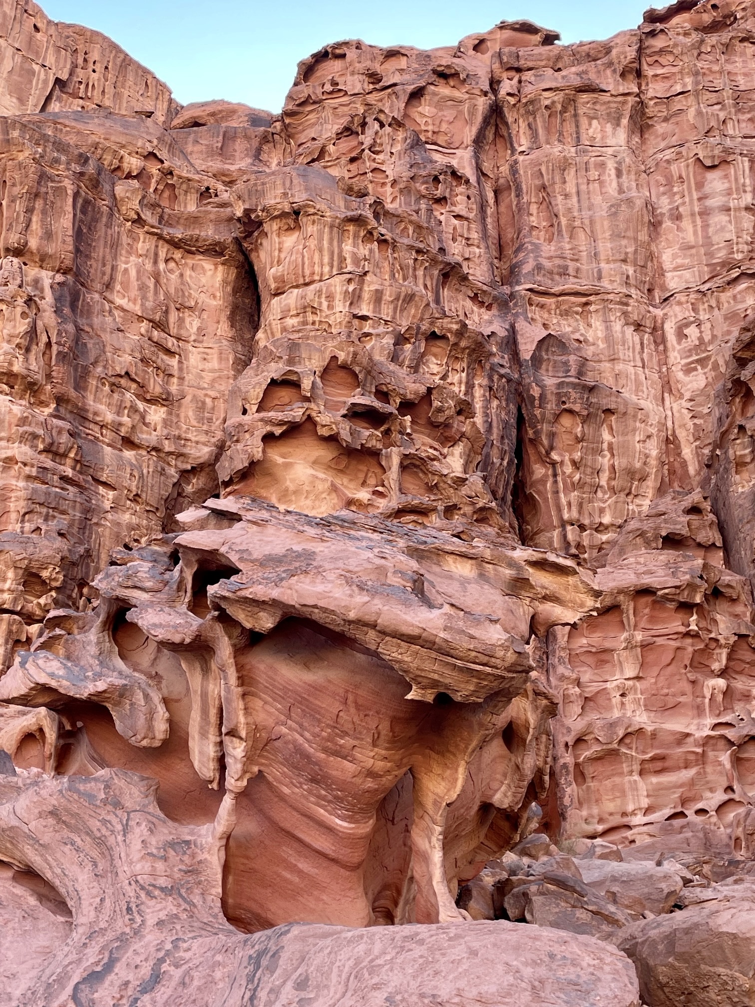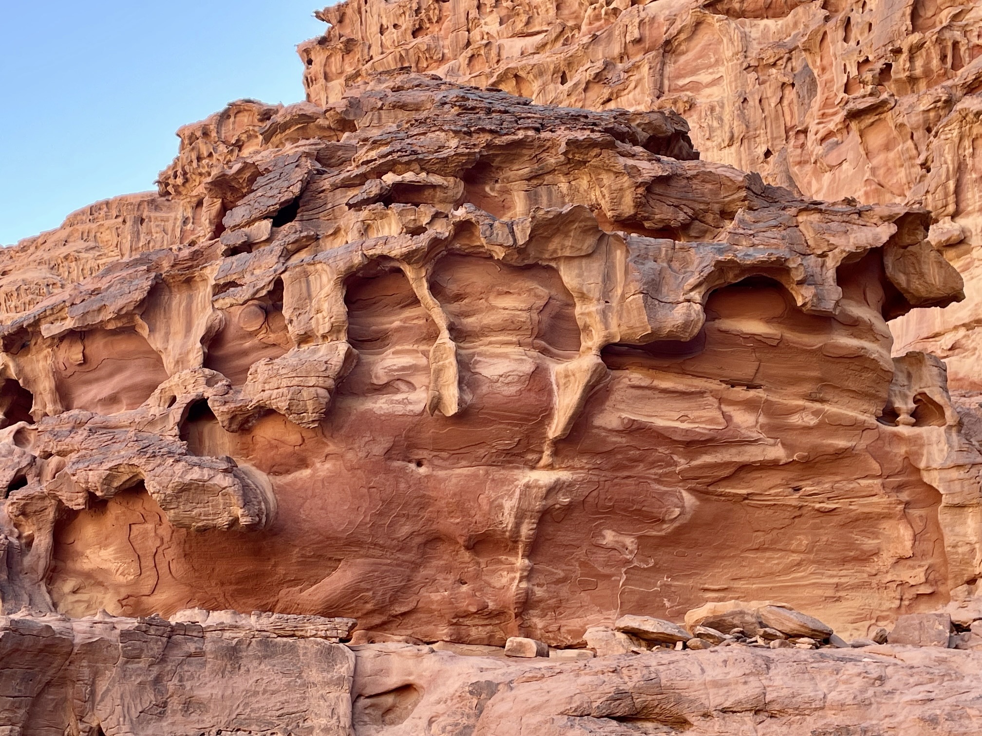 Besides having a Mars-like landscape, Wadi Rum displays the most bizarre sandstone textures I’ve ever seen. The cliffs surrounding our camp had the appearance of molten candle wax! This texture, geologically known as tafoni, results from extreme differential erosion and weathering due to variable crystallization and expansion of calcium salts within the rock.