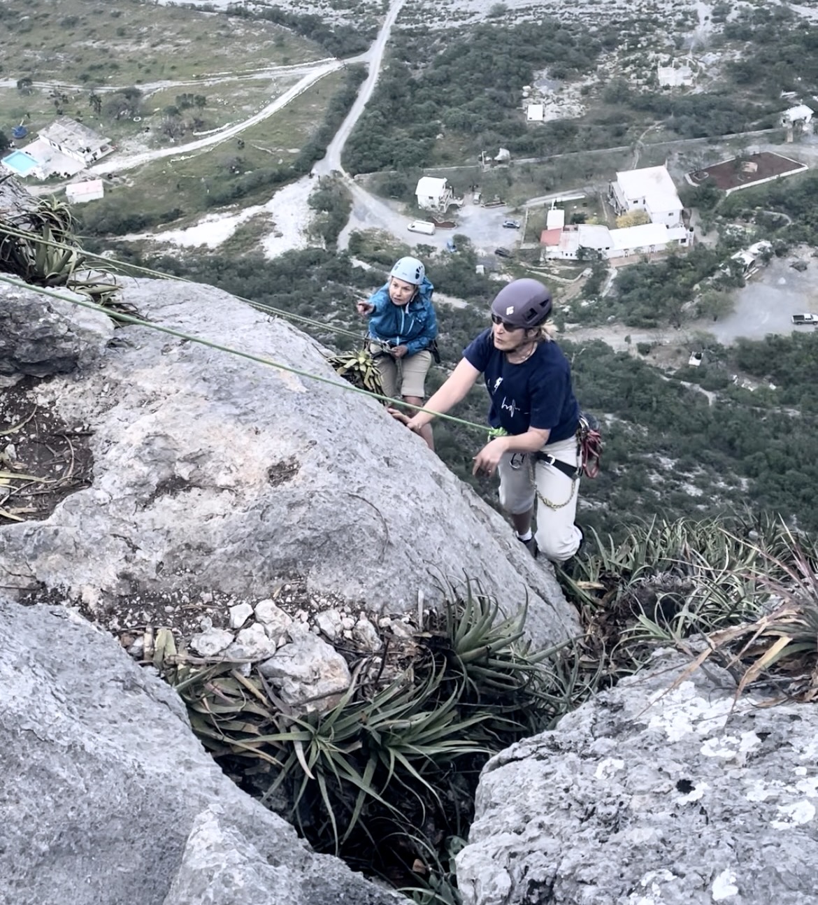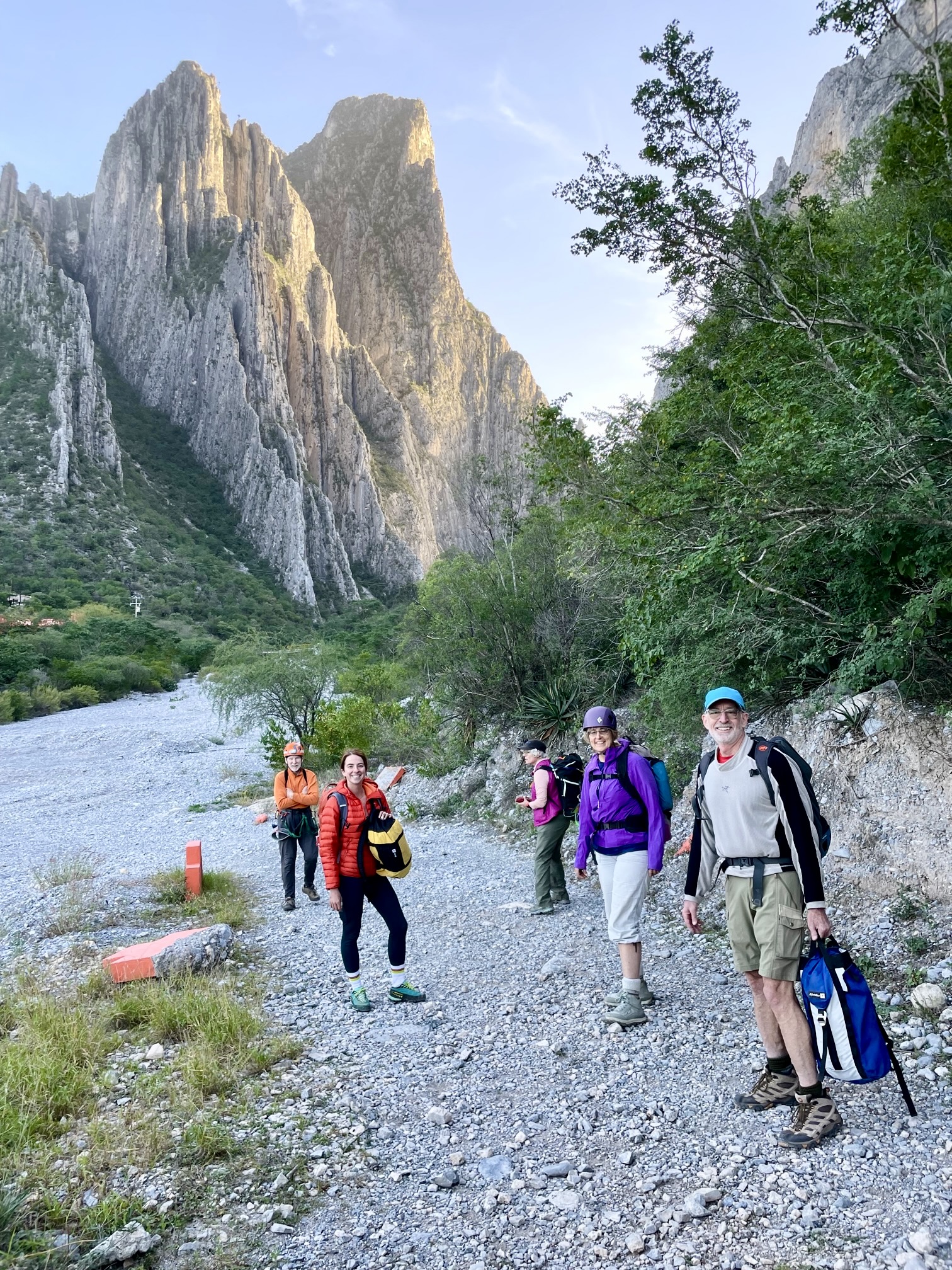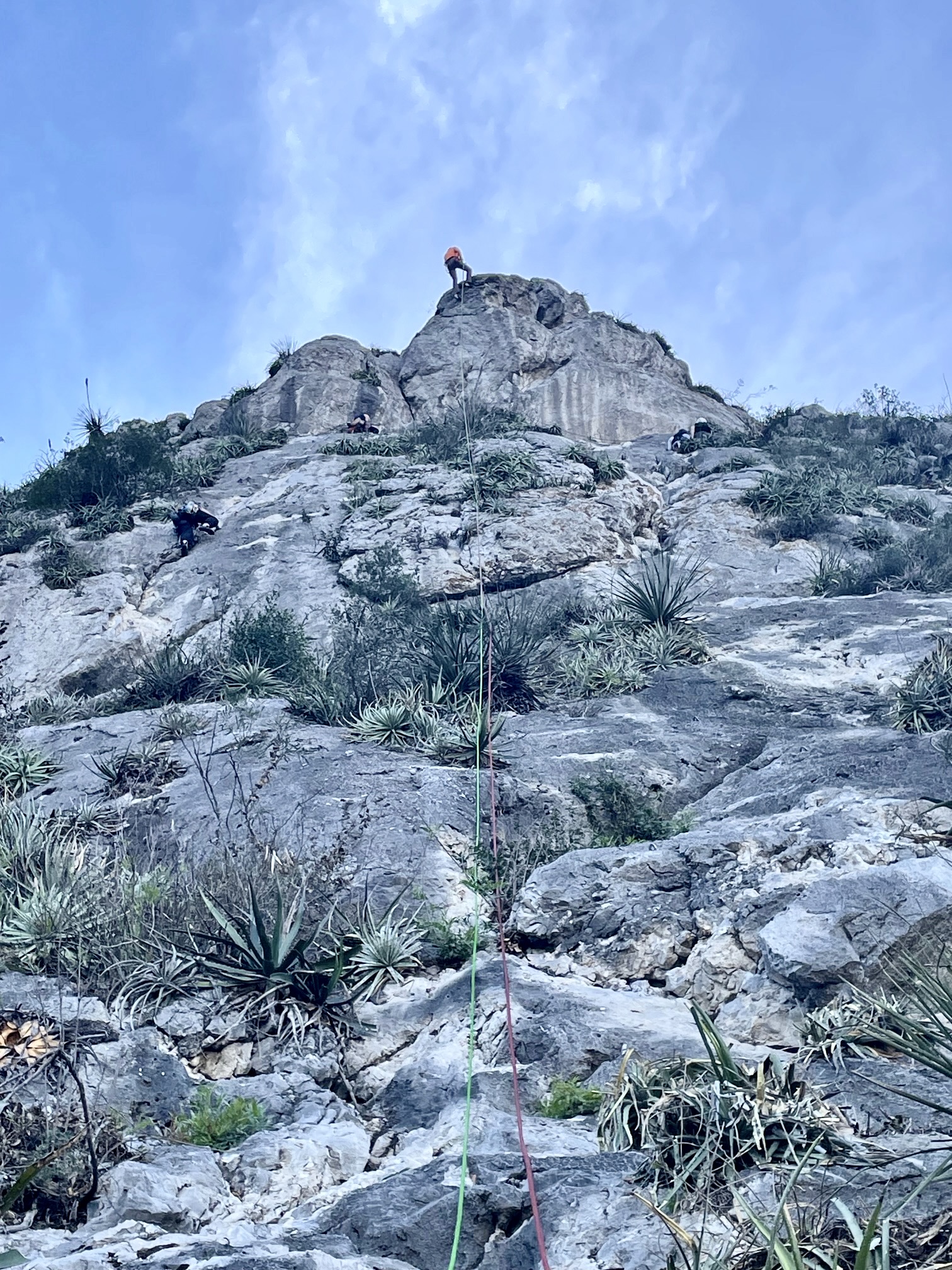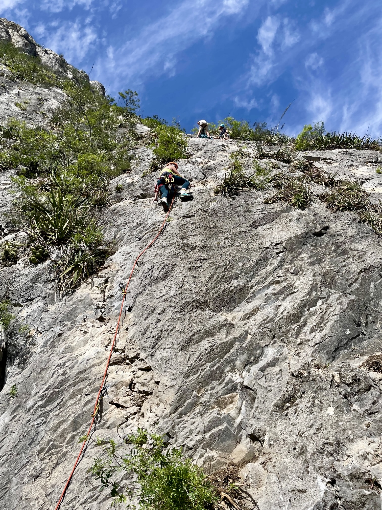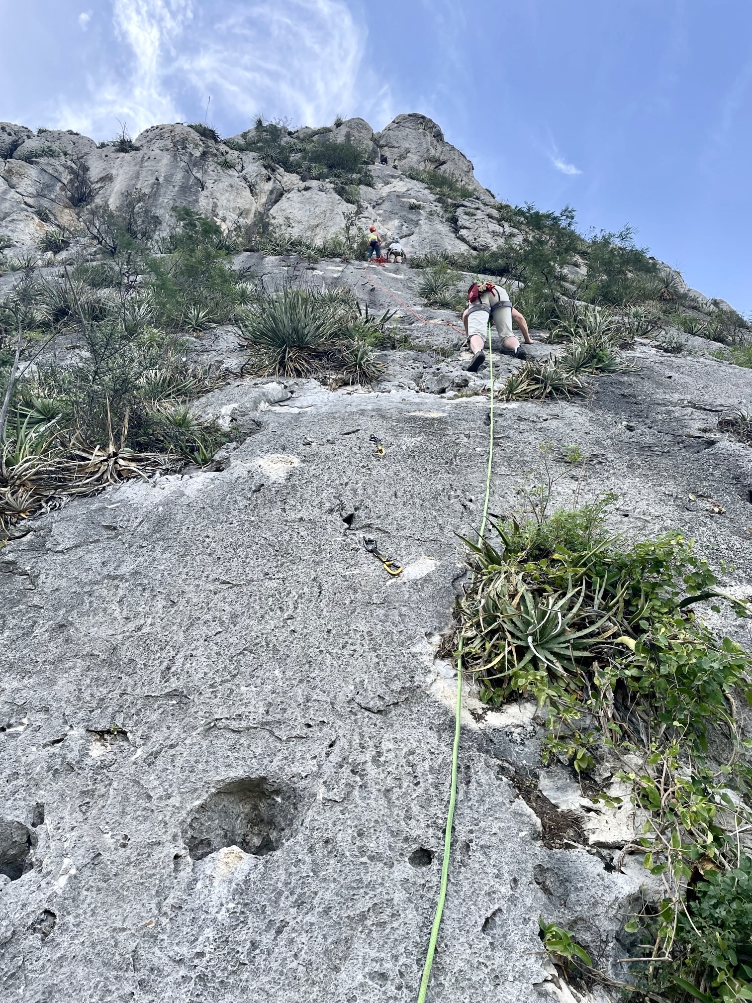 During a short rock-climbing trip to Potrero Chico Recreational Park (“PoCho”) in northeastern Mexico, Eileen and Brooke and I spent a day at Buzz Rock. Our objective was Five-Pitch Harmony, a multi-pitch sport route that Brooke had been eyeballing. An interesting aspect of this route is that the five pitches increase from Class 5.5 to 5.9 in a nearly regular progression. More importantly, it is also reported to be generously bolted, which is something we all would appreciate.