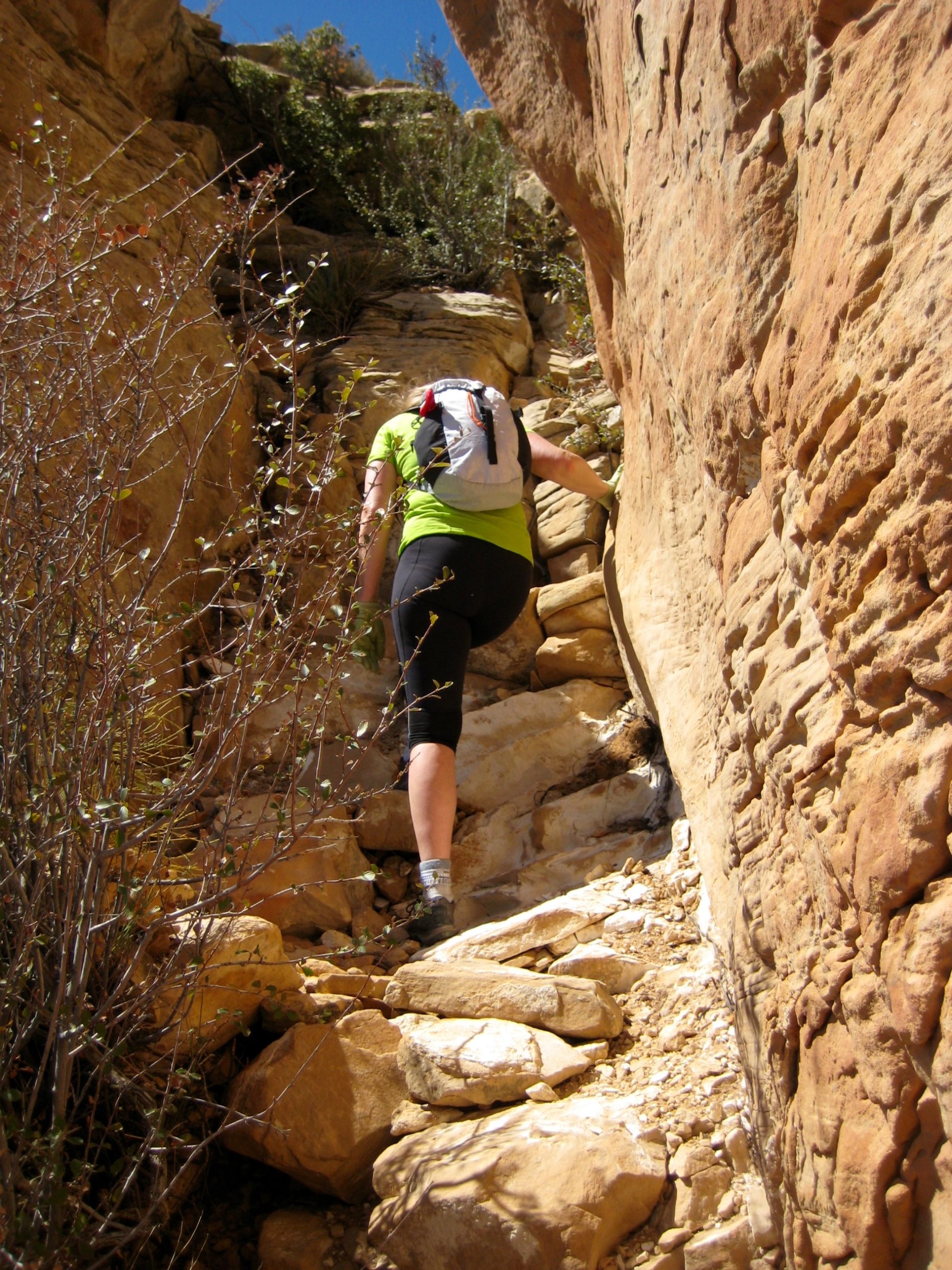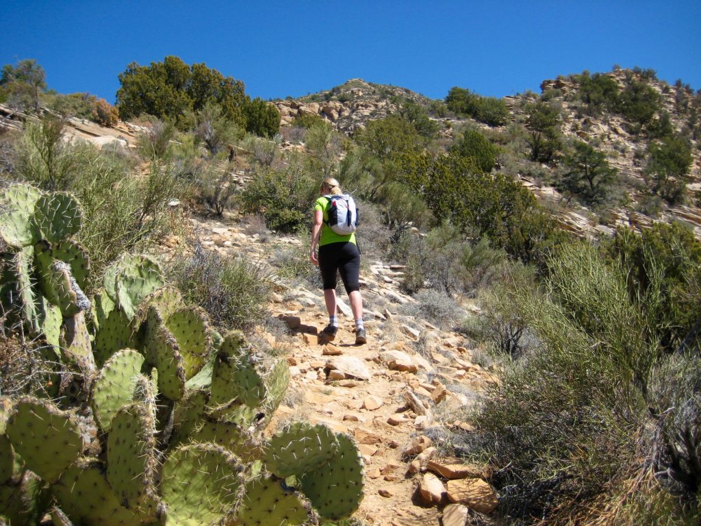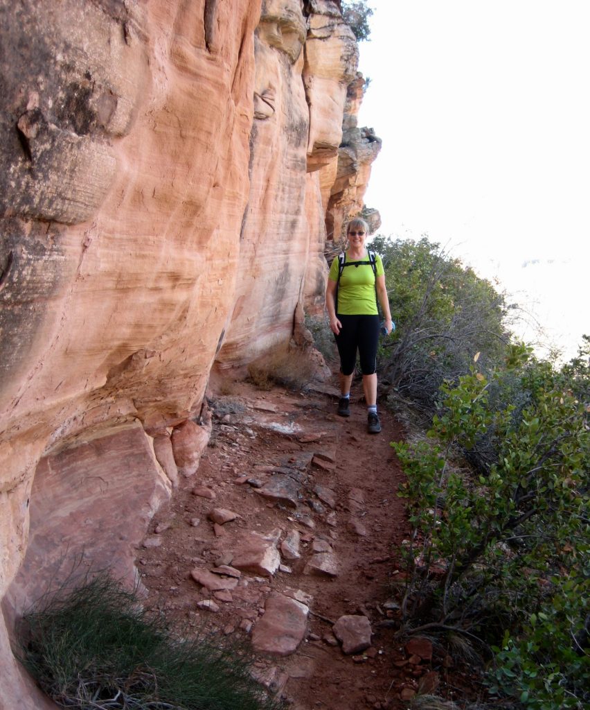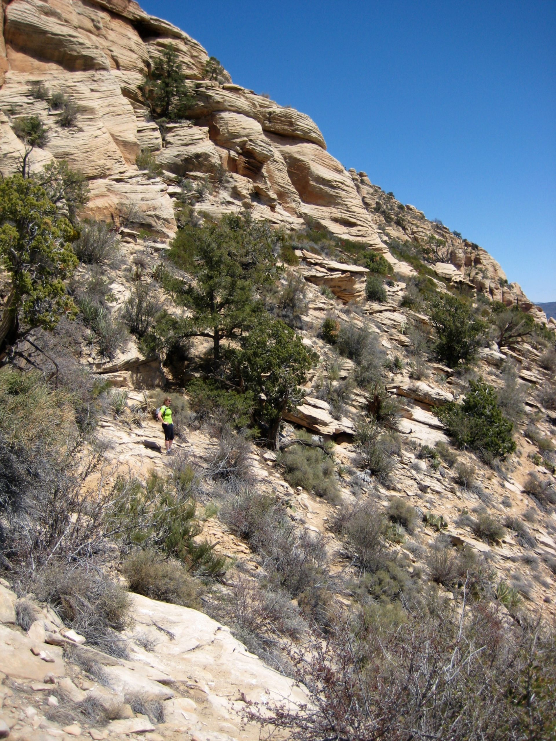 After a short distance, we turned left (east) on an unmarked but well-defined side trail that leads up Lizard Ridge and Capitol Butte. This side trail ascends steeply until encountering a vertical cliff, then traverses eastward along the cliff base.