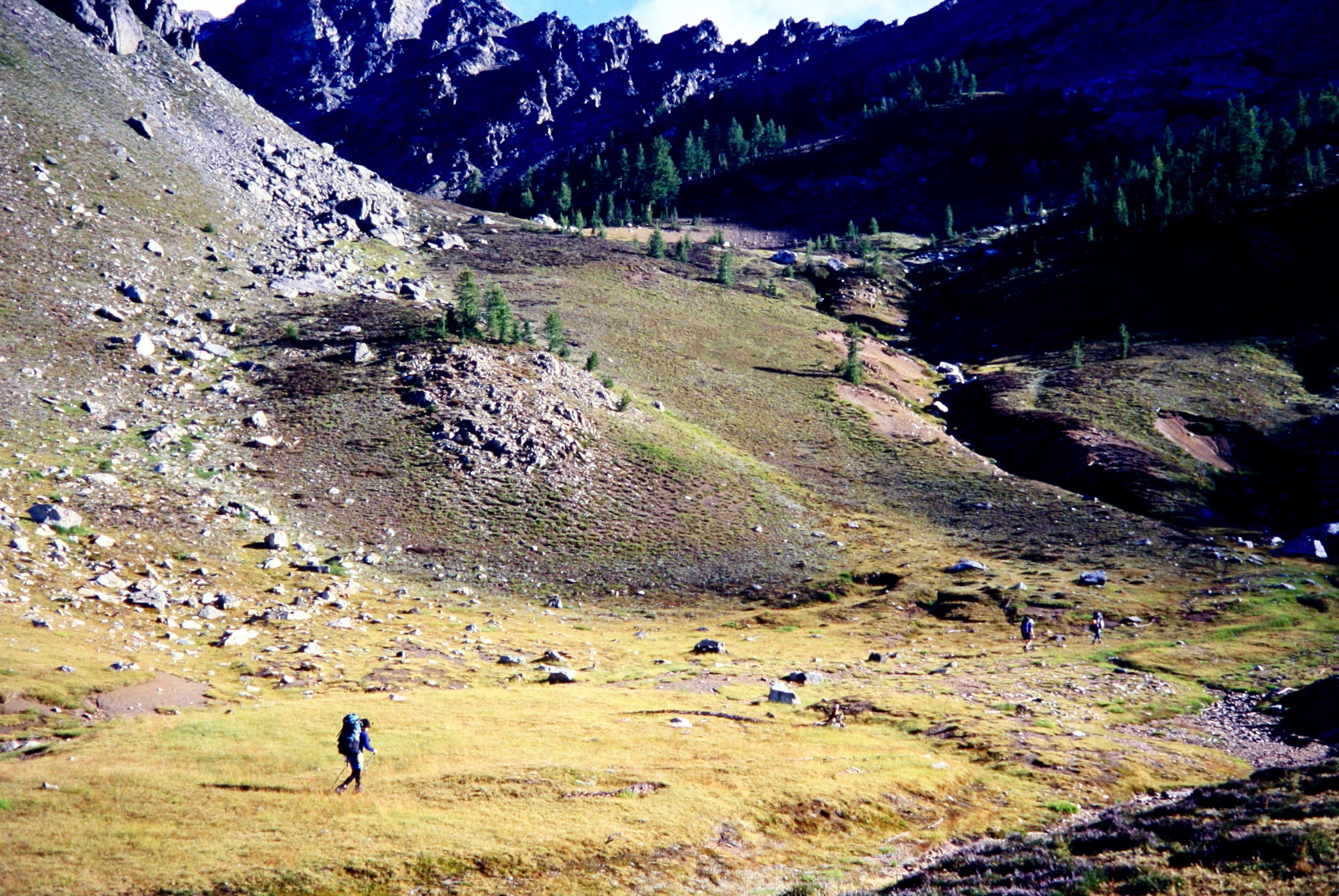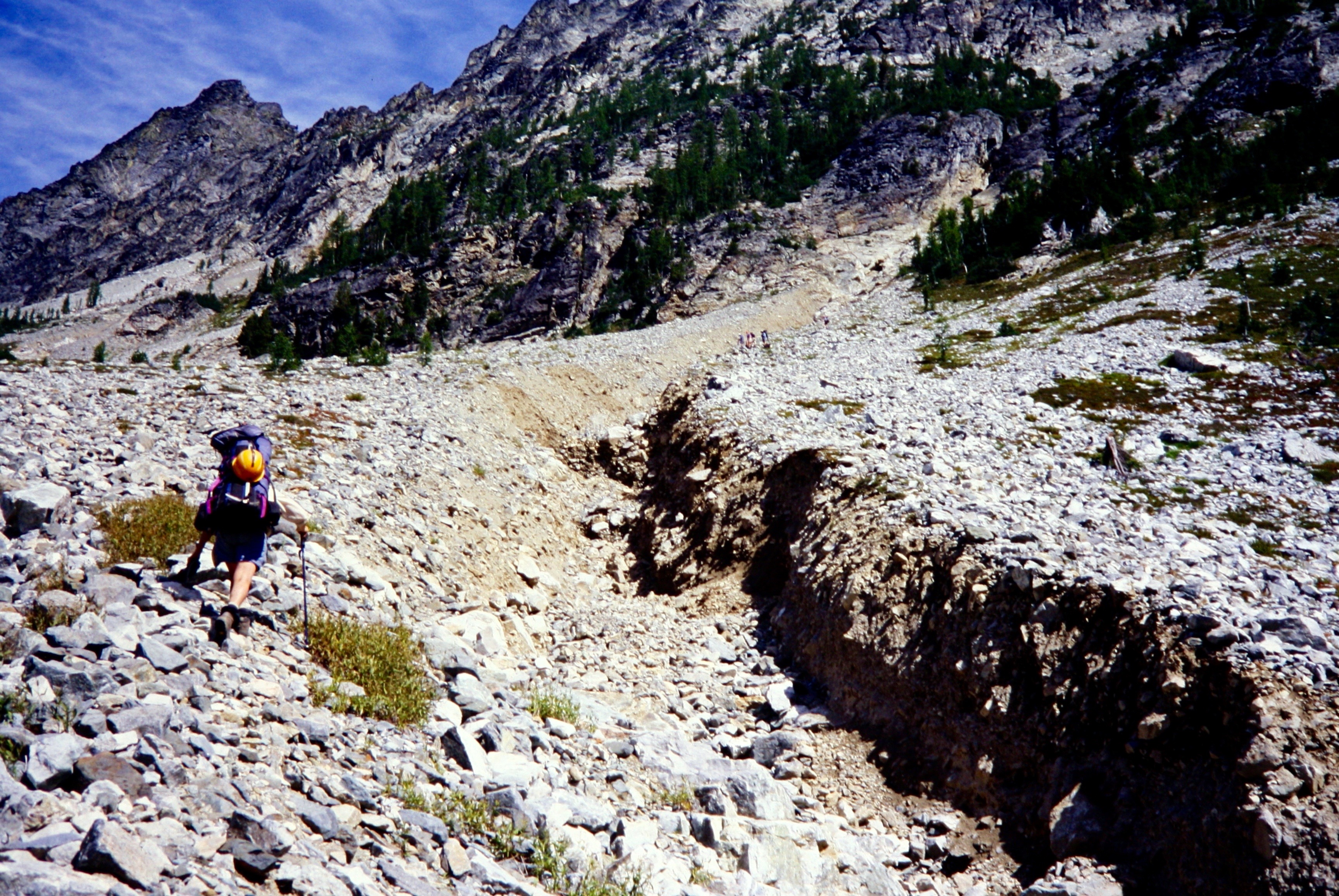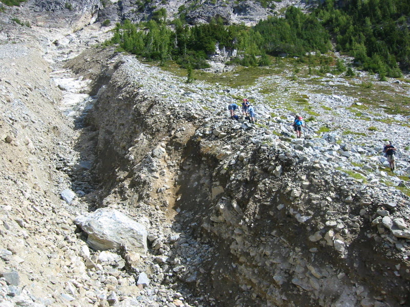 Once across the gully, Beth and I ascended the north side in hopes of finding our five comrades. We spotted them about 200 vertical feet uphill, still on the south side of the gully. They were standing on the brink of a steep, 25-foot-high dirt bank—dwarfed by the gully’s size—setting up a belay rope. I hiked upslope until directly across from the others, at which point I told them about the easy crossing downslope. They were more than happy to drop 200 feet and re-ascend to the trail. The remainder of our hike to Leroy Creek Basin (4.7 hours from Camp 2) was thankfully uneventful.