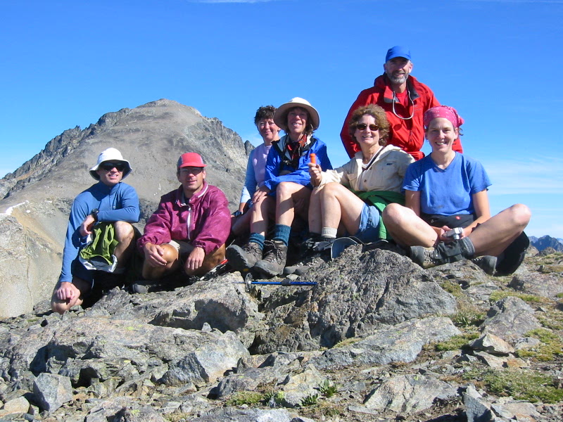 The day dawned cloudless and beautiful, with an autumn briskness. We broke camp and hiked up to Freezer Pass, where all seven of us dropped packs and ascended Freezer Peak together. The views were marvelous on this clear morning, and everyone got a kick out of signing the mini-register I’d deposited the day before. Having our whole group gathered like this on a summit was frosting on the trip for me!