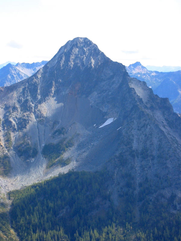 At about 6400 feet, we cut left and traversed talus, erosion gullies, steep forest, and heather slopes into the larch basin between the north and south buttes. From there, we easily gained the south butte’s southwest ridge at 6900 feet. Class 2 rock and talus took us up this ridge and around a 7400-foot spire, which Beckey recommends rounding on the right (south) side, and then on up to a second spire at 7700 feet.