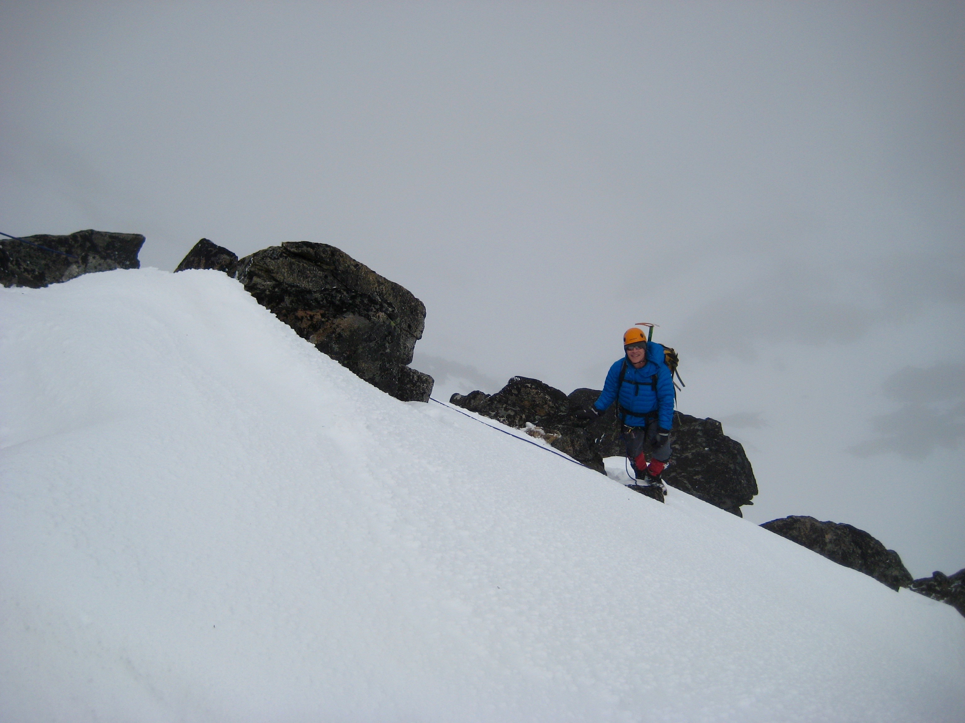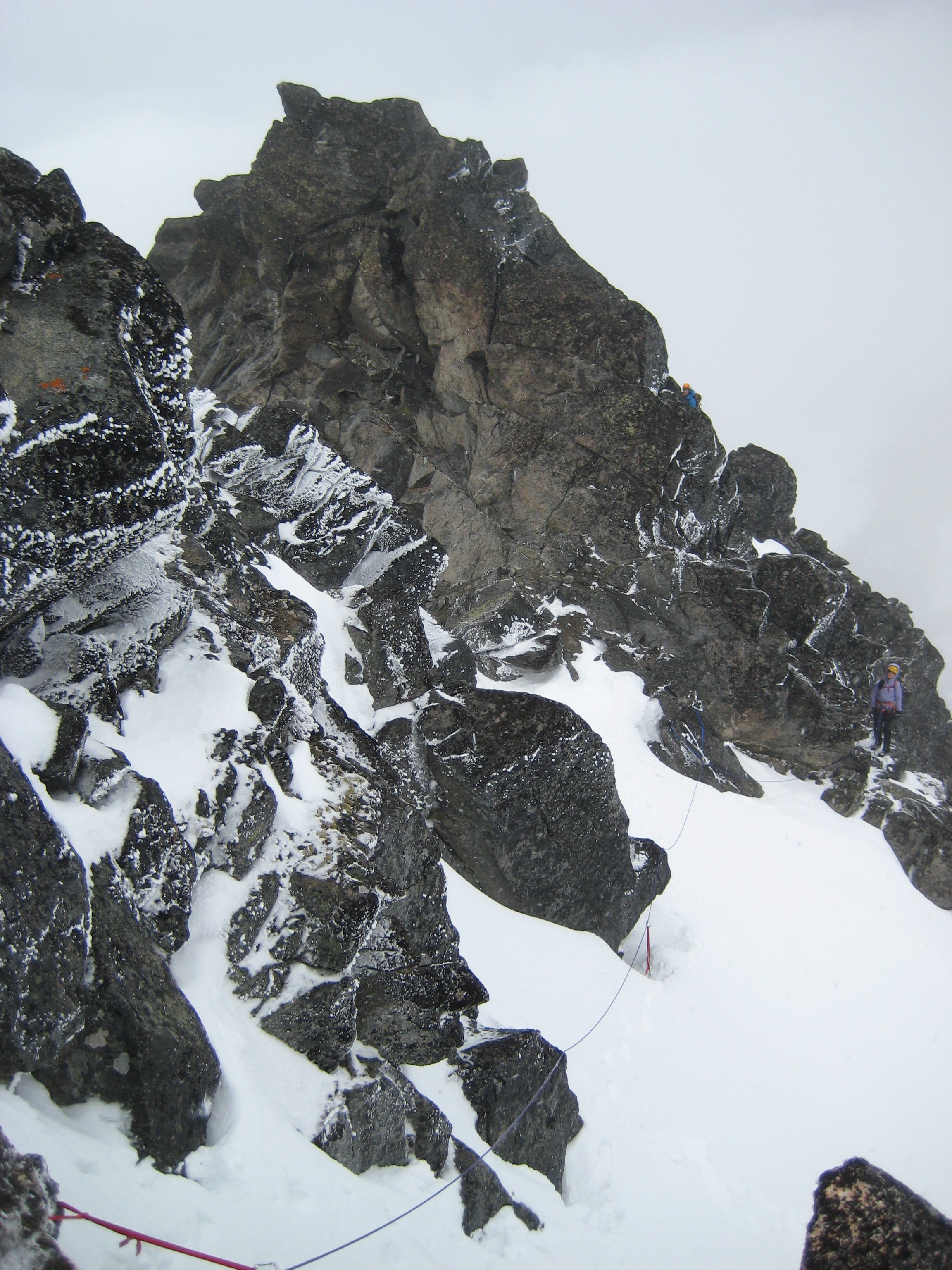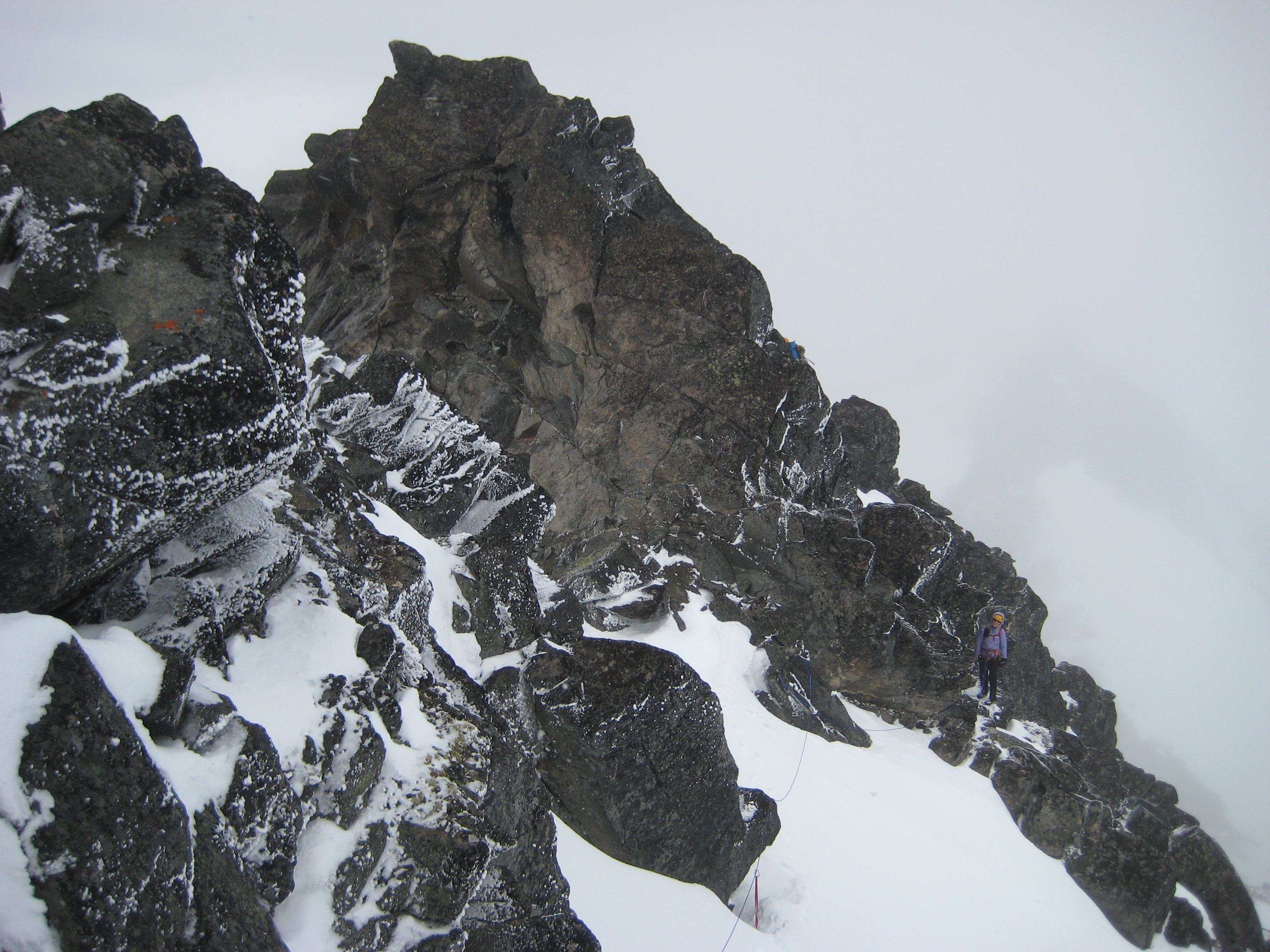 We got a nice mixture of rock and hard snow on the northern side of the ridge. Numerous slings and several chocks provided adequate protection along the way. The southern side was all bare rock and easier climbing.