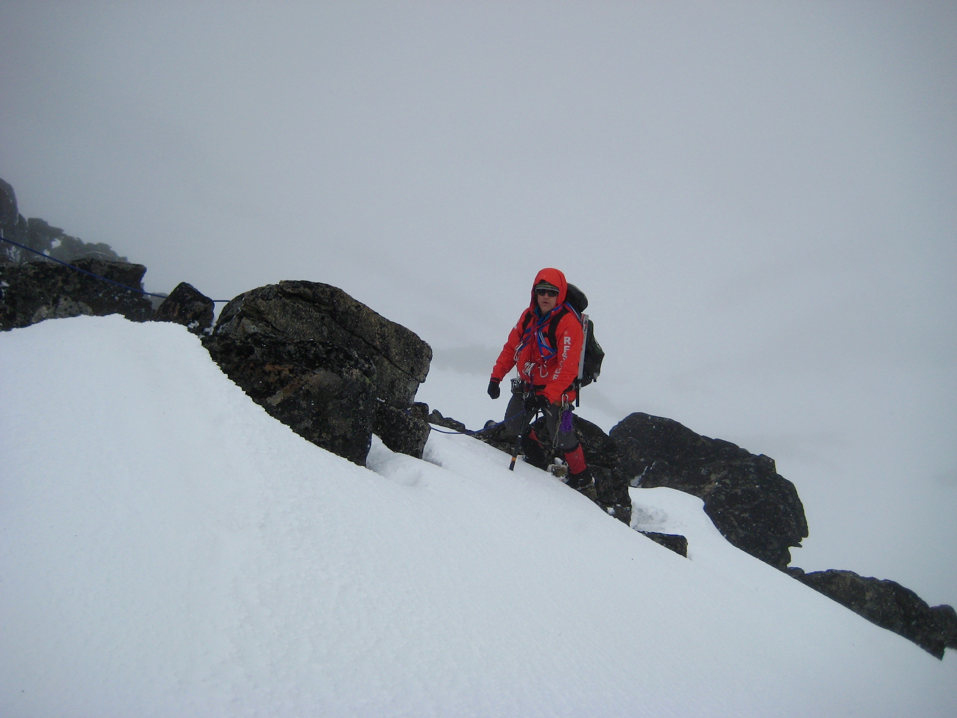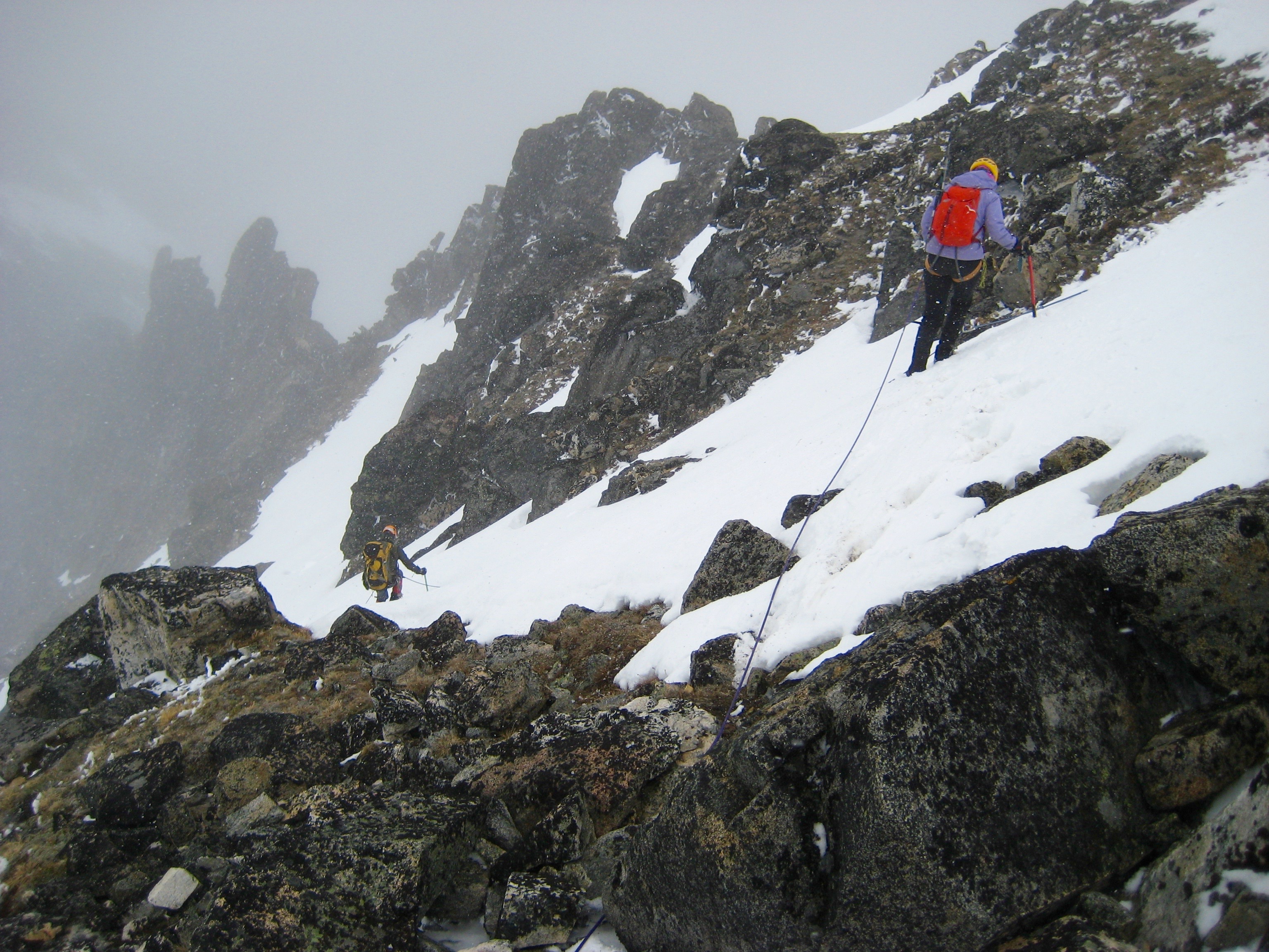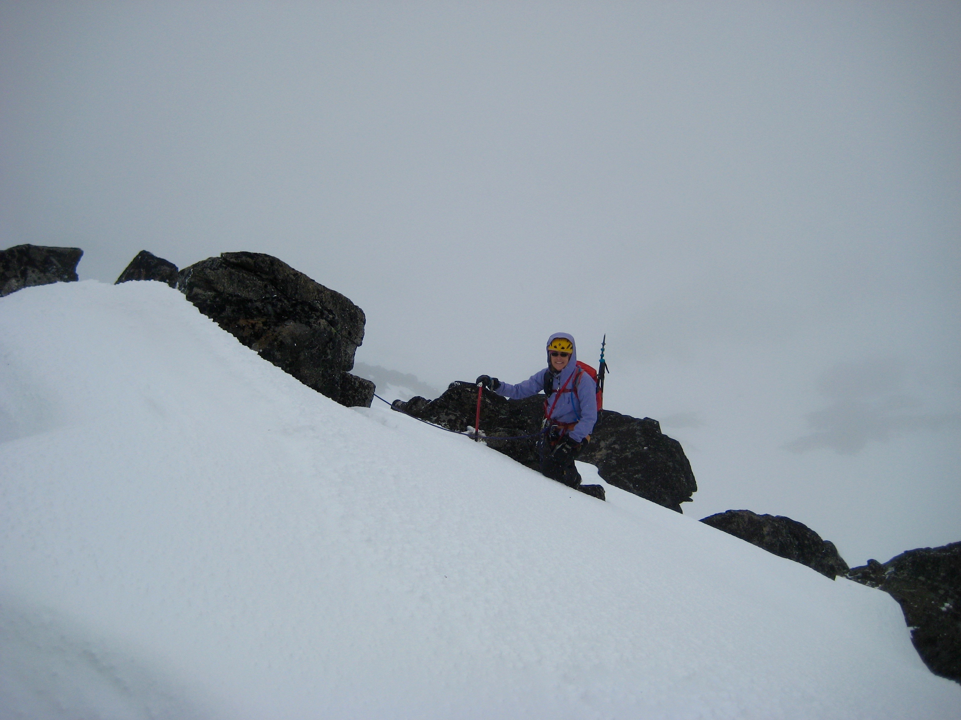 We got a nice mixture of rock and hard snow on the northern side of the ridge. Numerous slings and several chocks provided adequate protection along the way. The southern side was all bare rock and easier climbing.