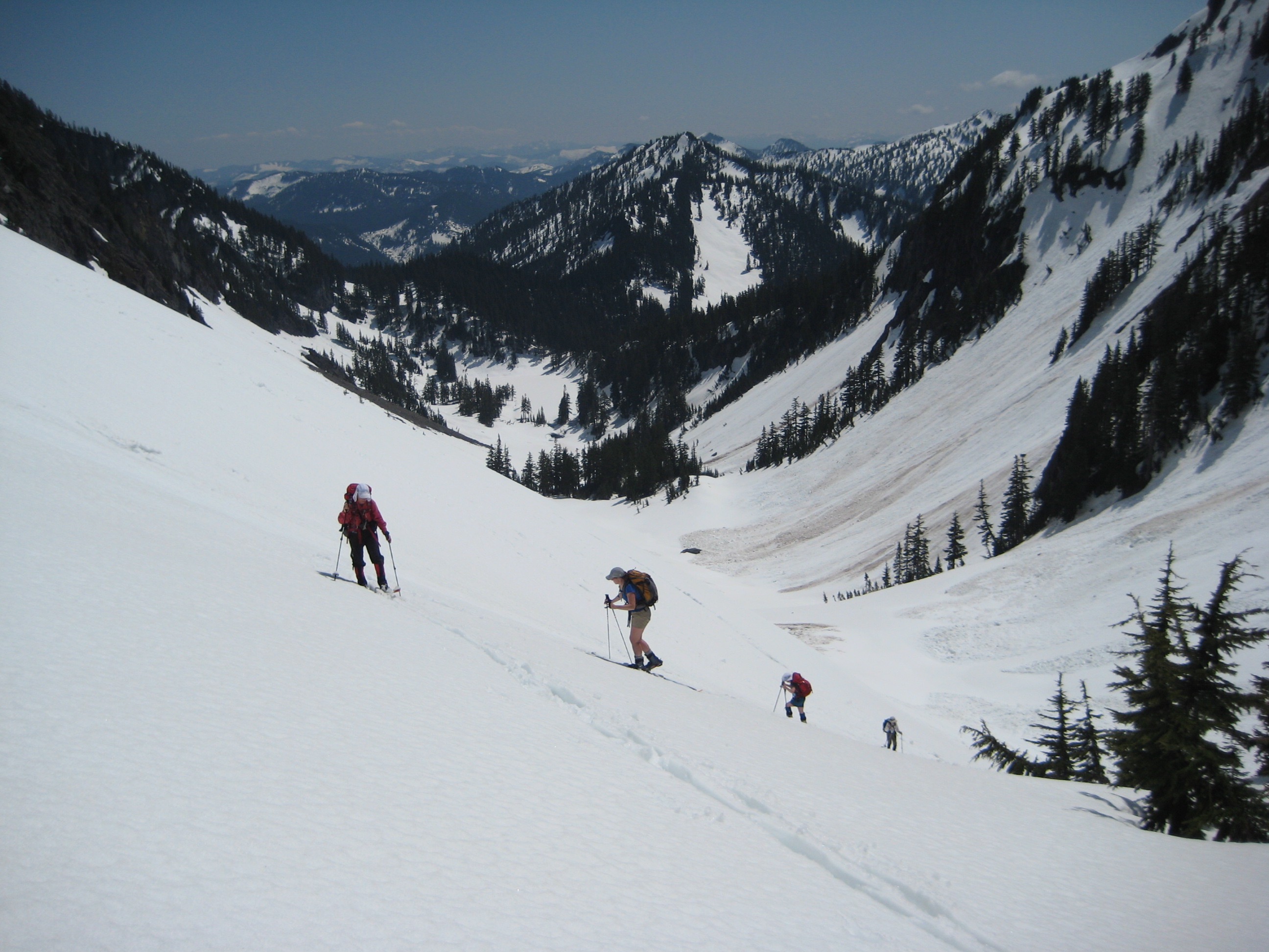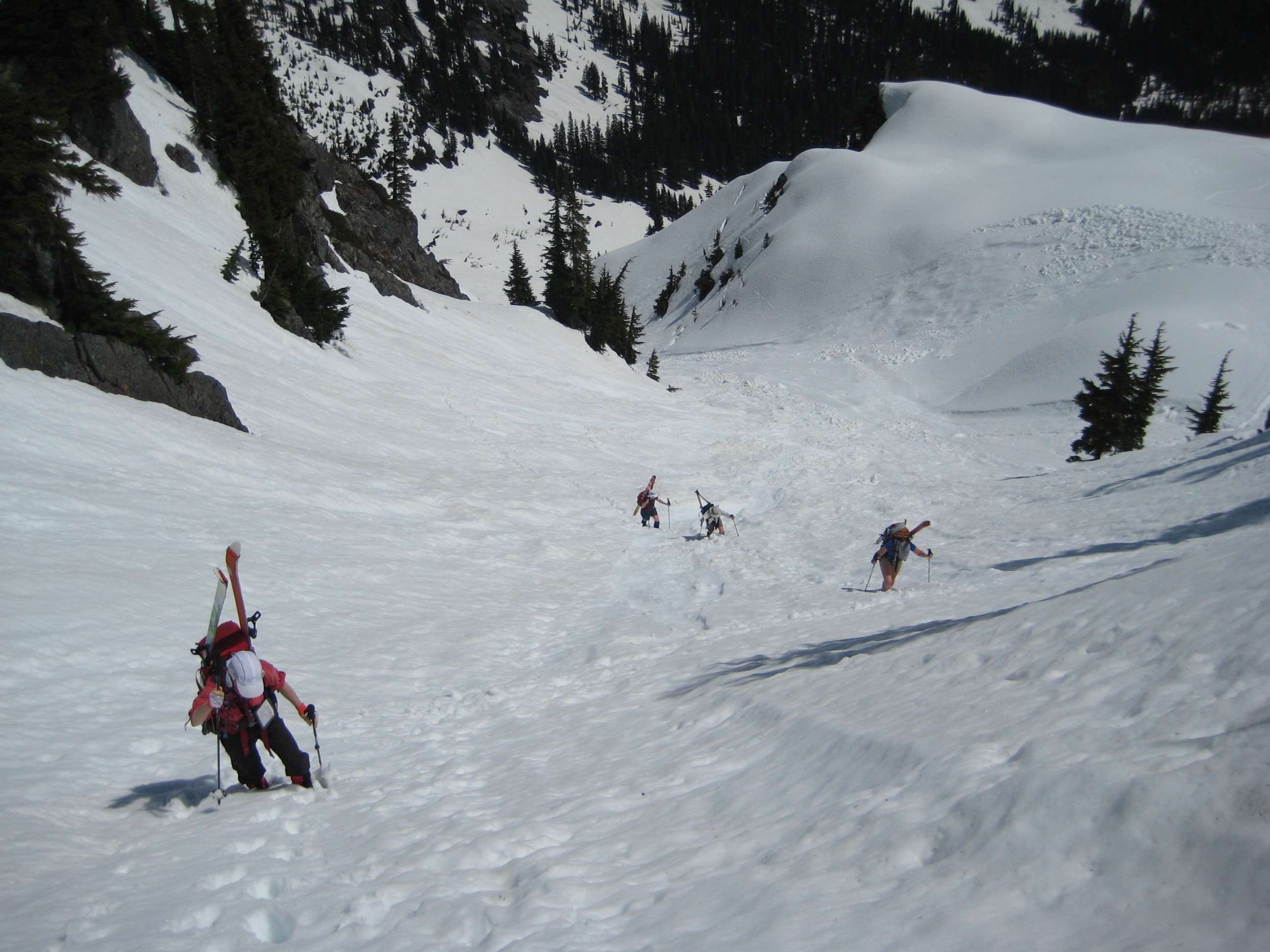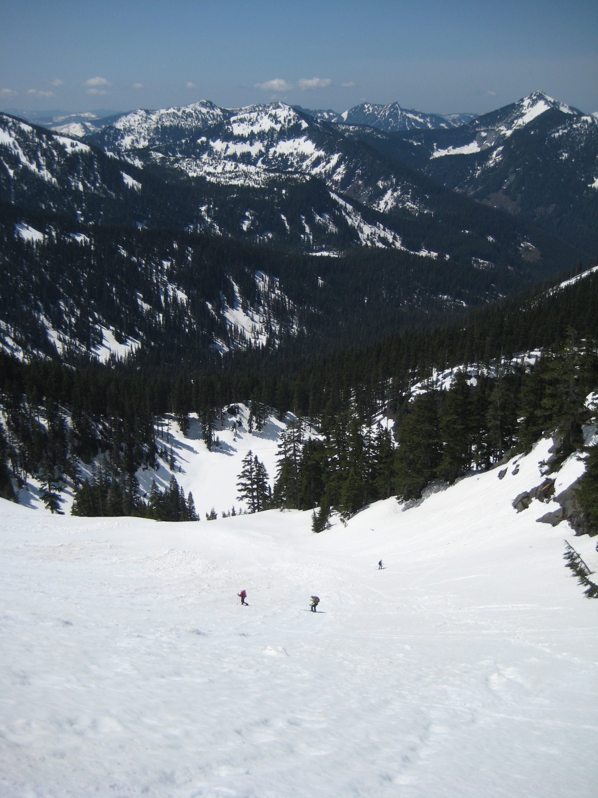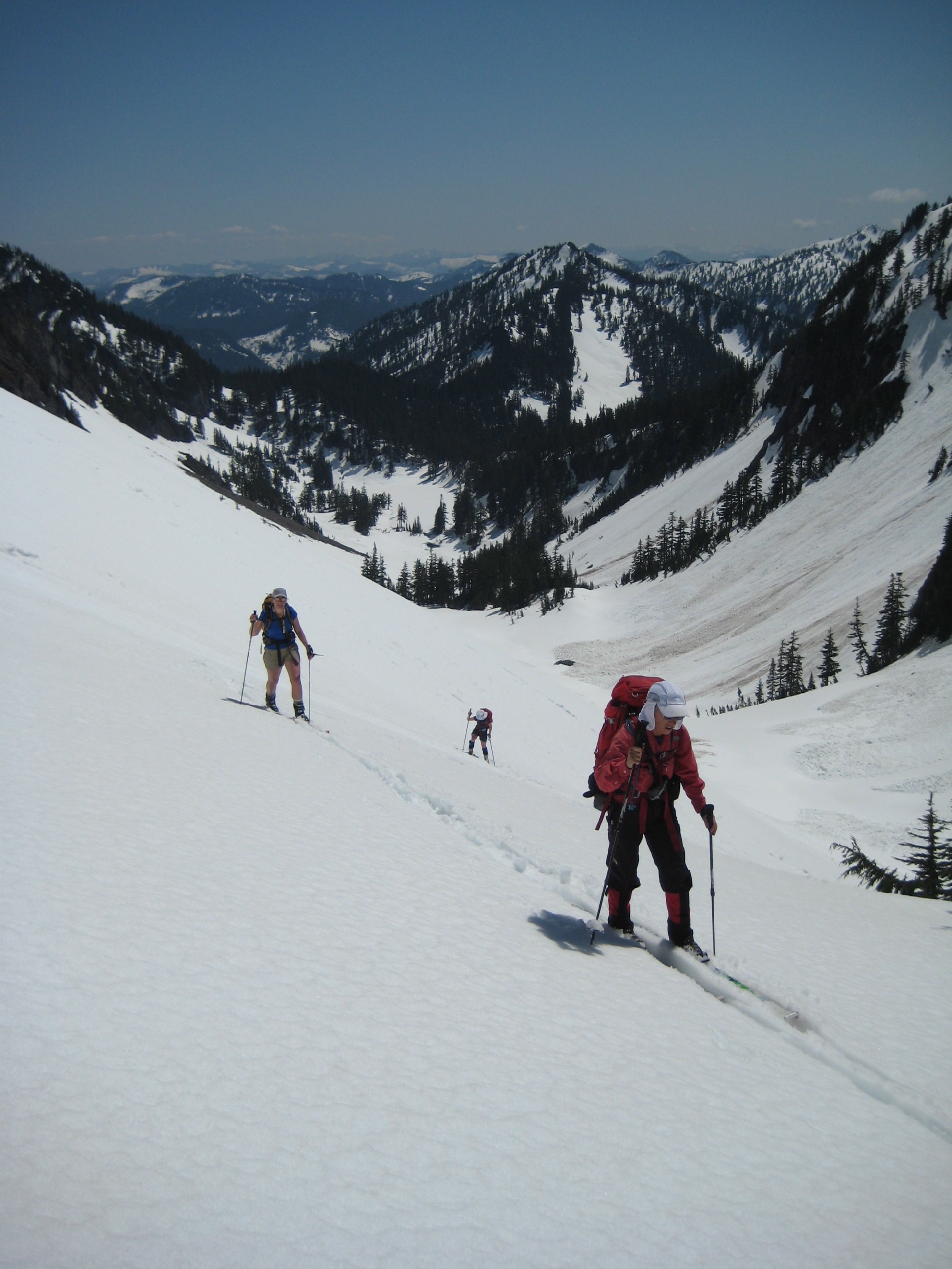 From Bryant Col, we skied down a broad couloir toward Melakwa Lake until able to start a northward traverse (at about 4900 feet) toward Melakwa Pass.