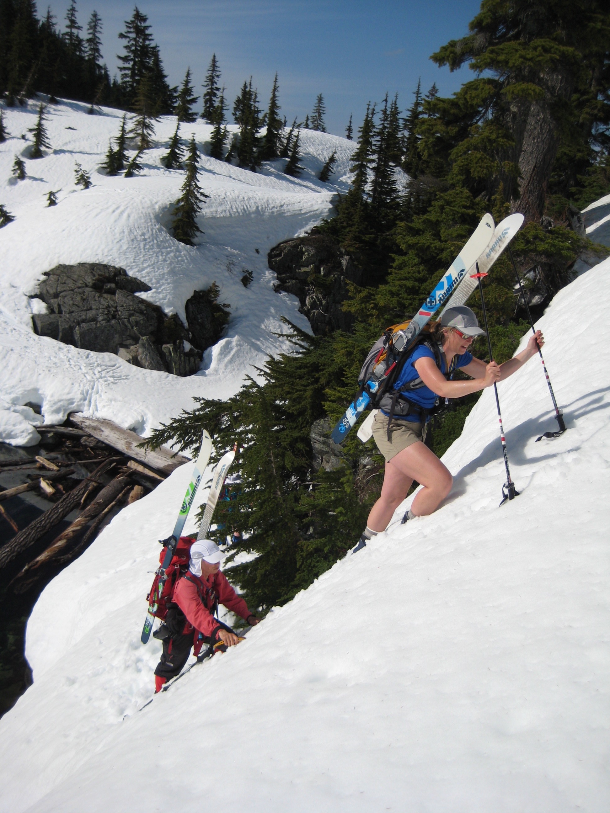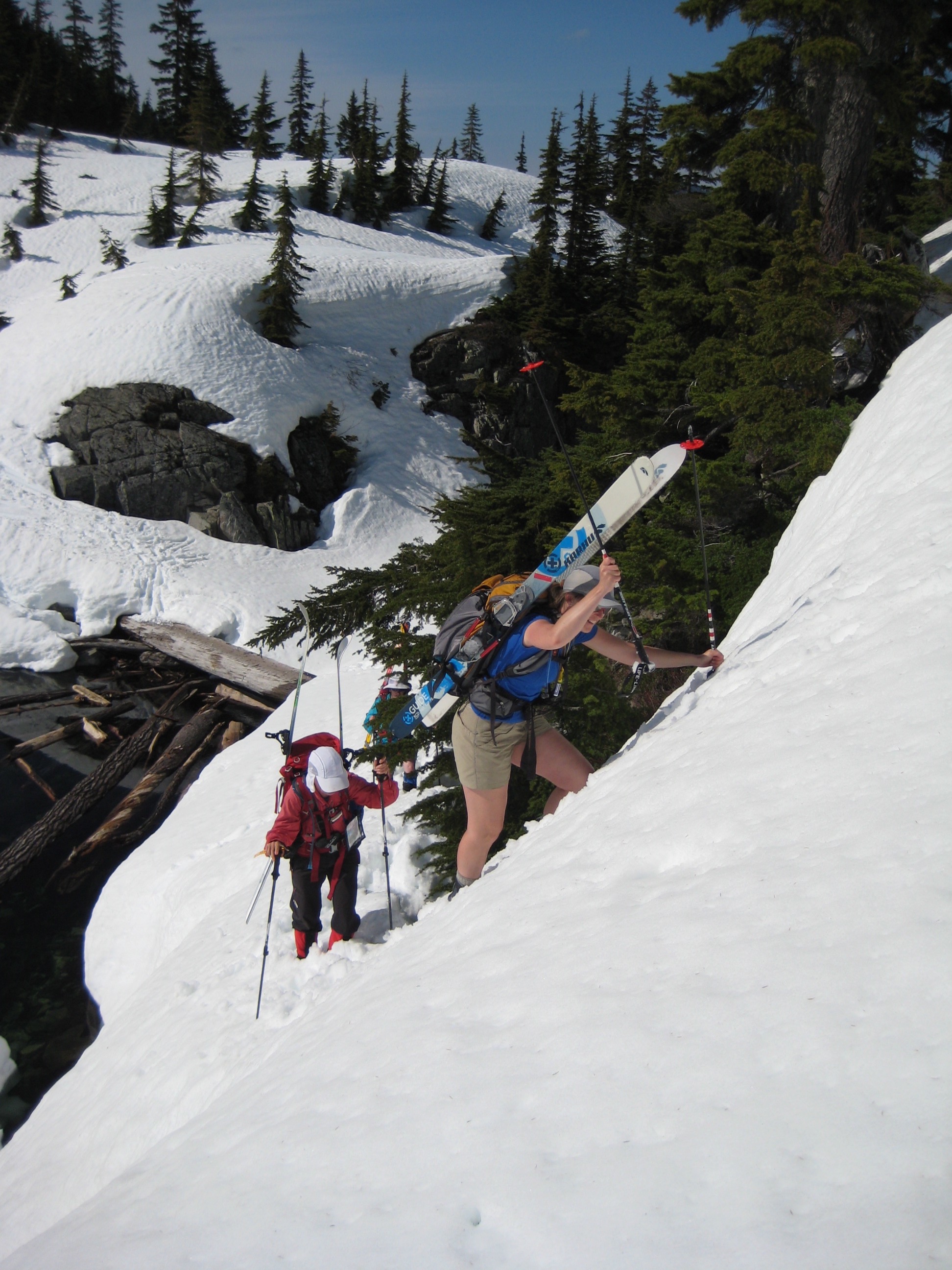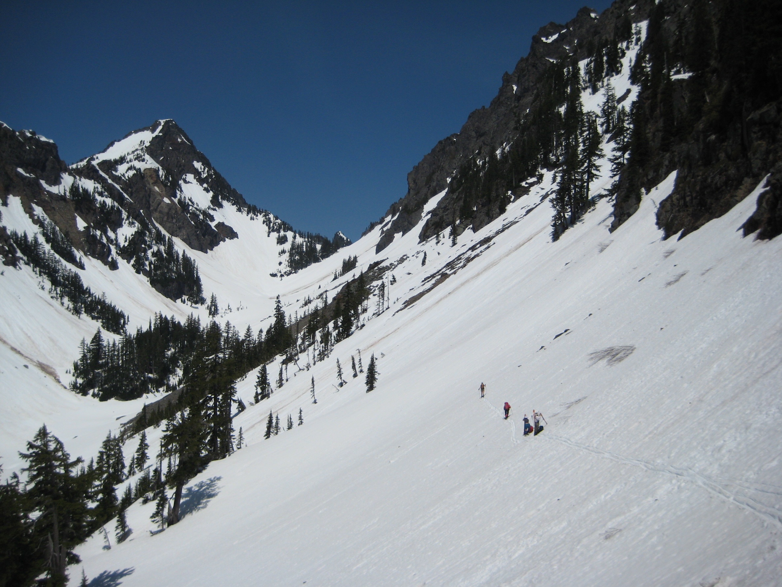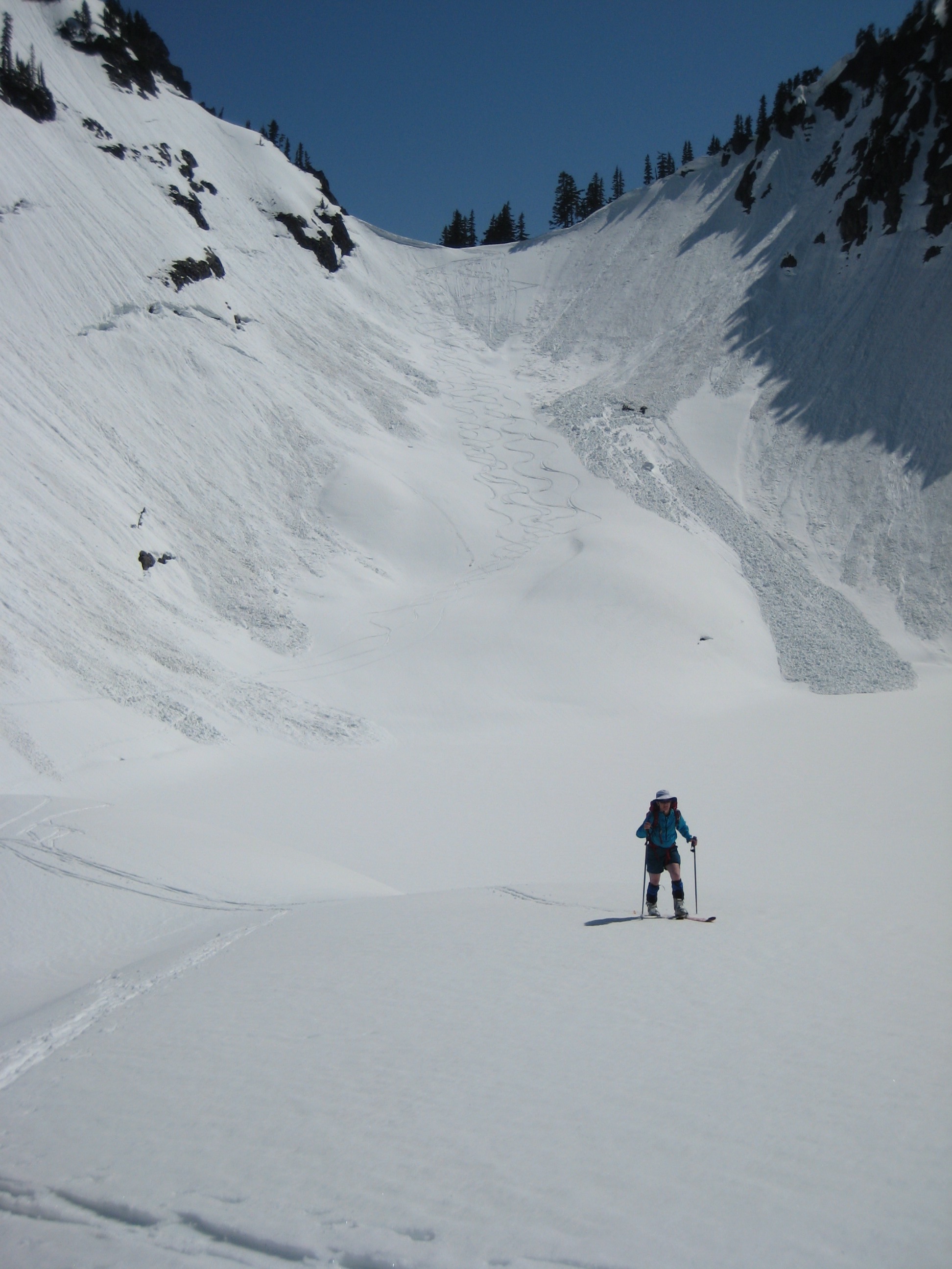 From Bryant Col, we skied down a broad couloir toward Melakwa Lake until able to start a northward traverse (at about 4900 feet) toward Melakwa Pass.