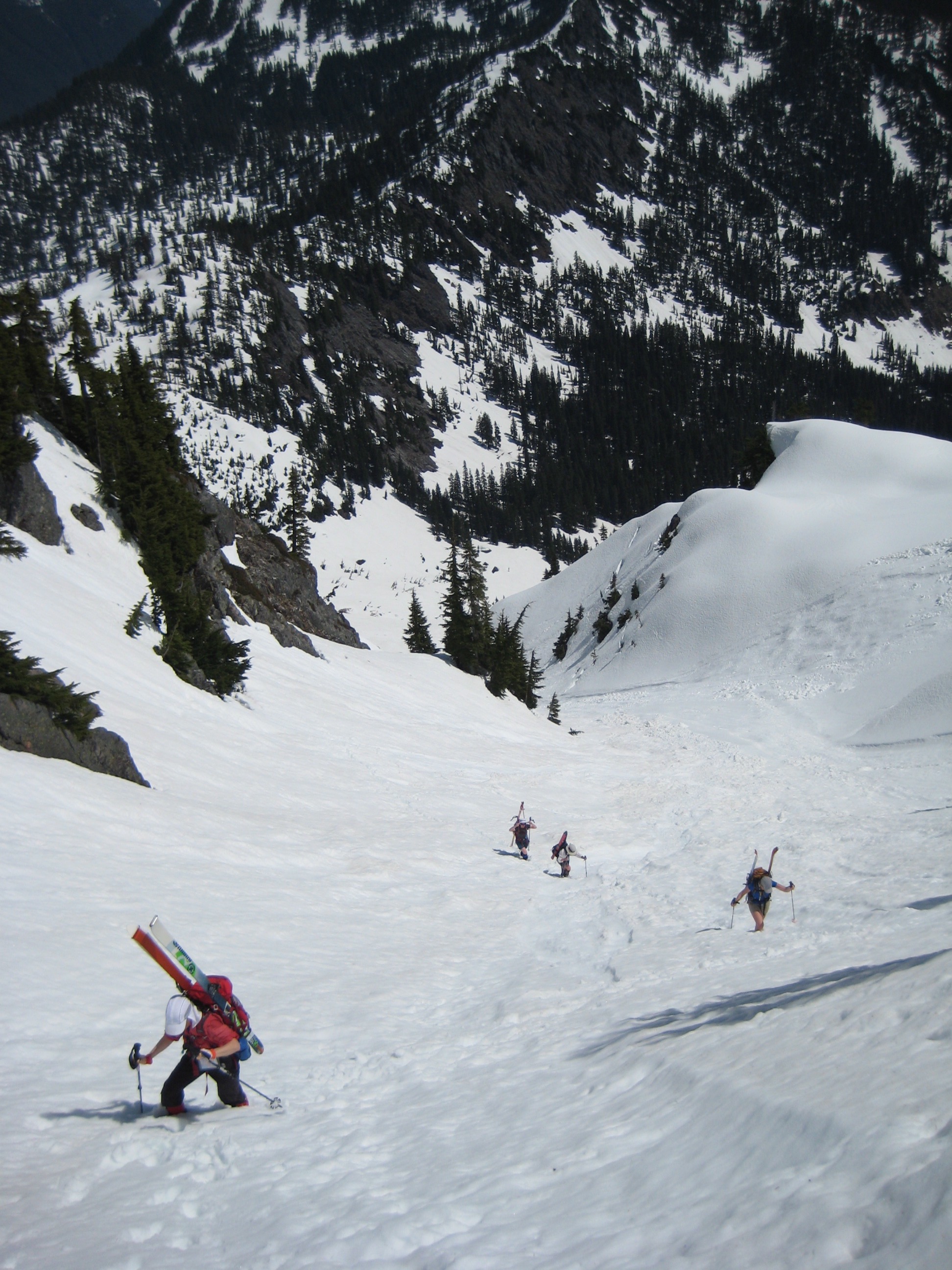 From there, we traversed northward on a 4800-foot bench until reaching a steep chute, which we then booted up.