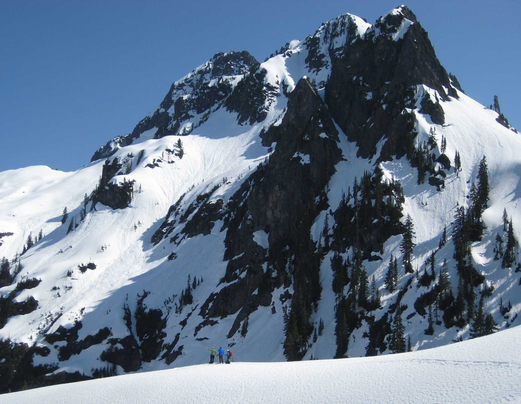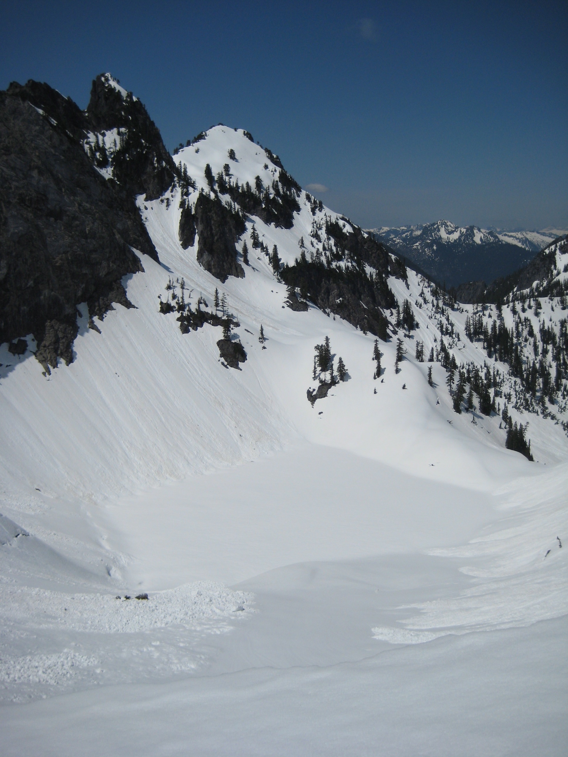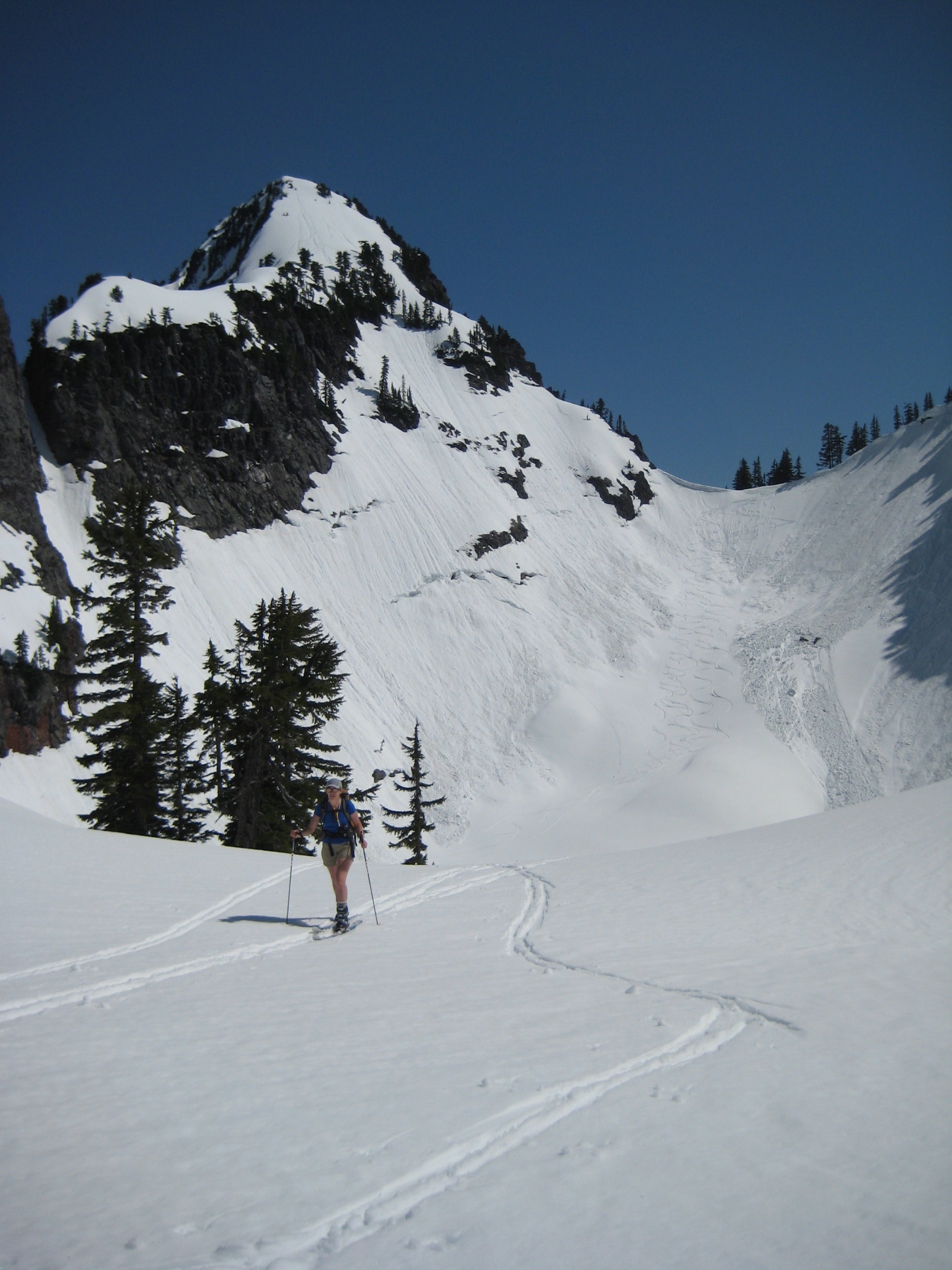 This began well, but the mile-long sideslope gradually grew steeper and unstable, prompting concerns about an unplanned slide & ride into a tree or rock. As a nod to caution, we angled down to the gentle basin floor. An easy climb took us to Melakwa Pass, which splits the massive ramparts of Kaleetan Peak and Chair Peak.
