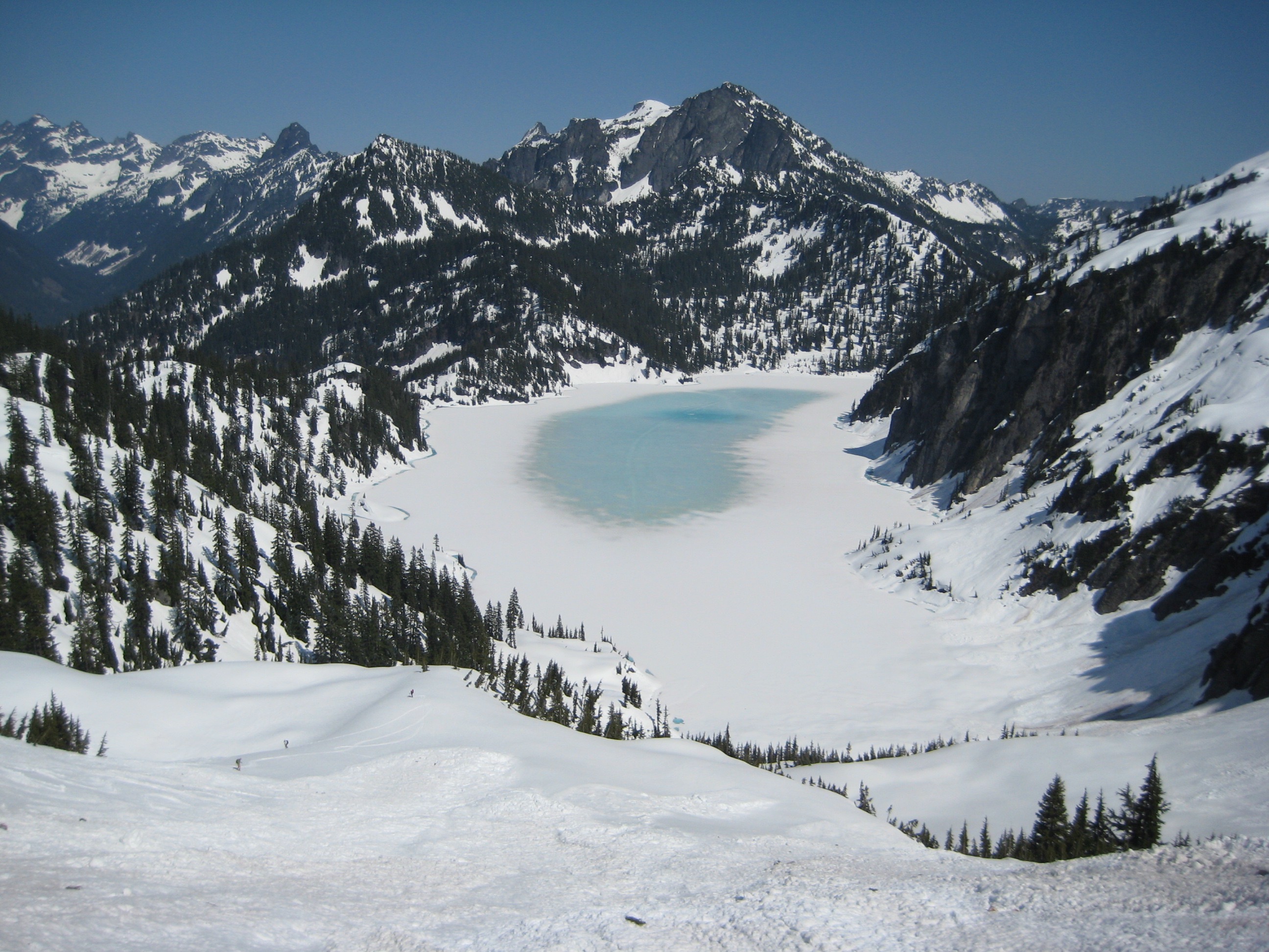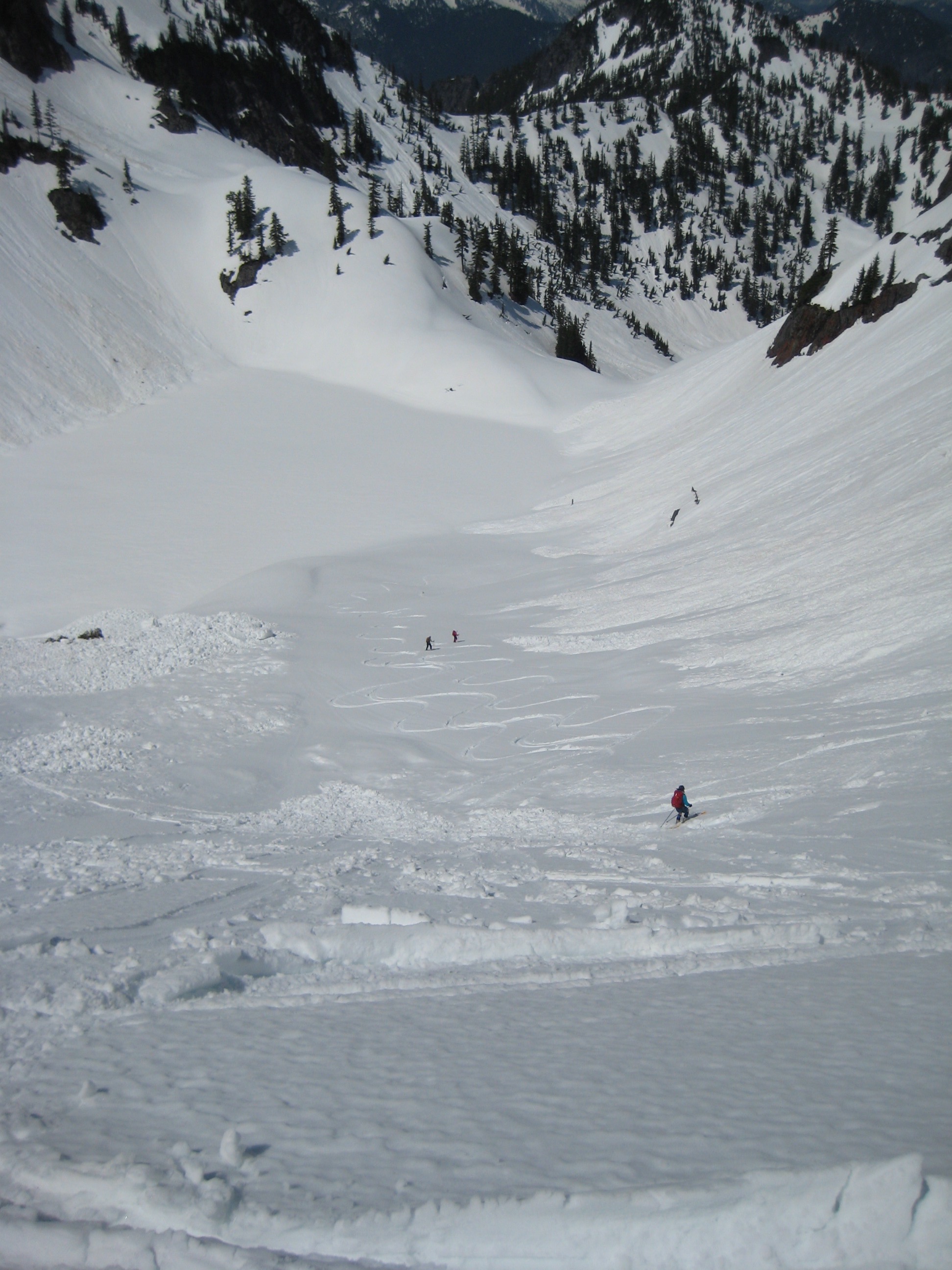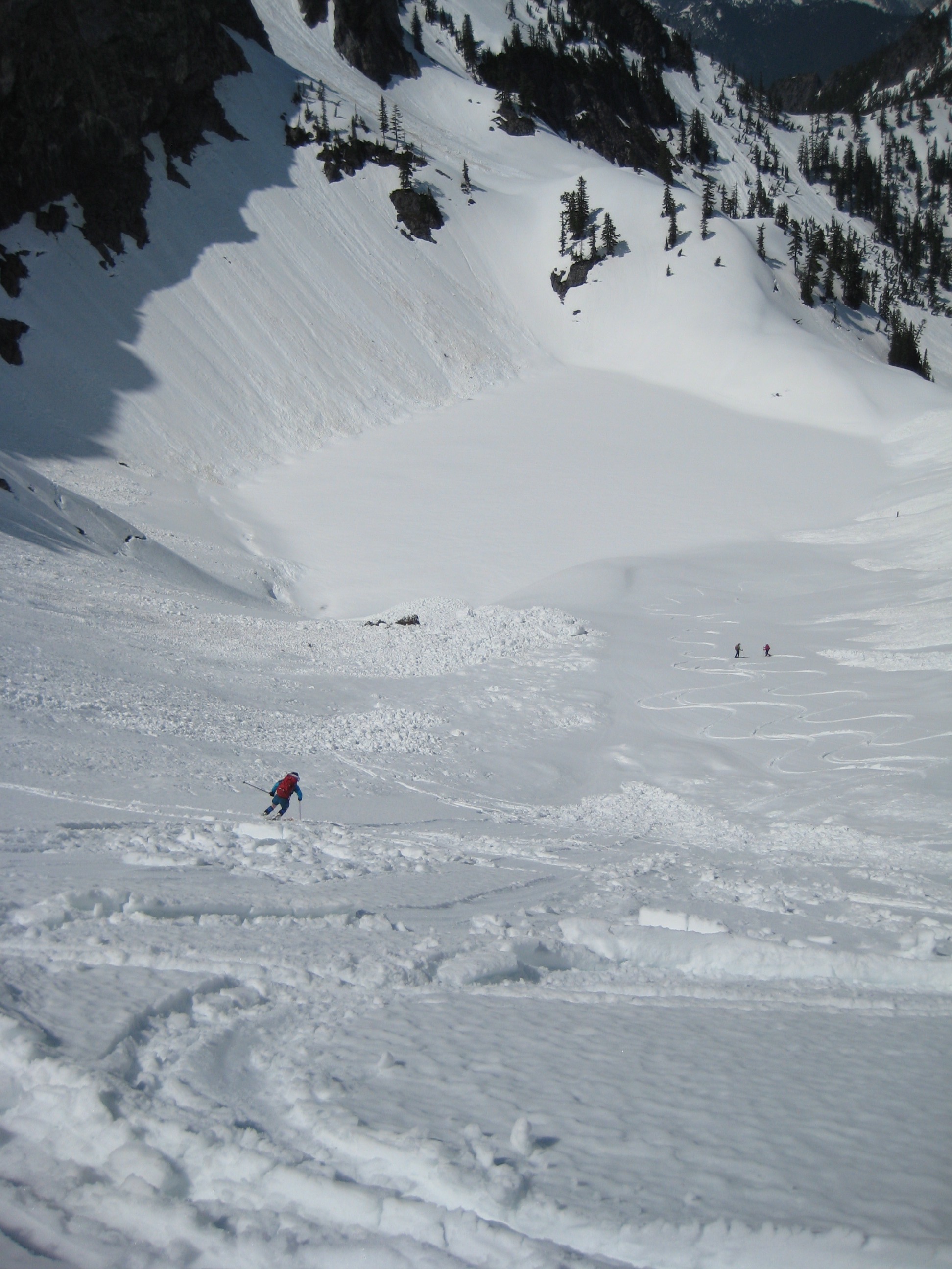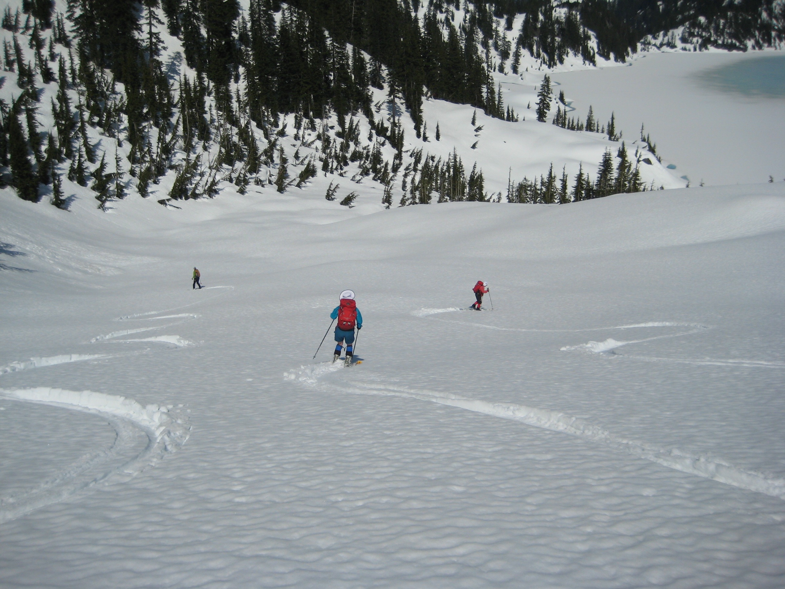From Melakwa Pass, we skied due north down a moderately-angled couloir to tiny Chair Peak Lake. This couloir served up a of luscious soft-kernel corn over a firm base—quite likely the best snow I’ve had all season!
