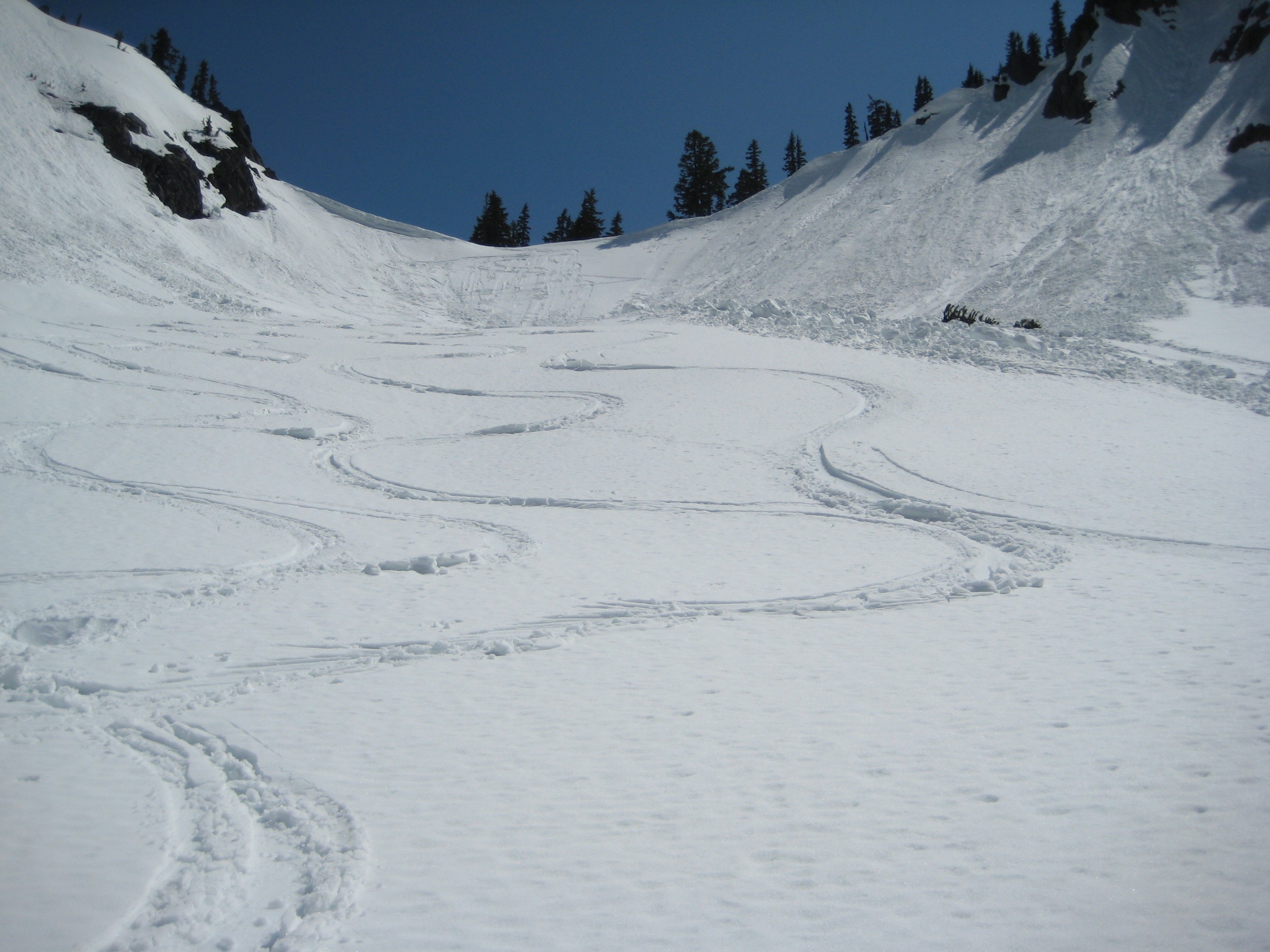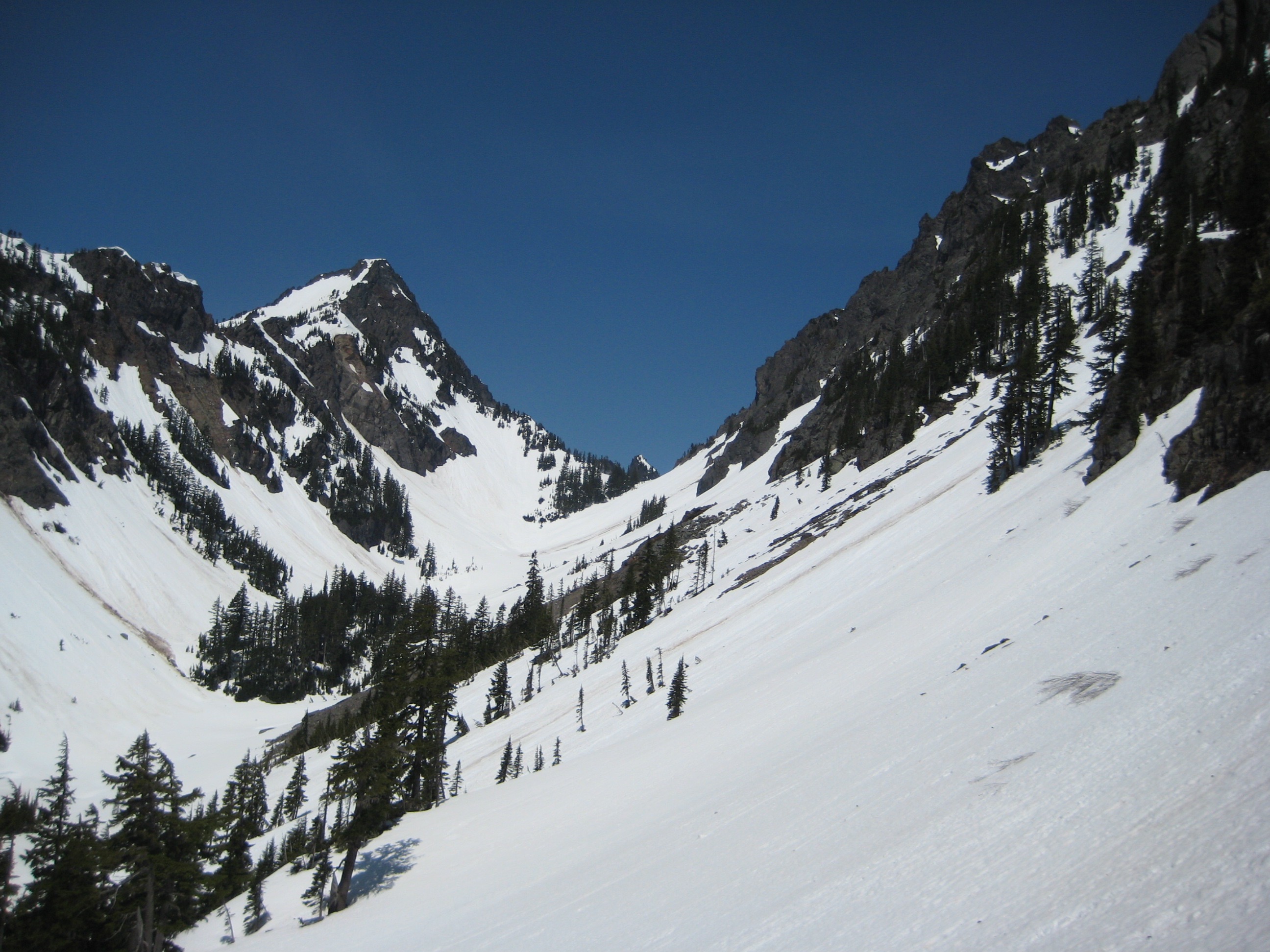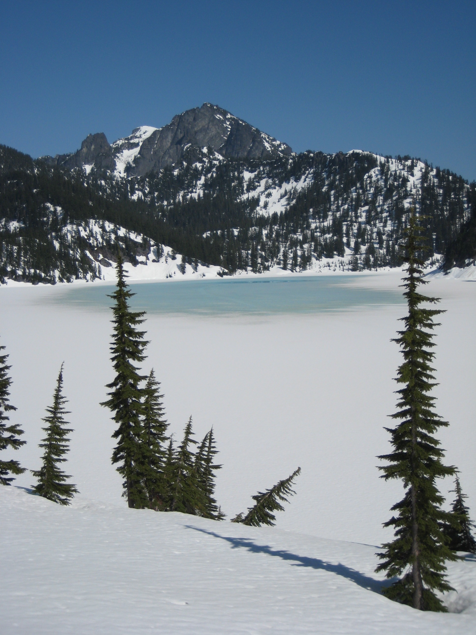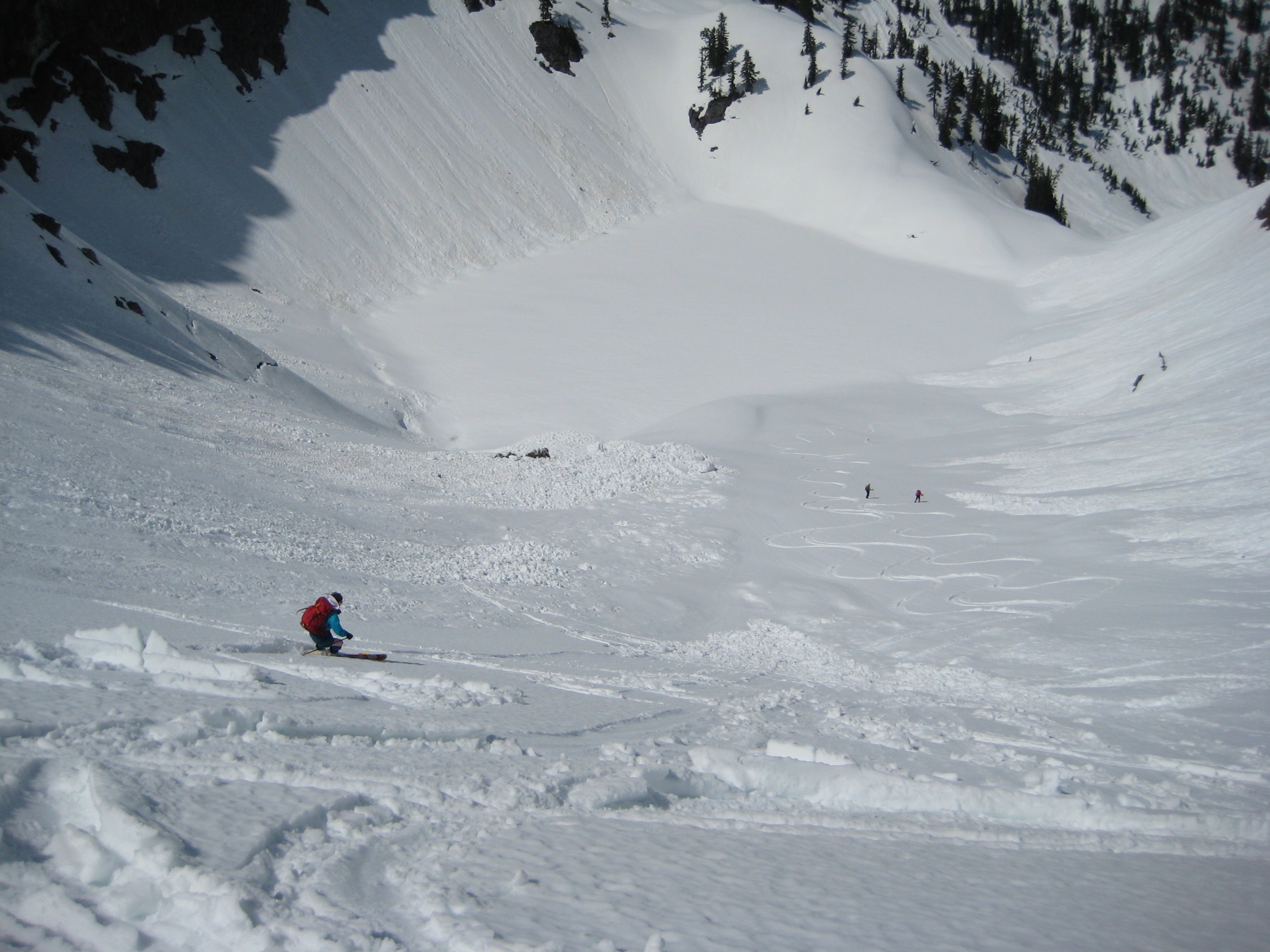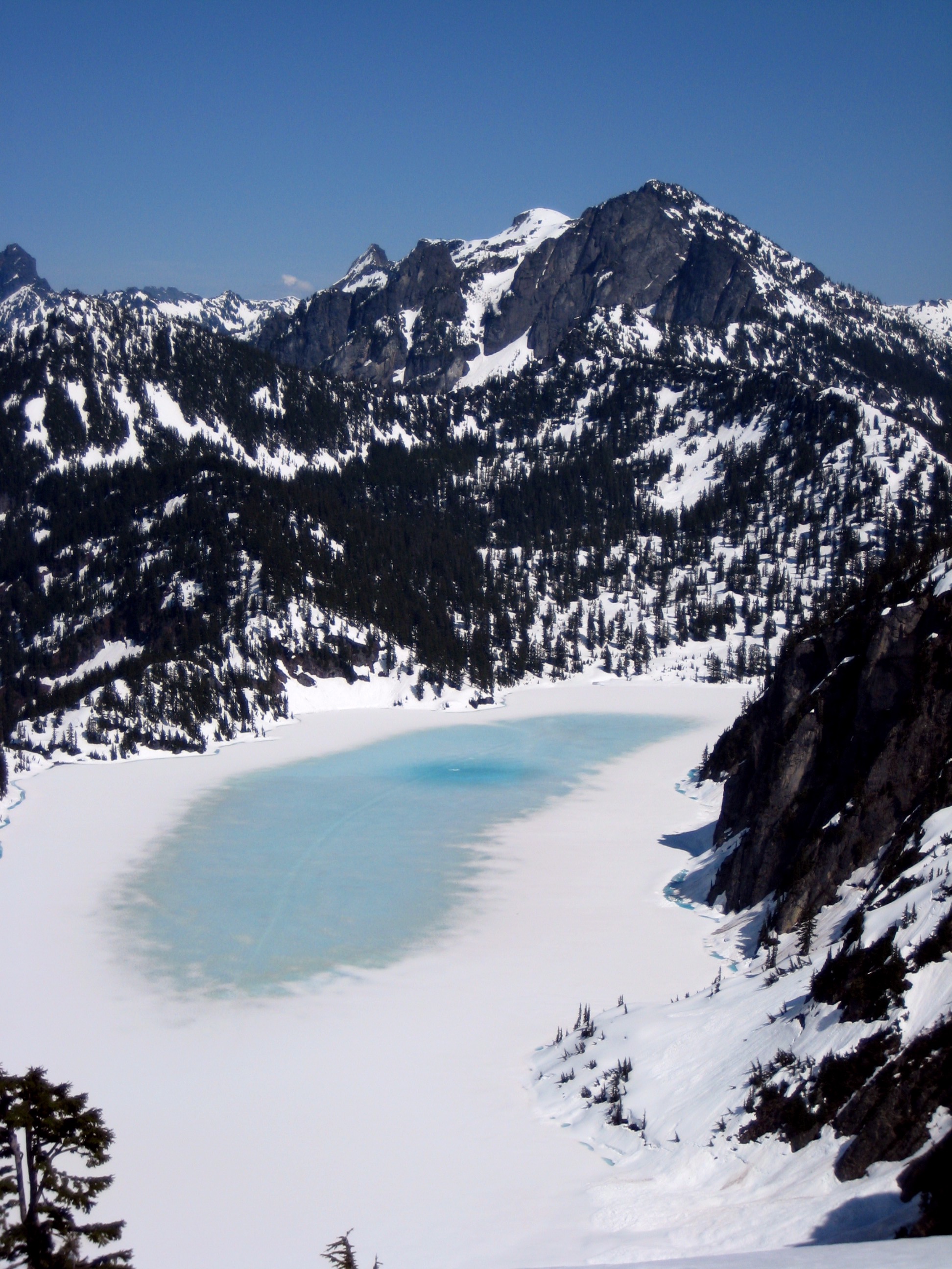 From Melakwa Pass, we skied due north down a moderately-angled couloir to tiny Chair Peak Lake. This couloir served up a of luscious soft-kernel corn over a firm base—quite likely the best snow I’ve had all season!