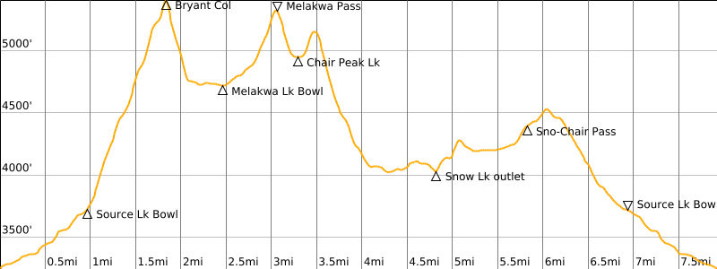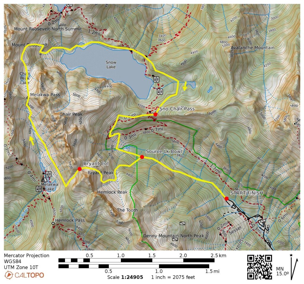 Way Points: Source Lake Bowl & Pineapple / Great Scott Basin & Bryant Col & Melakwa Valley & Melakwa Pass & Chair Peak Lake & Snow Lake & Sno-Chair Pass & Source Lake Bowl & upper Alpental parking lot (ski tour)