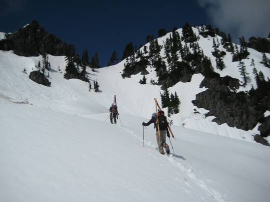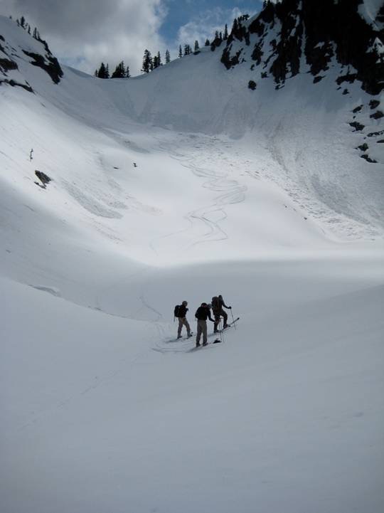 To reach 5450-foot Bryant Col, the high point of our loop, we ascended to Pineapple Basin on skis, traversed right at 4800 feet, booted up a steep chute (gingerly crossing a crux moat near the top), traversed right again, then skinned or booted up the final couloir. The sky had been partly cloudy all morning, but the air was becoming warm and the snow soft. This made us quite wary of wet-snow sloughs and slab releases.
