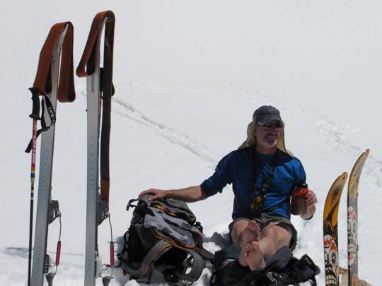 For this ski tour, I used my backcountry telemark touring setup, which comprises telemark skis with a fishscale base, along with plastic telemark boots and full-length climbing skins. Alpine touring (AT, or randonnee) skis and boots can also be used, of course. Having a backpack that readily carries skis was critical for all of us. I should also mention that none of us had an ice axe, but we all wished that we did.