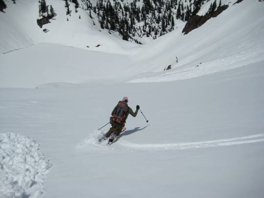 As we dropped over the other side of the pass, the sun-broiled surficial snow layer readily peeled away and slid several hundred feet downslope. Yikes! These slides were shallow but still somewhat unnerving, so we created a stable slide swath by making ski cuts across the head of the couloir. This did the trick, leaving us with a fun descent to Chair Peak Lake.