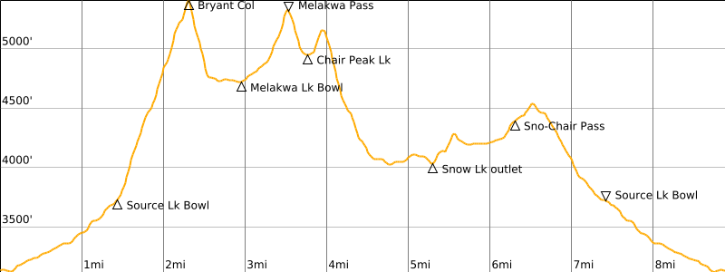 Way Points: upper Alpental parking lot (road walk); Source Lake Bowl & Pineapple / Great Scott Basin & Bryant Col & Melakwa Valley & Melakwa Pass & Chair Peak Lake & Snow Lake & Sno-Chair Pass & Source Lake Bowl & upper Alpental parking lot (ski tour); main Alpental parking lot (road walk)