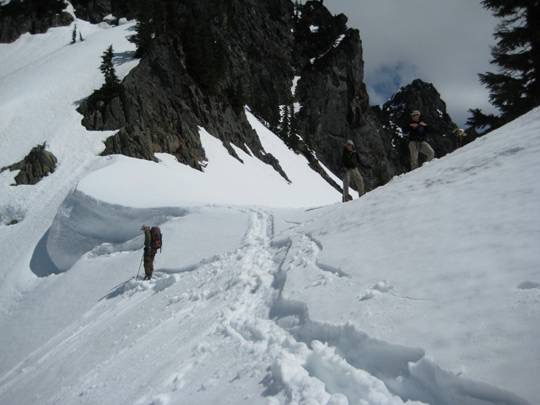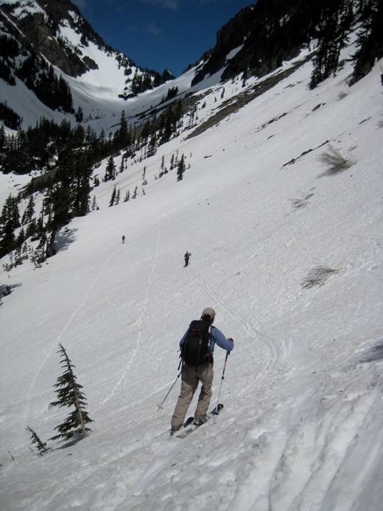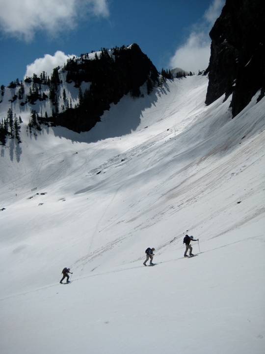 We enjoyed a 700-foot ski descent from Bryant Col to the Melakwa Lake basin, then cut sharply right to begin a long rising traverse northward to Melakwa Pass. It was now early afternoon and very warm.