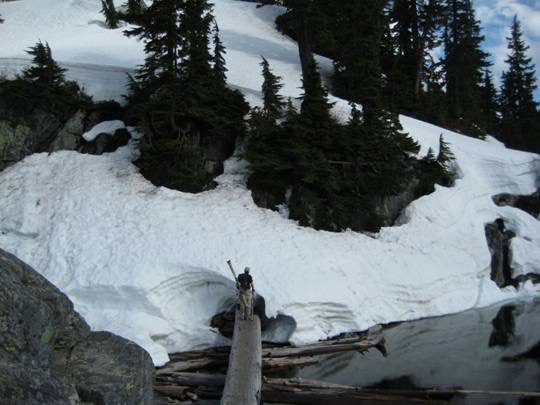 This was scenic and only mildly tedious, but it required us to deal with another terrain problem: the lake outlet. Here, the challenge involved surmounting an undercut snowbank at the far end of the foot log. If we’d had ice axes and light packs, it would have been difficult enough; the fact that we were armed only with ski poles and were wielding floppy skis on our packs made this all the more sporting.