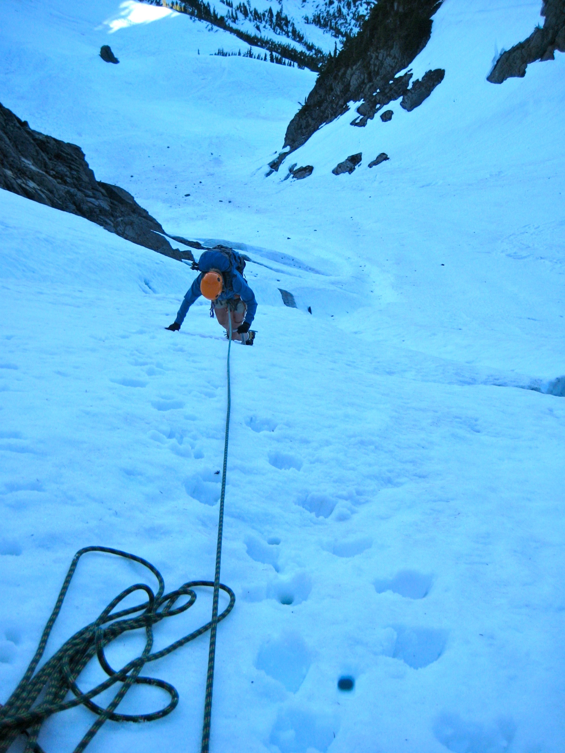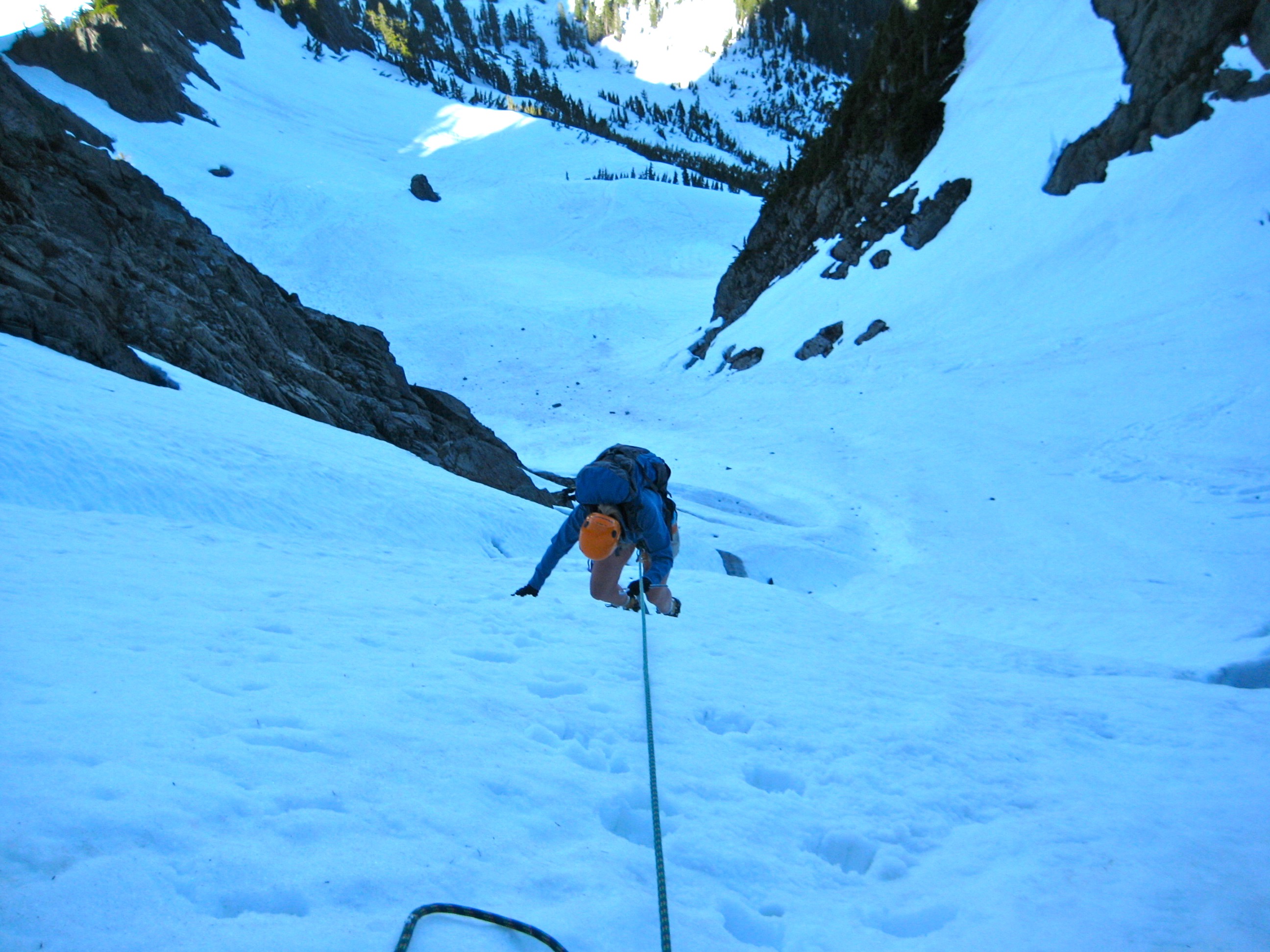 There are actually two Southeast Chimneys side by side, but the standard route follows the southern one, which is well-marked with rappel slings. We made two single-rope rappels down the drippy, dank chimney, then a third rappel down the steep, narrow snowfinger below it.