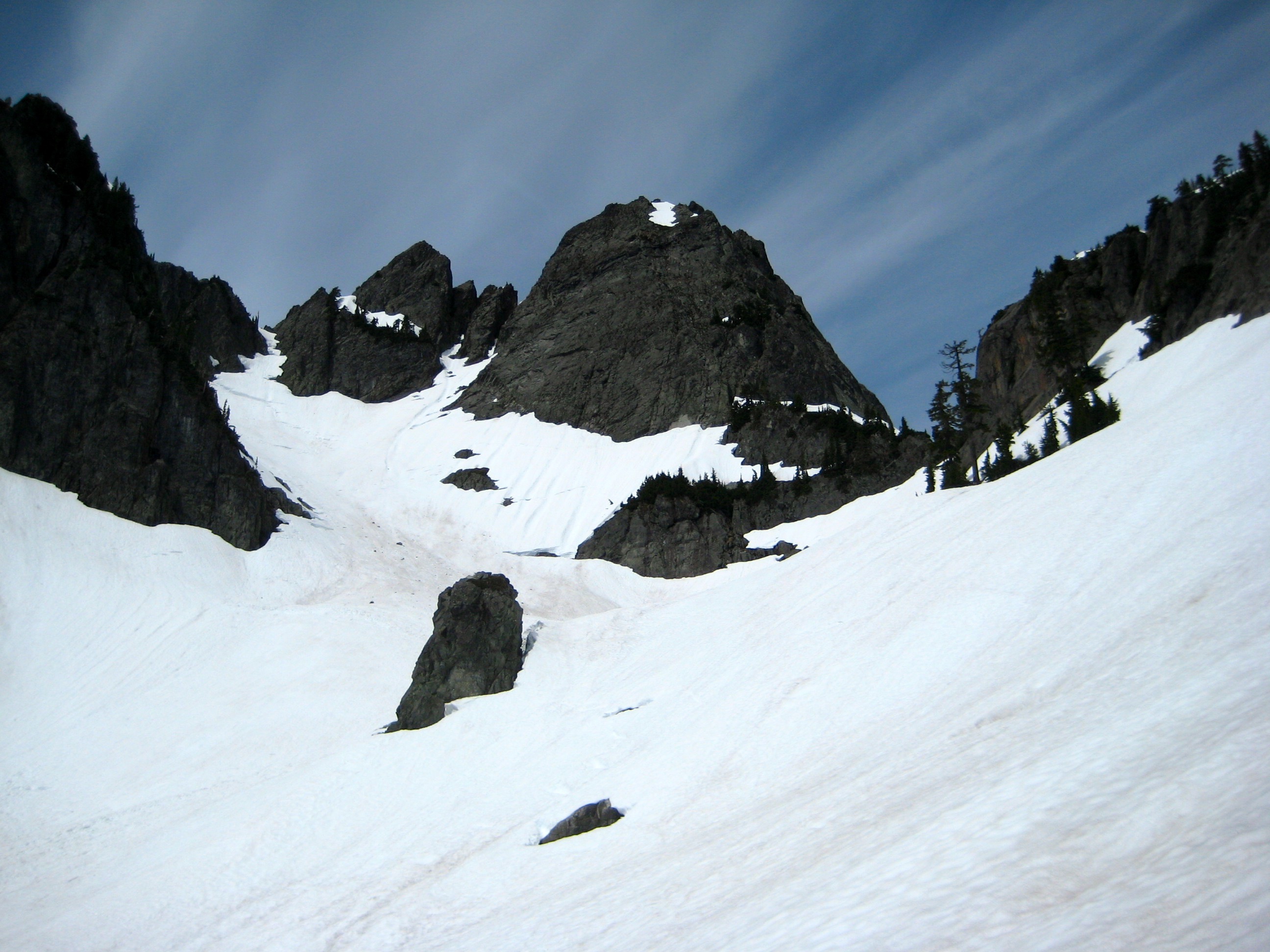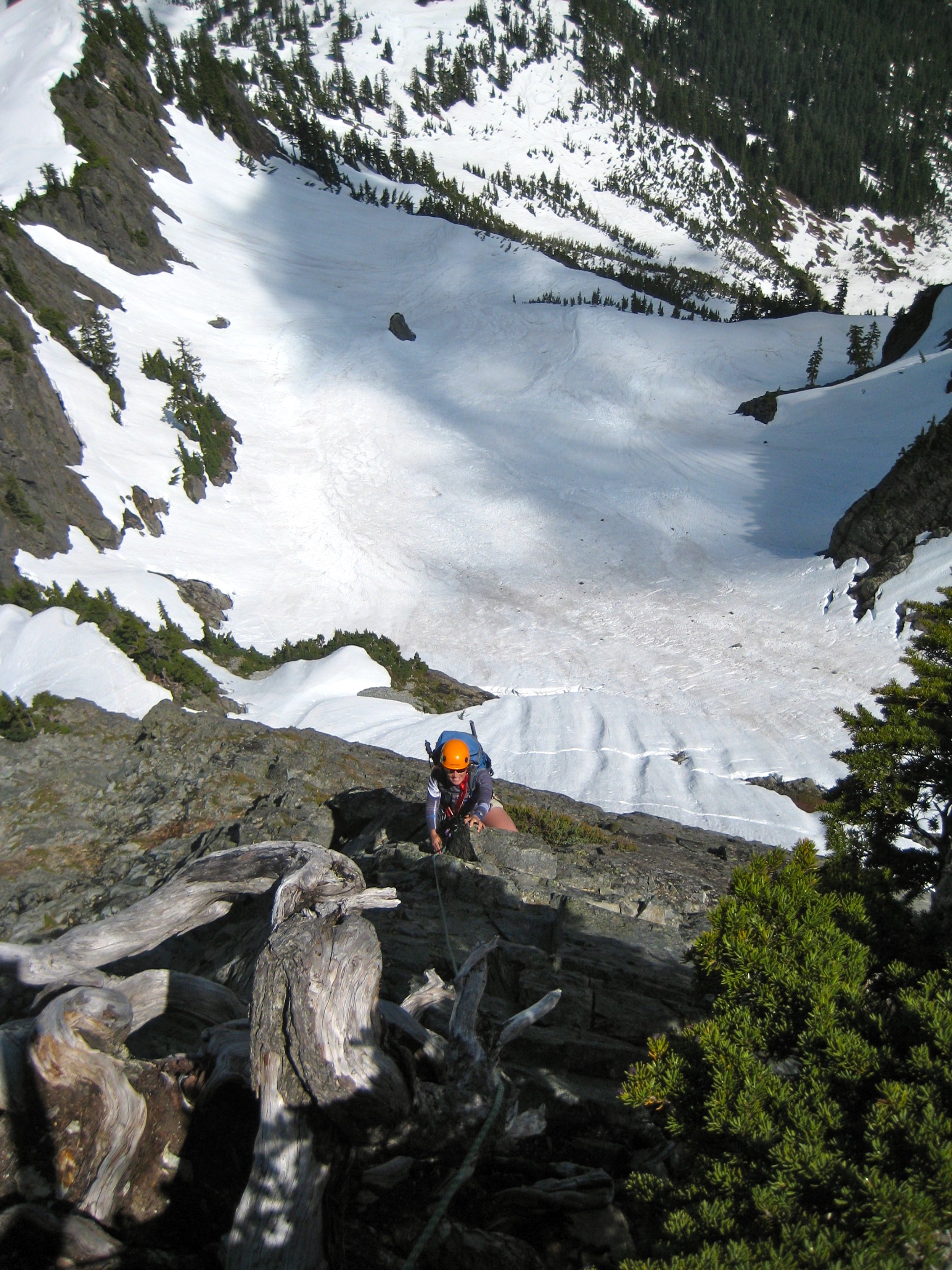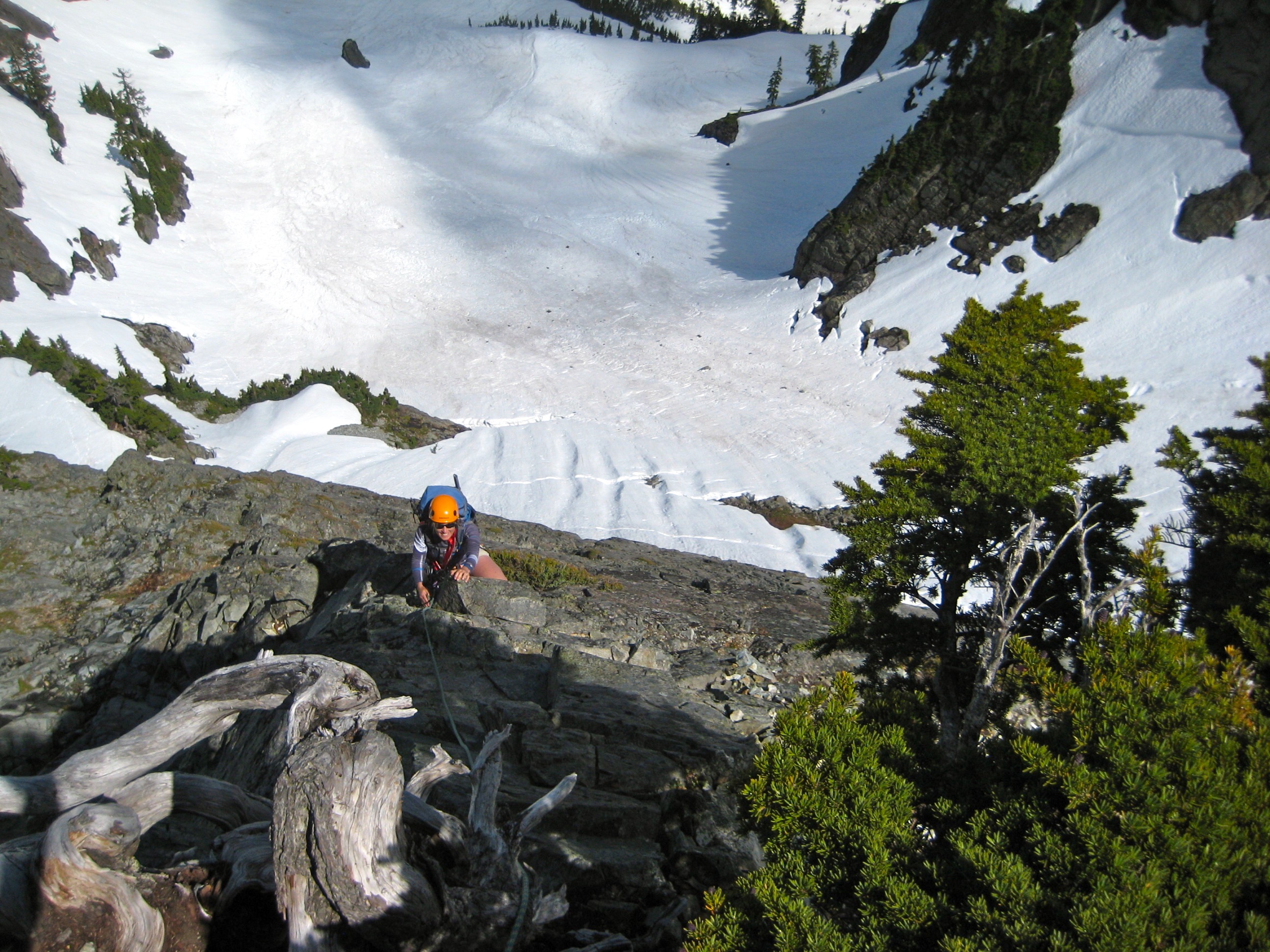 From Alpental, we hiked up the Snow Lakes Trail to Sno-Chair Pass, then traversed solid snow slopes over to the Footstool, then went up steeper snow, some rock, and a moat to reach the buttress base. This route starts up a shallow groove that offers Class 3-4 scrambling on surprisingly firm rock, then enters a short stretch of trees and heather. After that, things get interesting and fun.