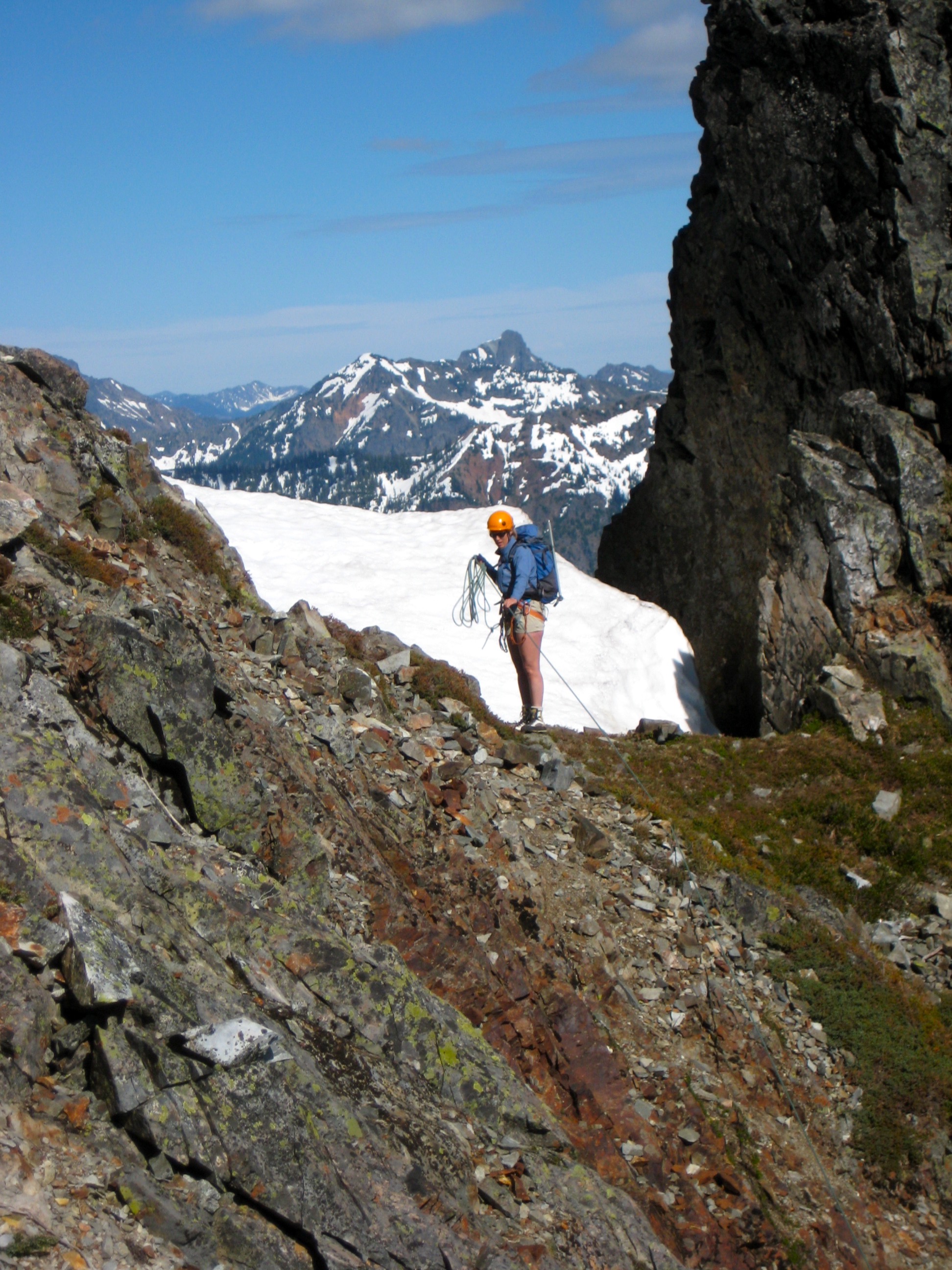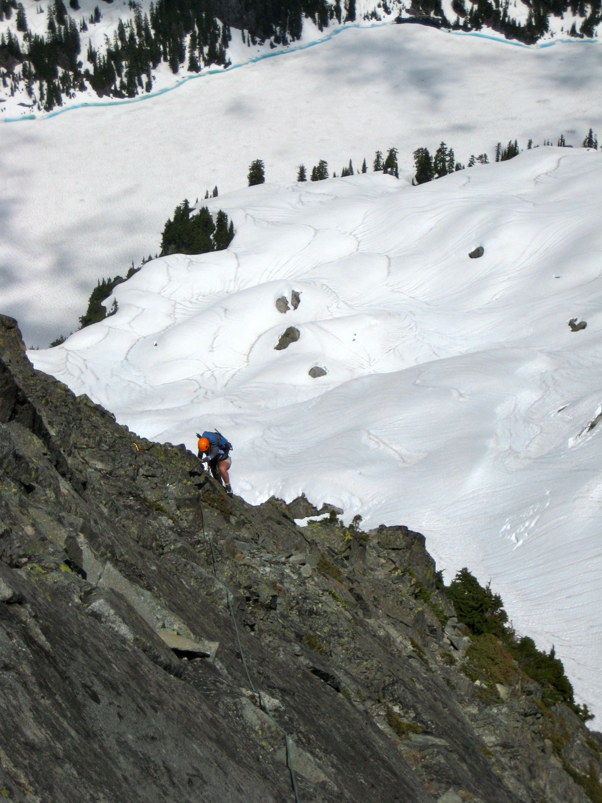 For such a popular peak, we were surprised to encounter only one climber (soloing) on the Northeast Buttress and no other climbers on the summit or anywhere in view. Perhaps the late snowpack is tending to delay the summer rock-climbing season.