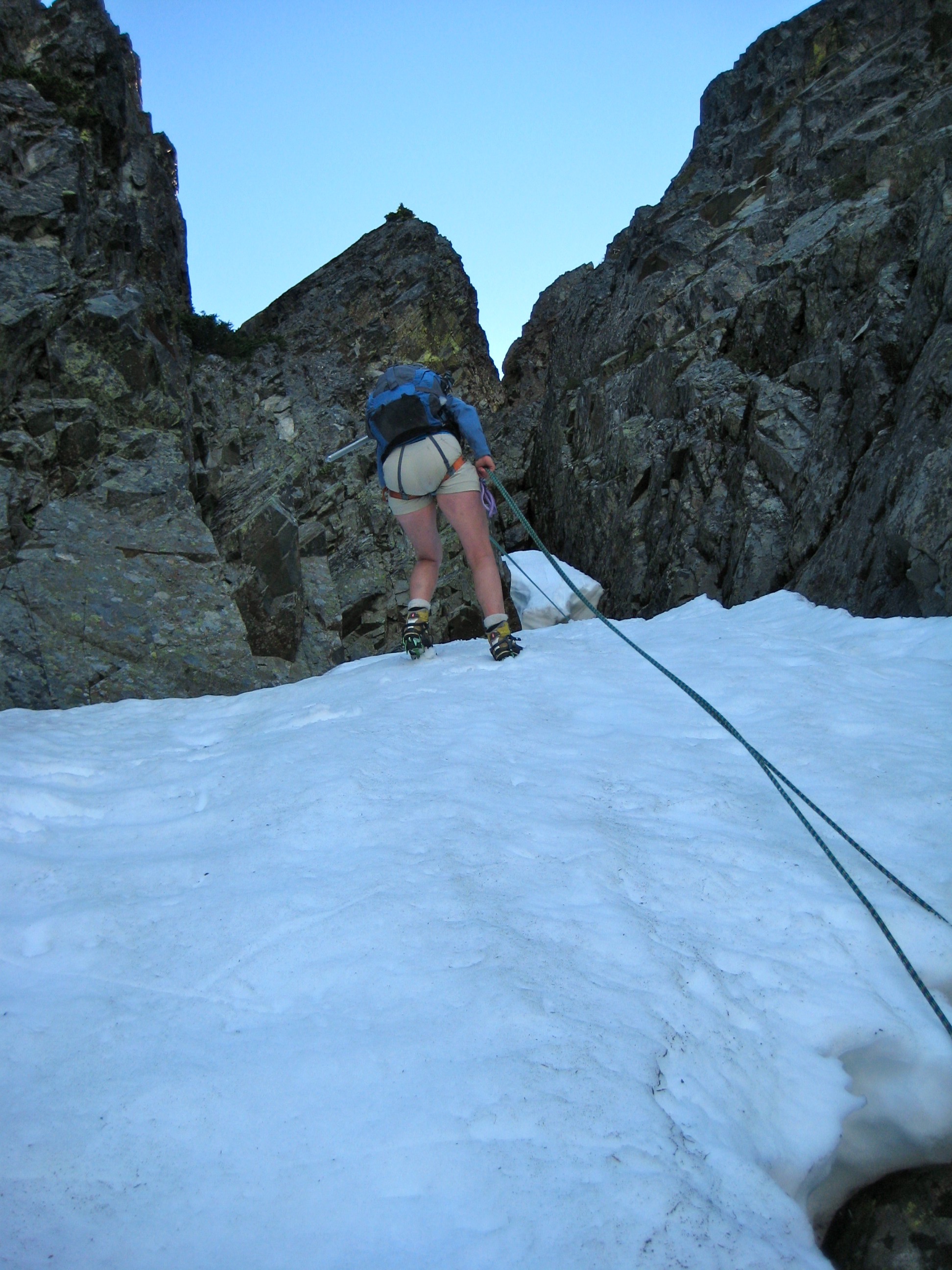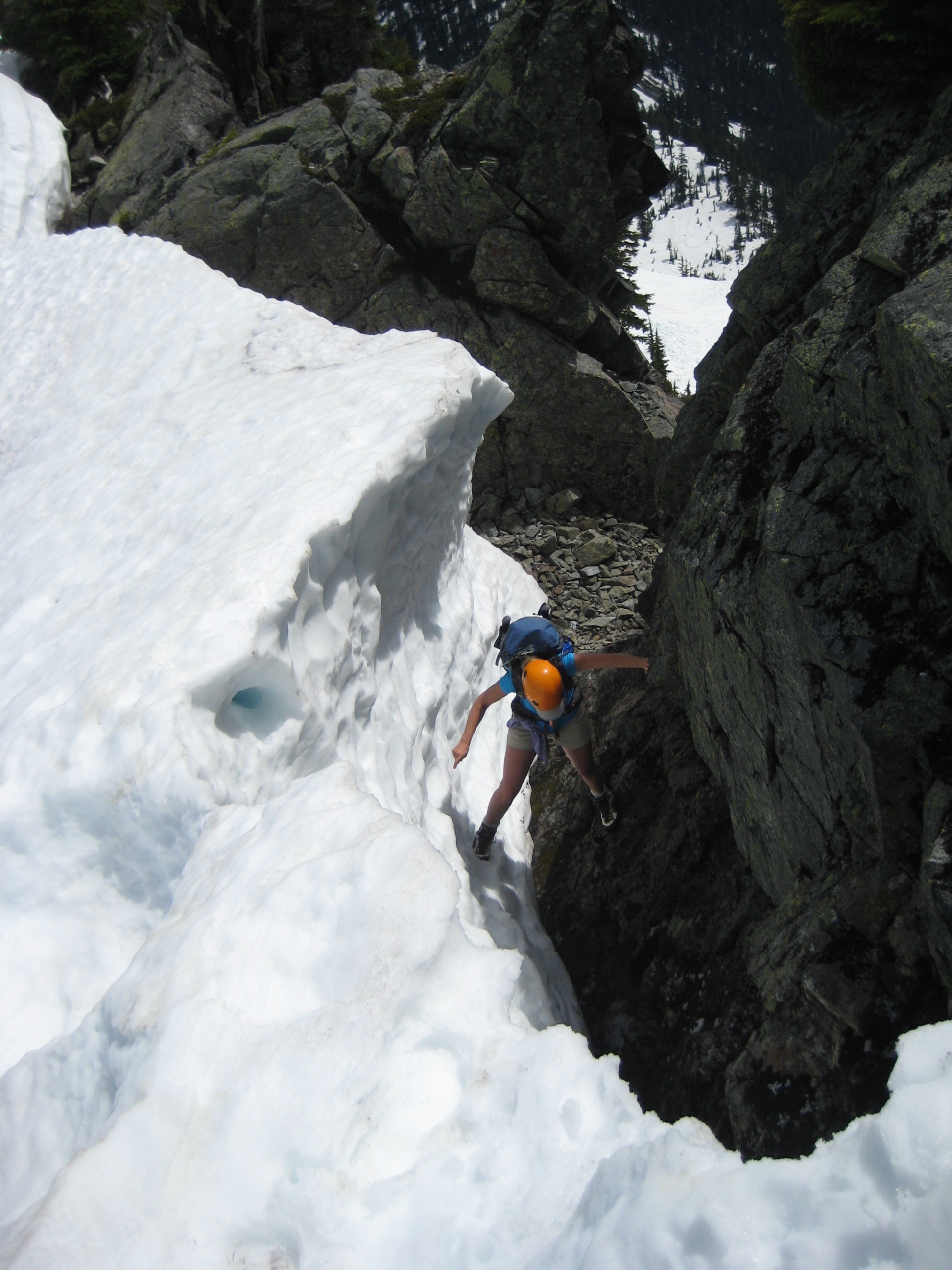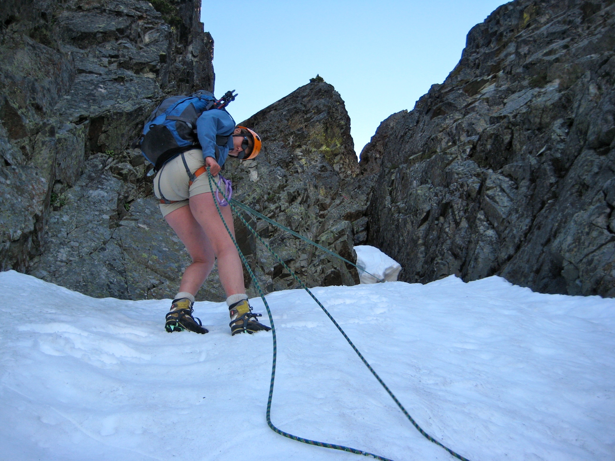 Setting up for the third rappel gave us some nervous moments because we had to put on crampons while standing in a narrow moat directly underneath a minivan-size snow block. I feared that a loud sneeze might bring the block crashing down on us! Once off the final rappel, we did a full-length roped downclimb of the lower snowfinger to get past several ominous snow breaches.