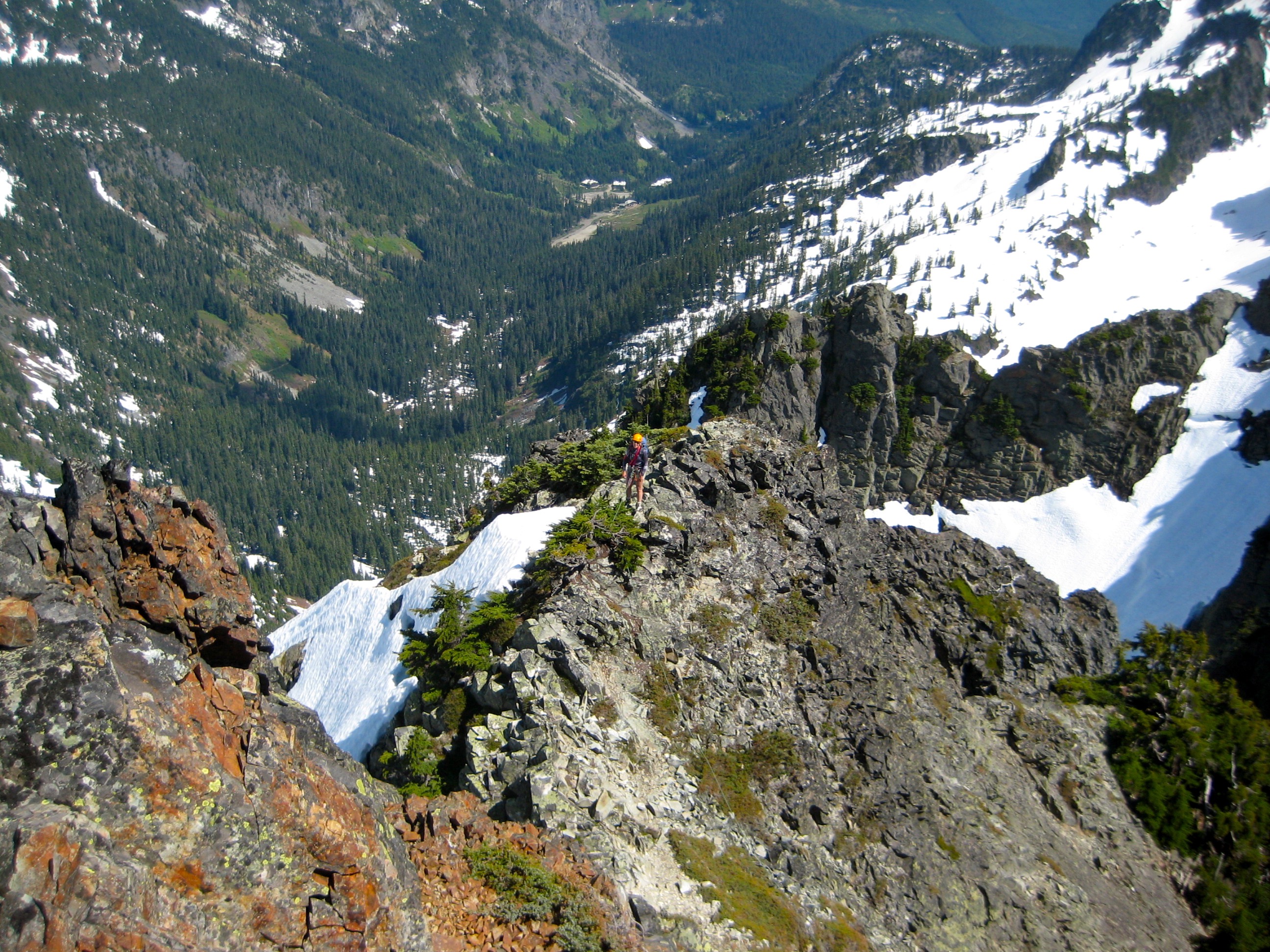 Up to this point, we had belayed the route pitch by pitch, just out of caution. From here on, we did running belays up an enjoyable, well-broken, and highly exposed Class 3 rib immediately left of the large summit snowfield. A ridge traverse led us to the summit (6.2 hours from car).