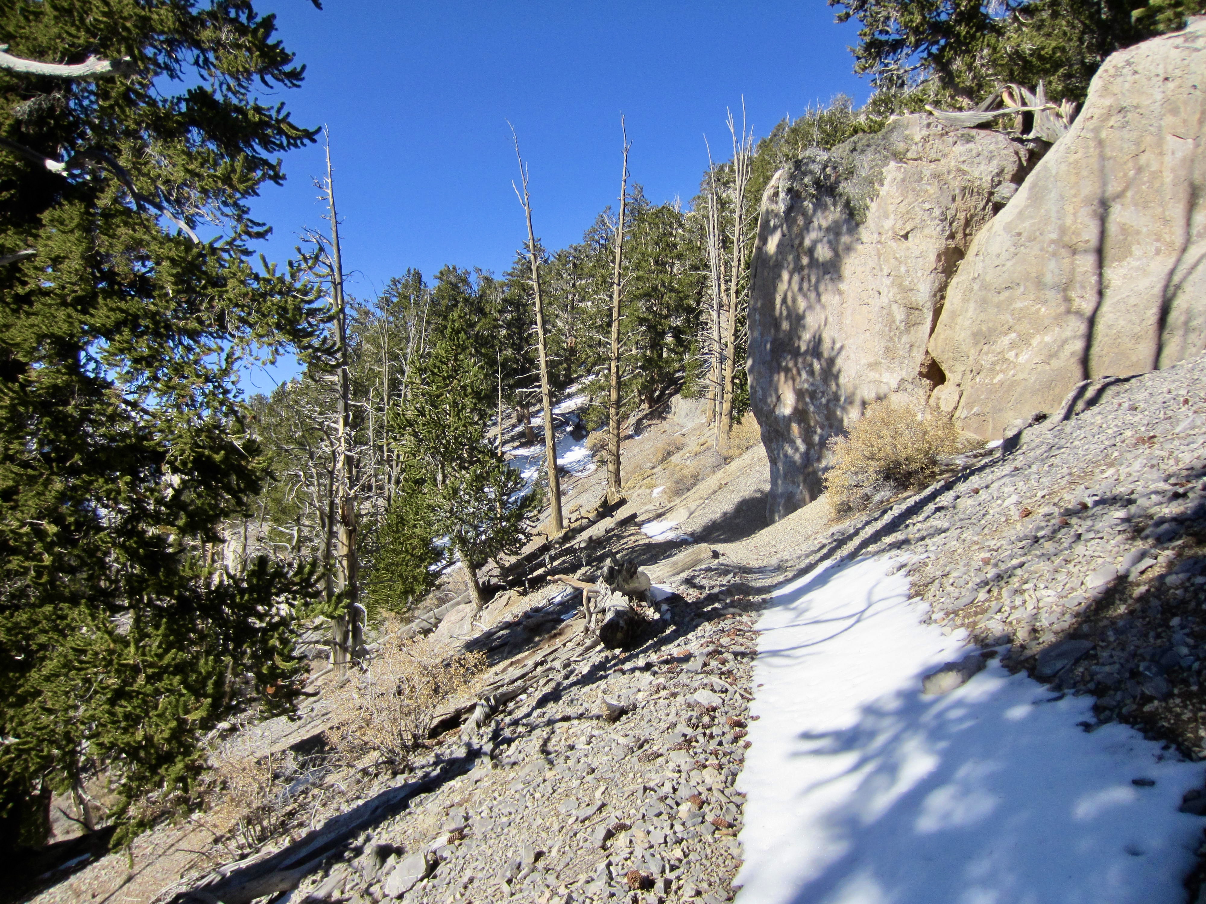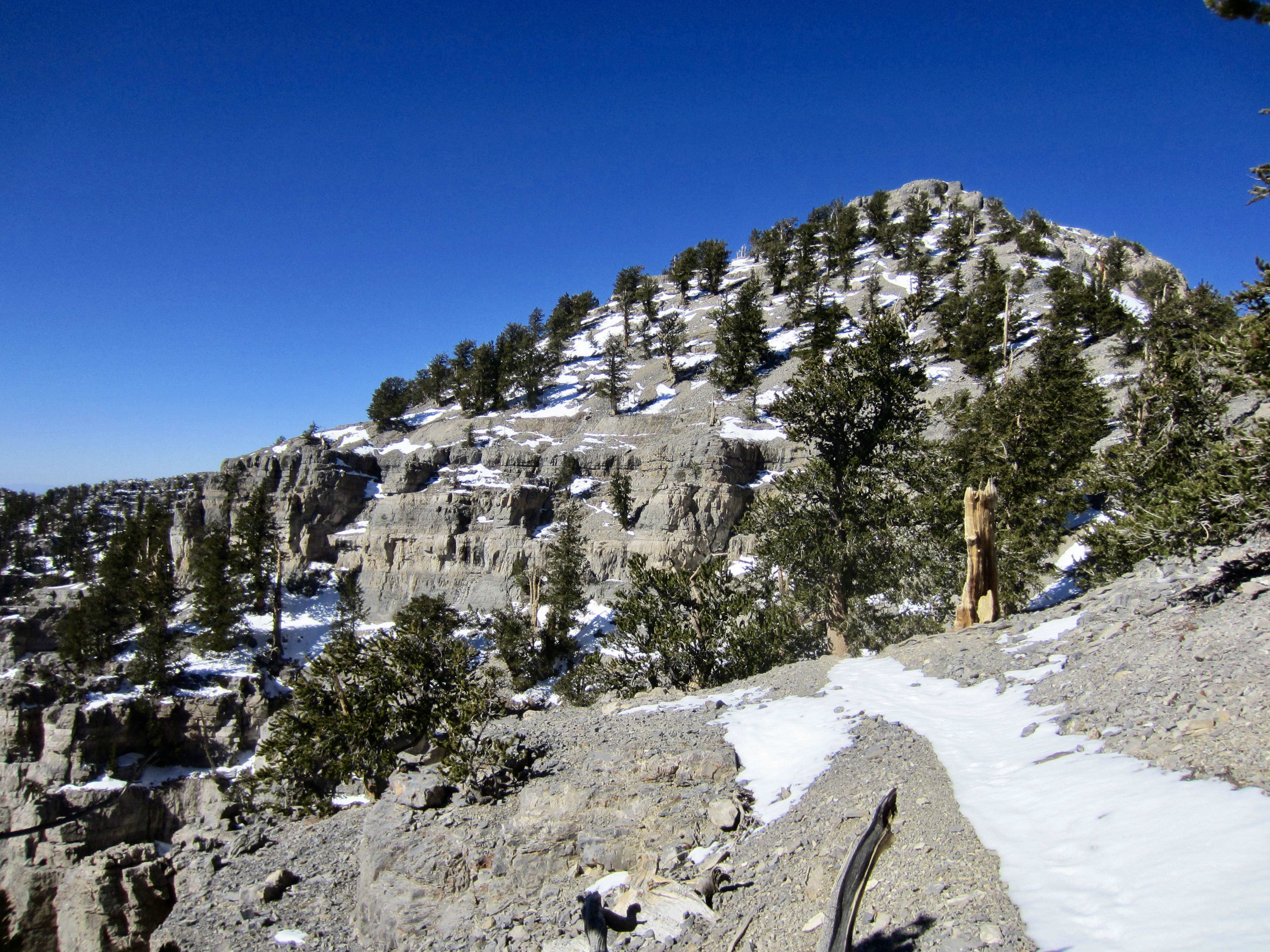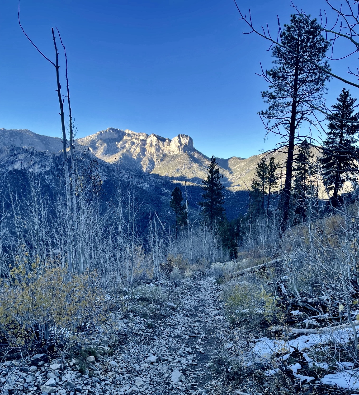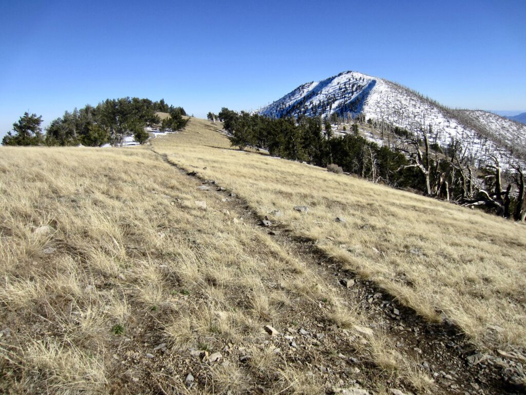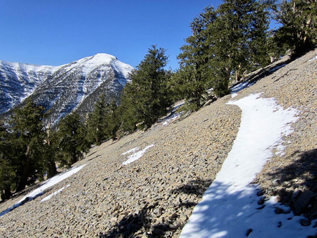 Leaving Mummy Pass on a chilly Monday morning, I followed the North Loop Trail on a rising traverse across the head of Trail Canyon. The broad summit of Charleston Peak came into view through the trees, and its snowy slopes stood in sharp contrast to the vivid blue sky. I could clearly see the trail switchbacking up the peak’s east slope, but it looked discouragingly far away.
