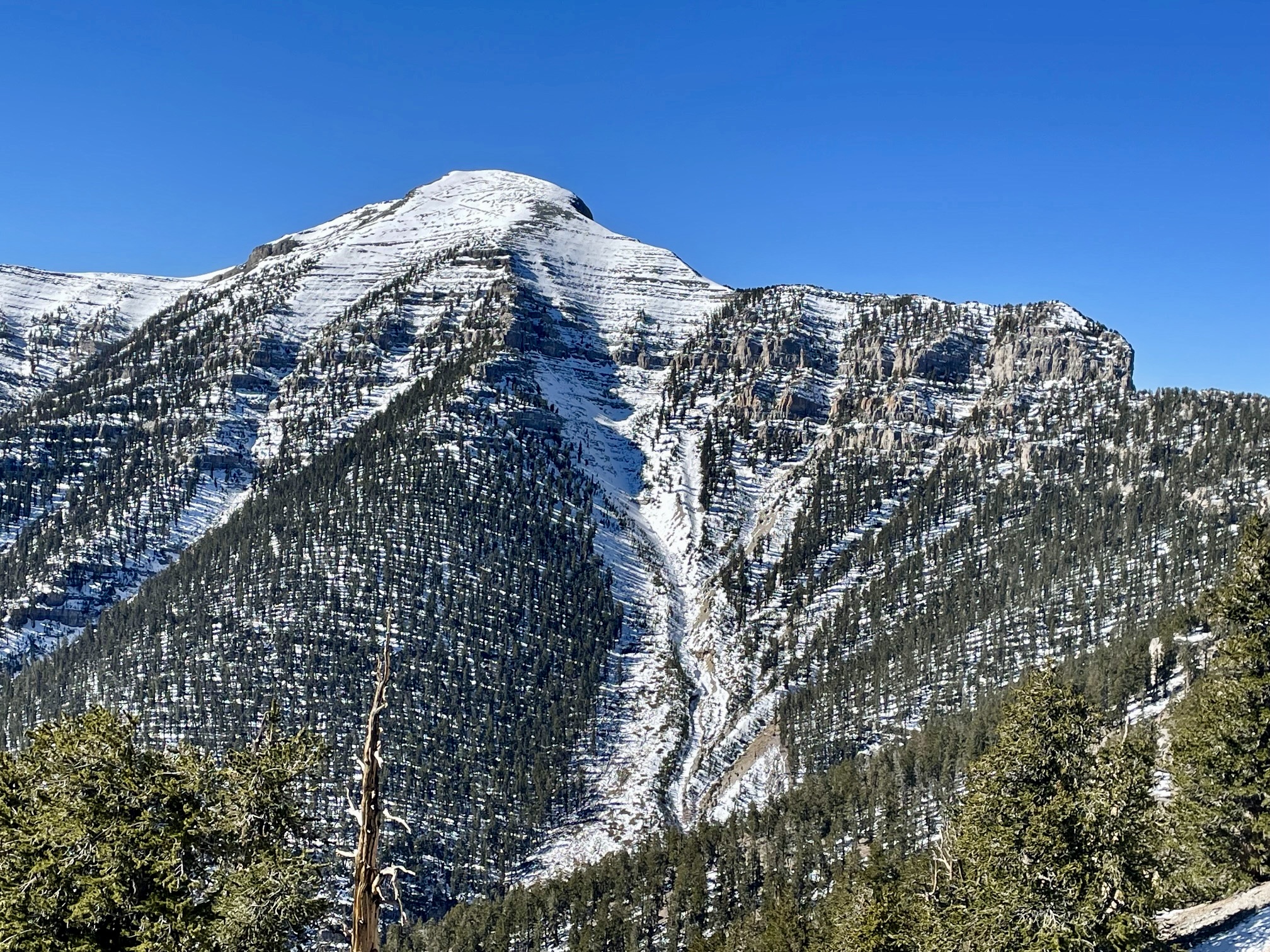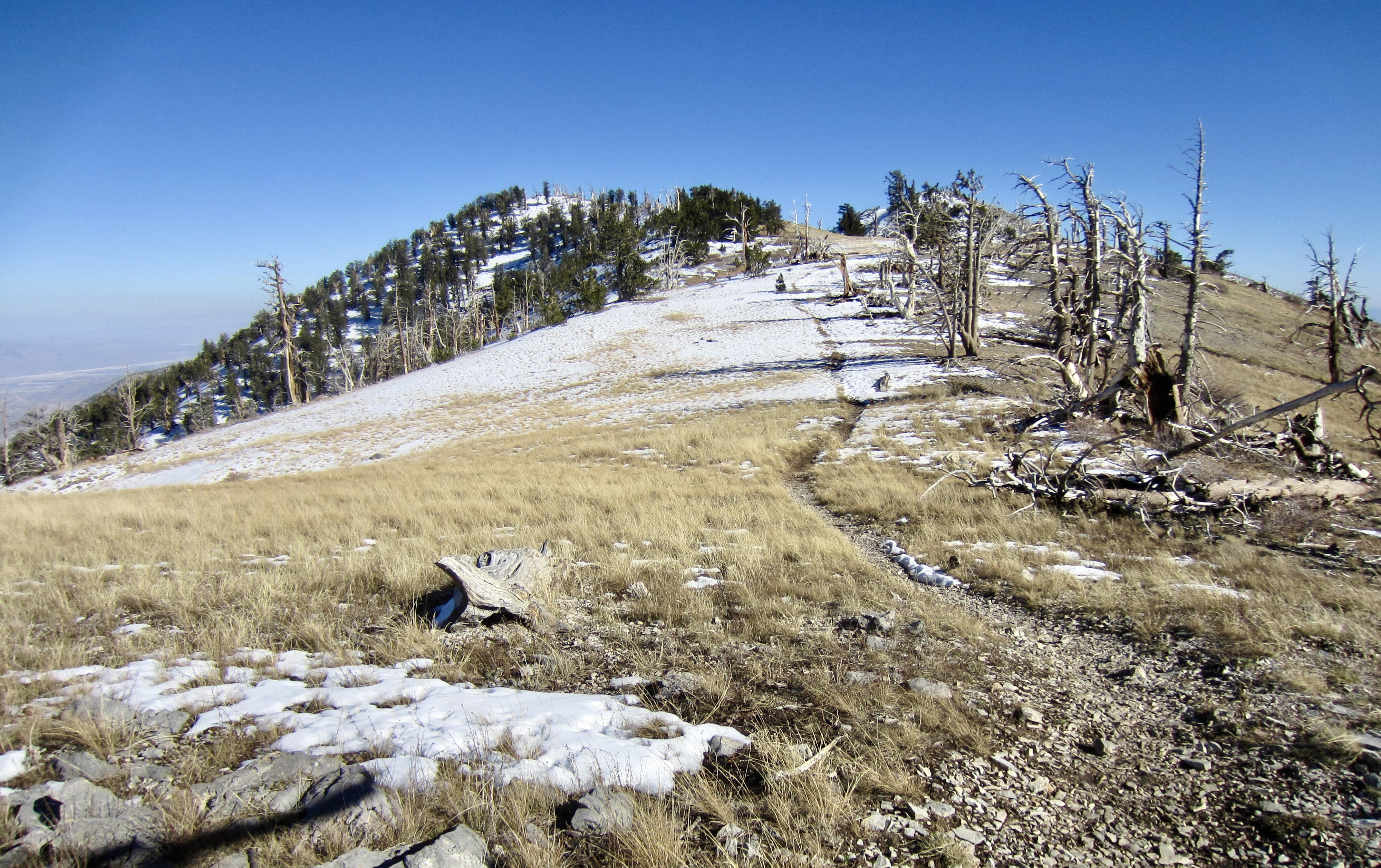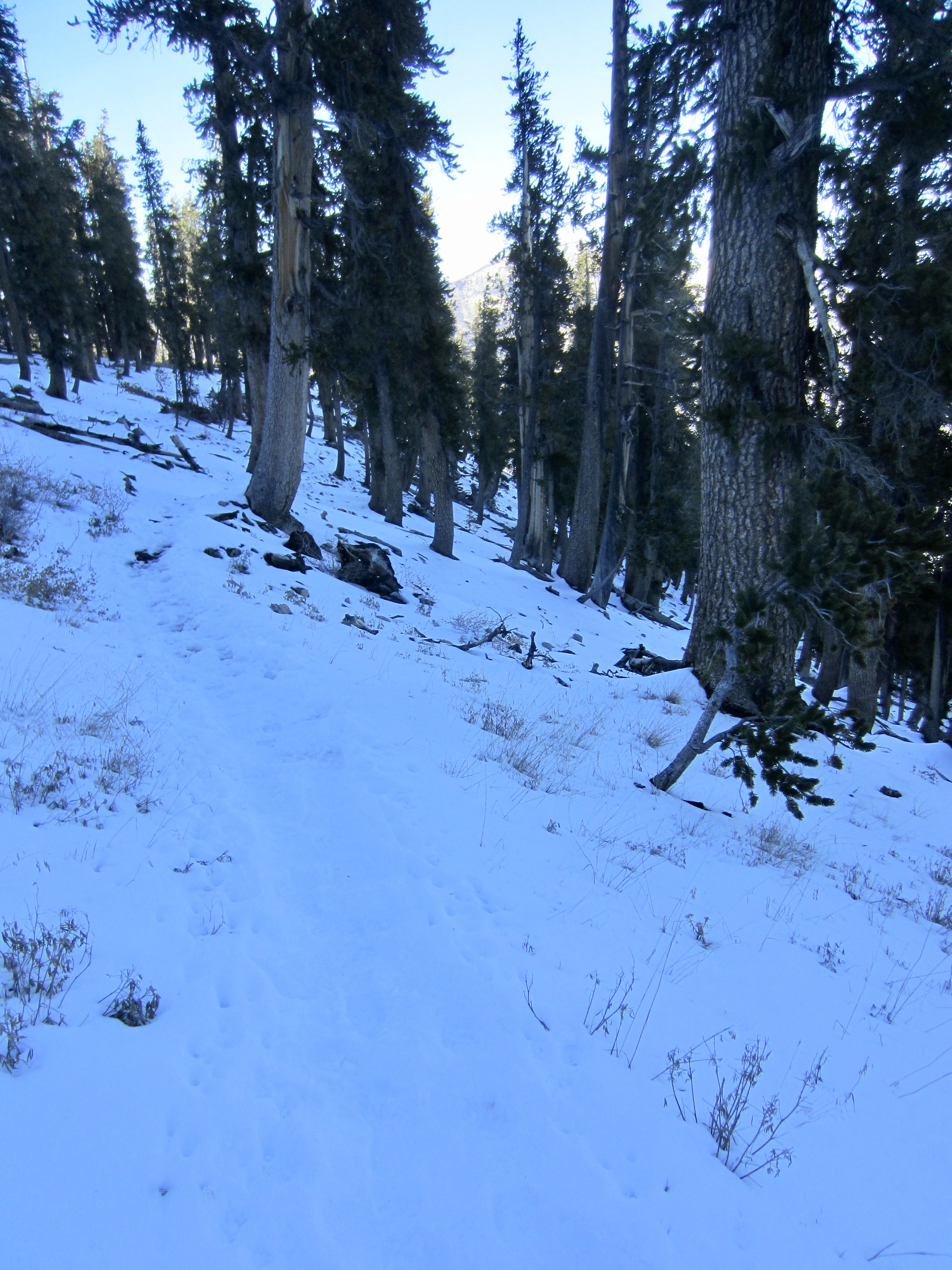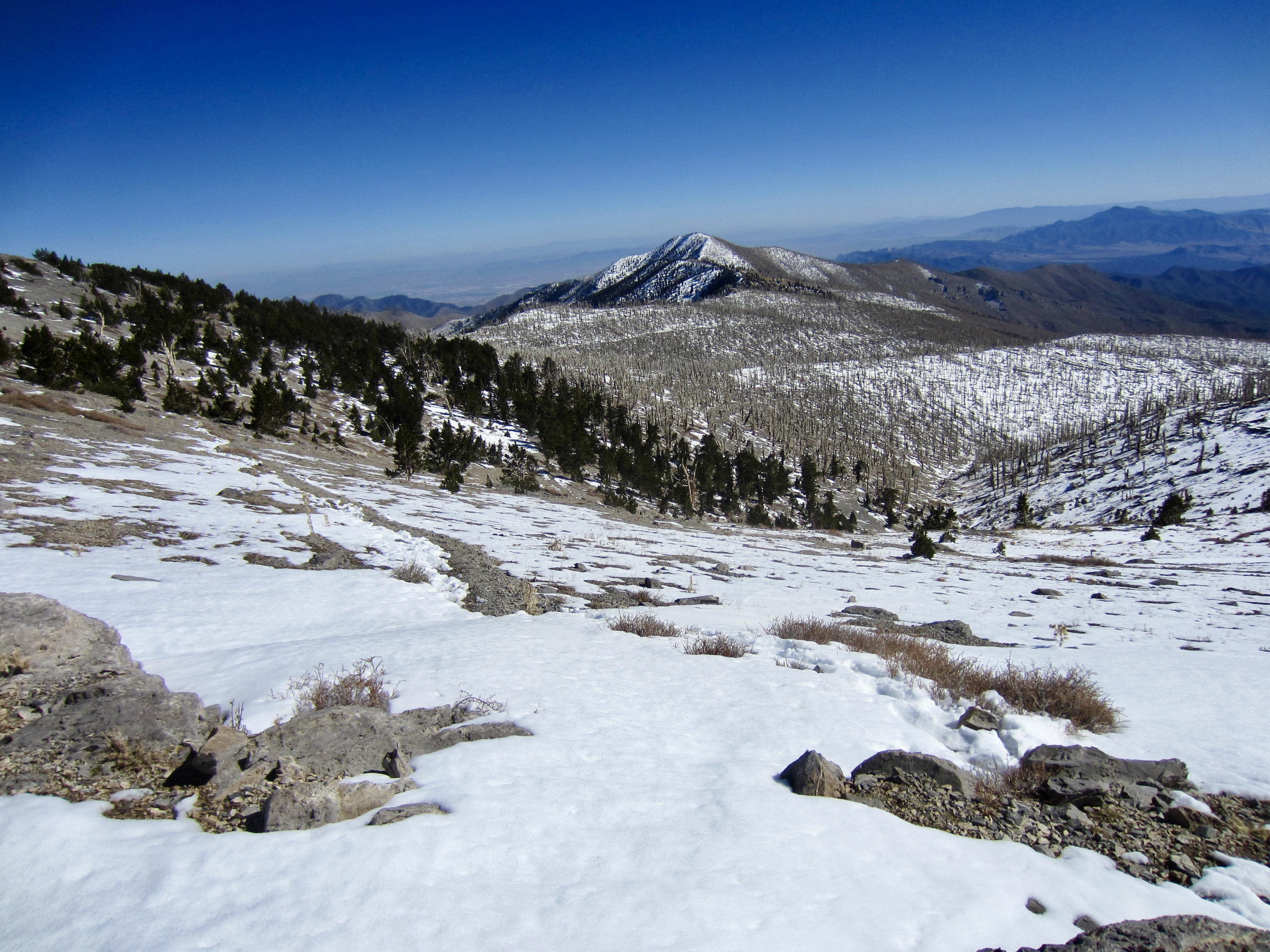 Leaving Mummy Pass on a chilly Monday morning, I followed the North Loop Trail on a rising traverse across the head of Trail Canyon. The broad summit of Charleston Peak came into view through the trees, and its snowy slopes stood in sharp contrast to the vivid blue sky. I could clearly see the trail switchbacking up the peak’s east slope, but it looked discouragingly far away.