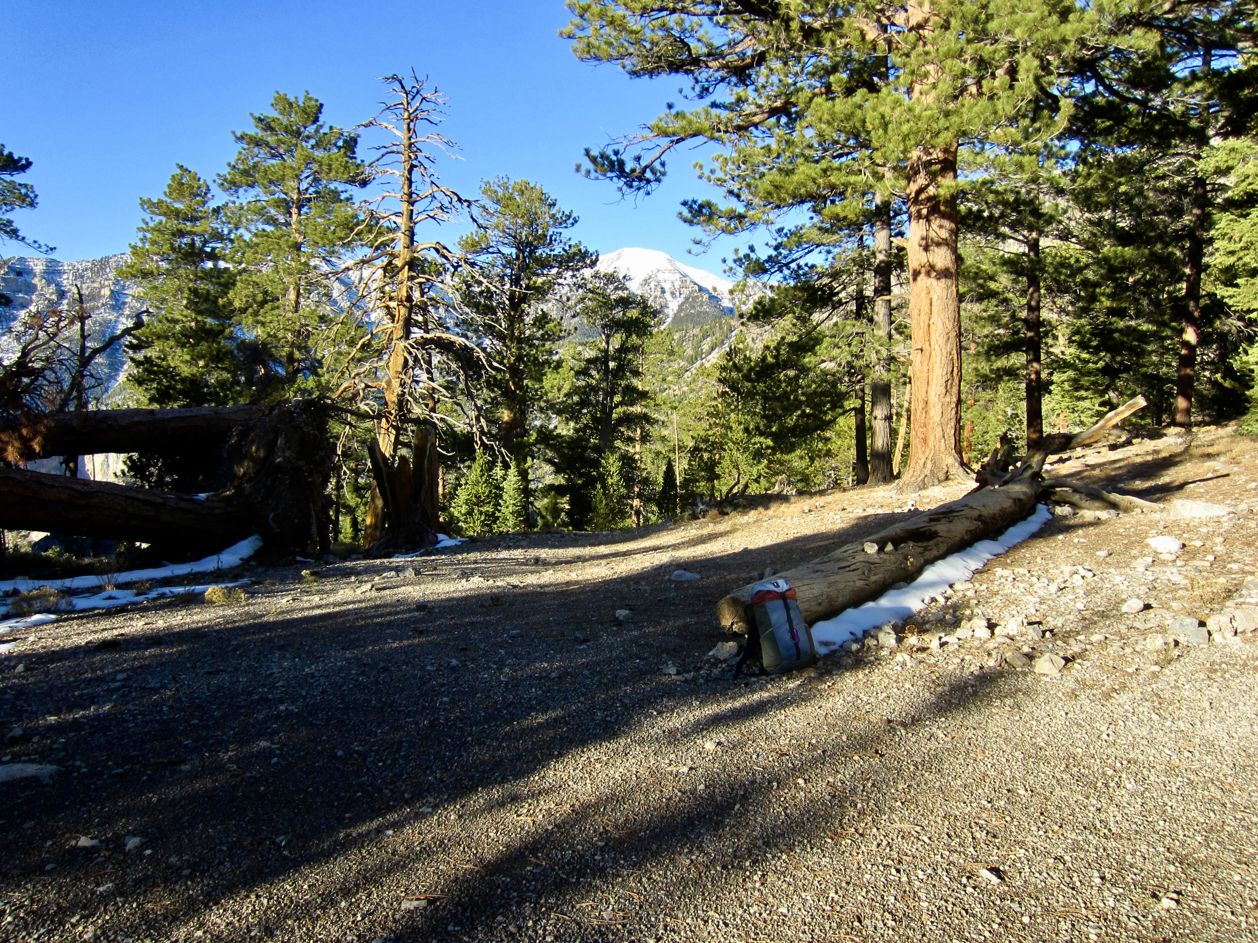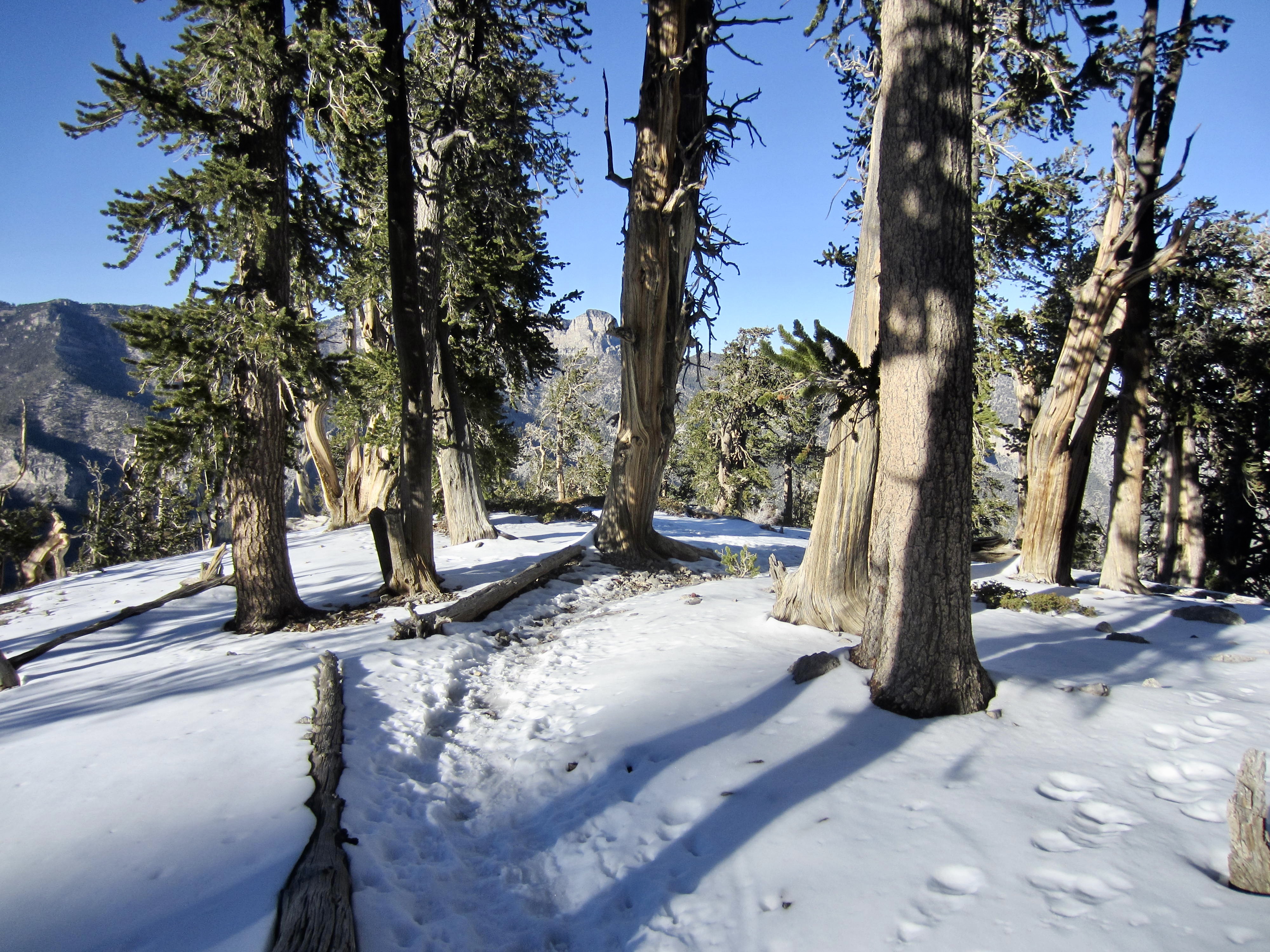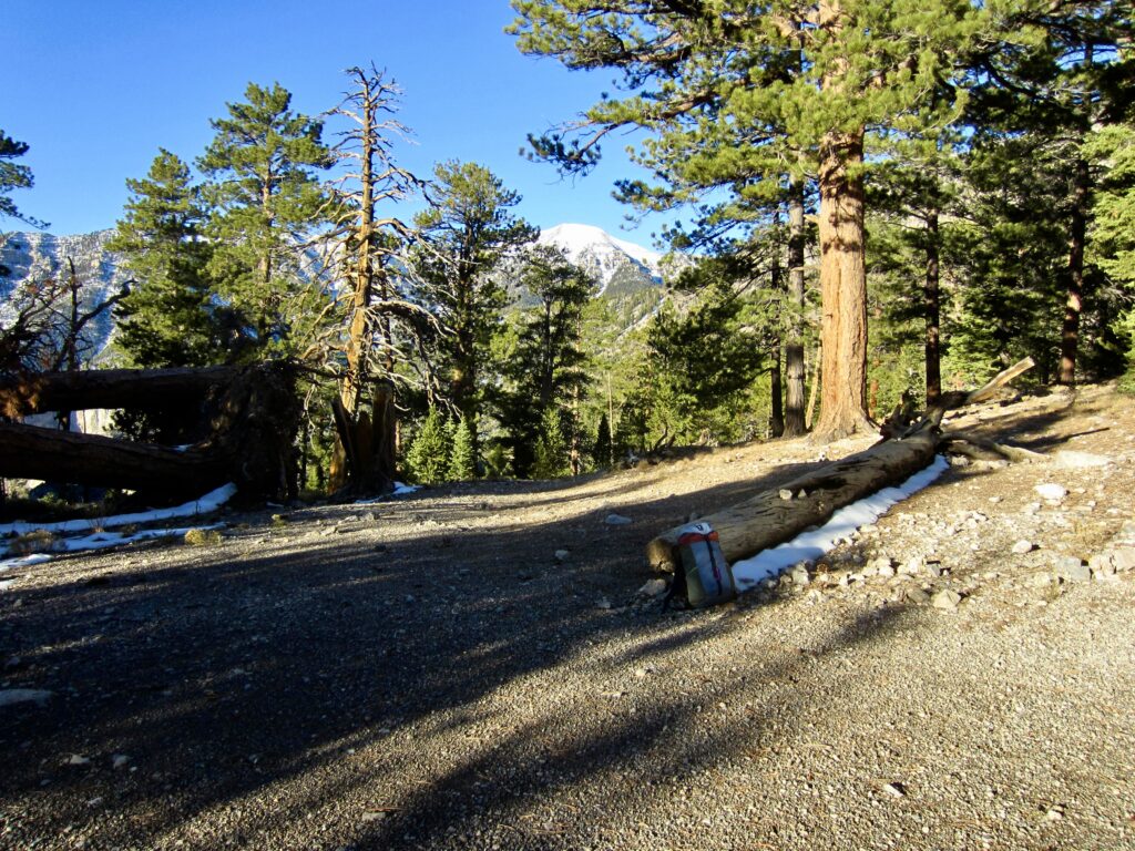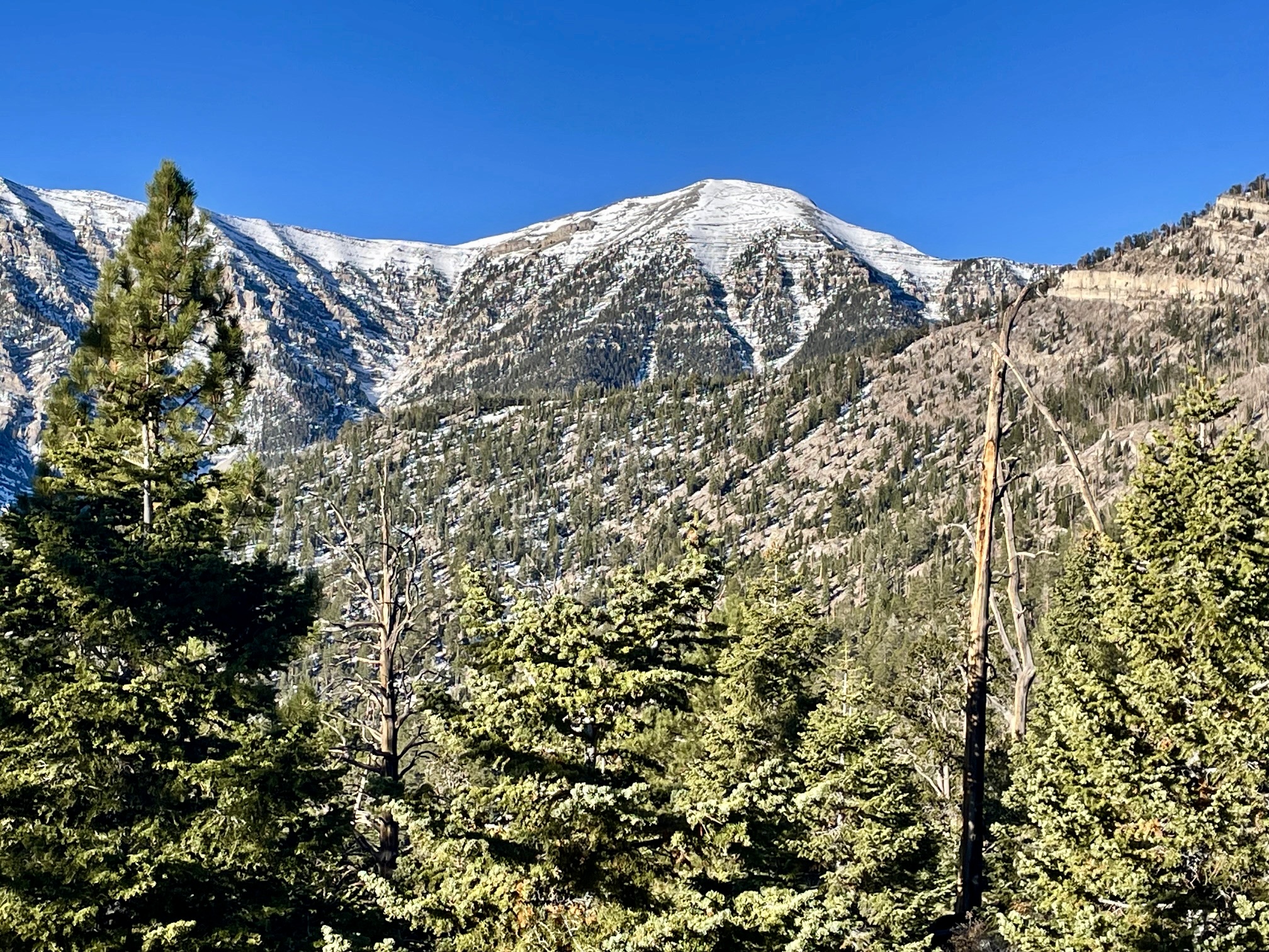 Leaving Mummy Pass on a chilly Monday morning, I followed the North Loop Trail on a rising traverse across the head of Trail Canyon. The broad summit of Charleston Peak came into view through the trees, and its snowy slopes stood in sharp contrast to the vivid blue sky. I could clearly see the trail switchbacking up the peak’s east slope, but it looked discouragingly far away.