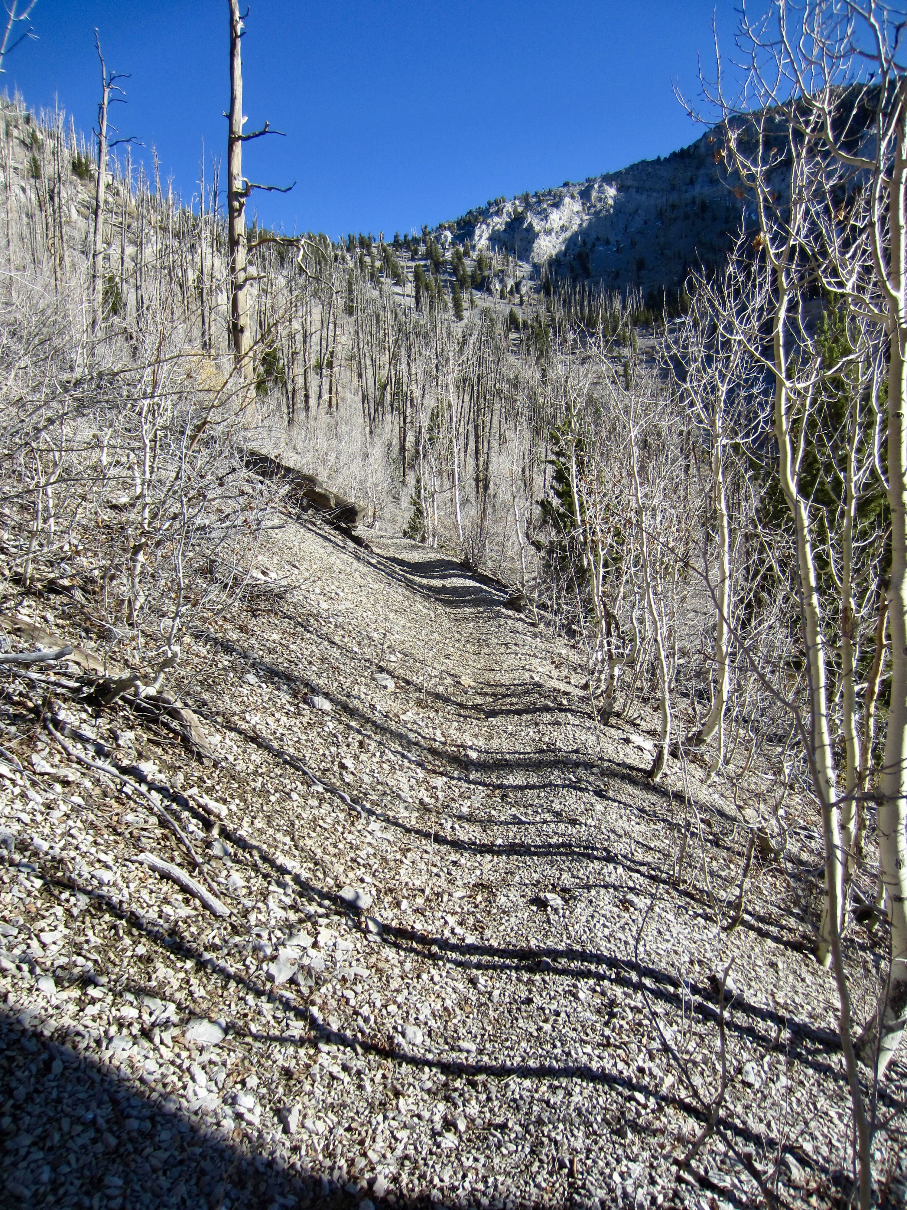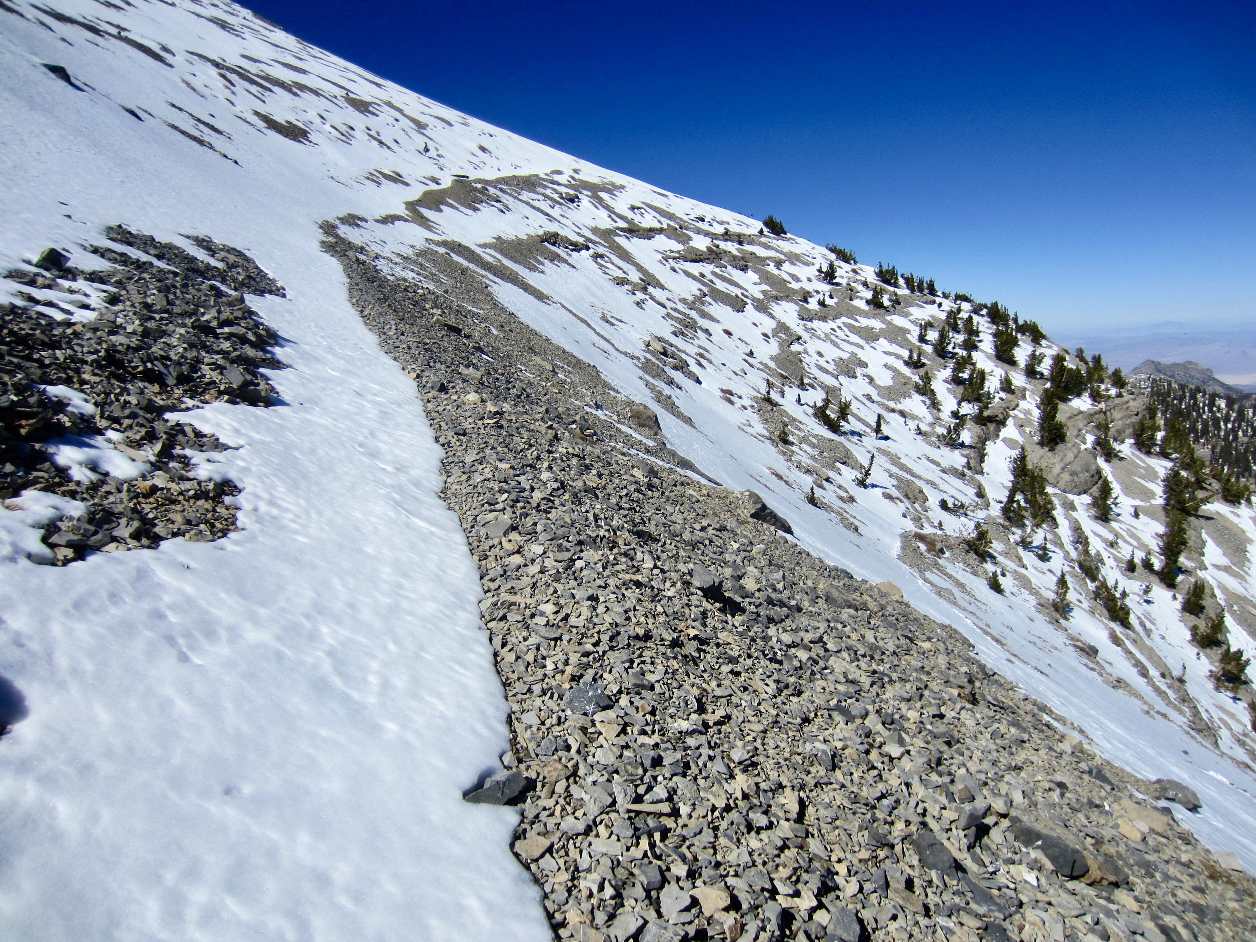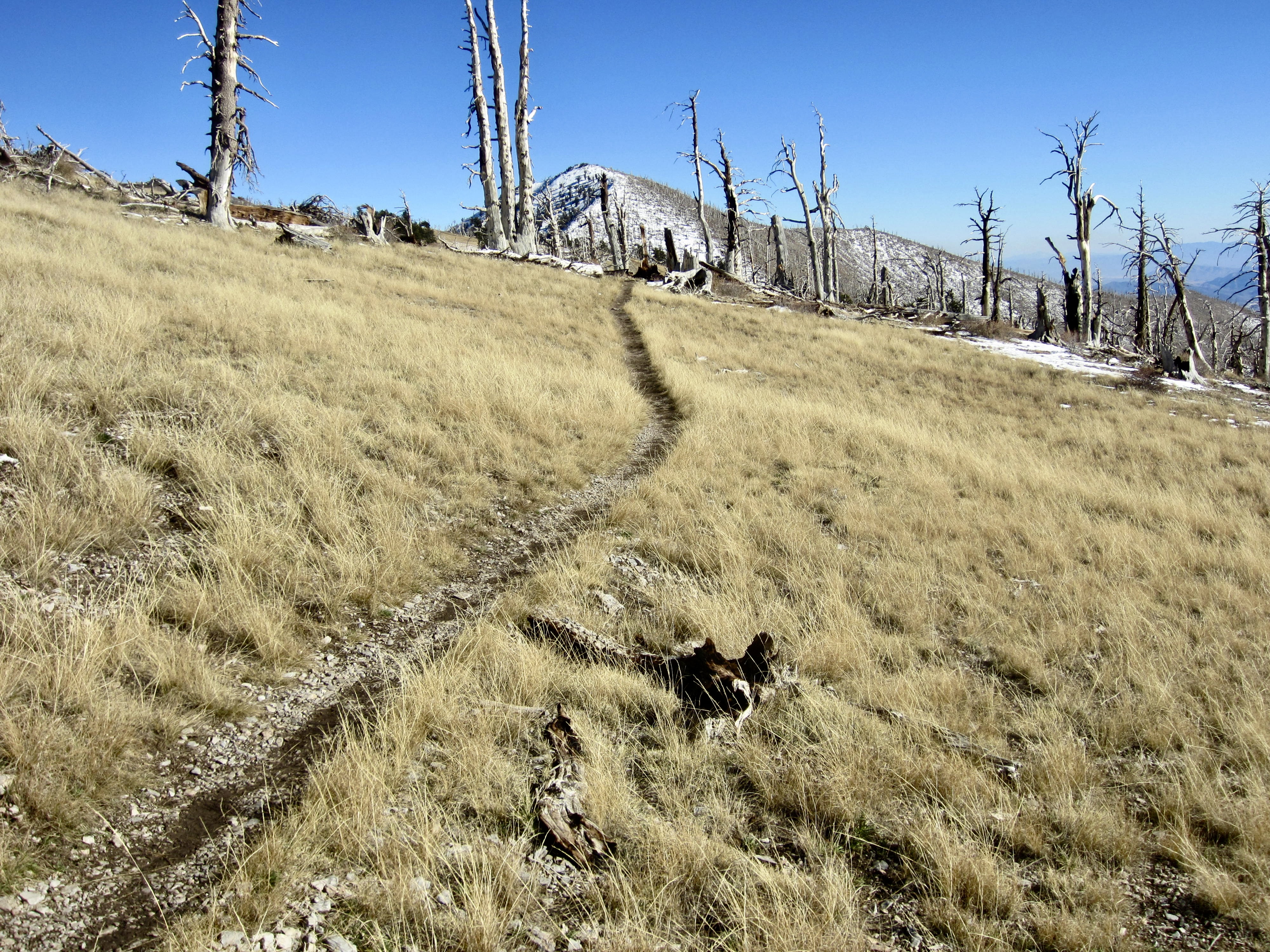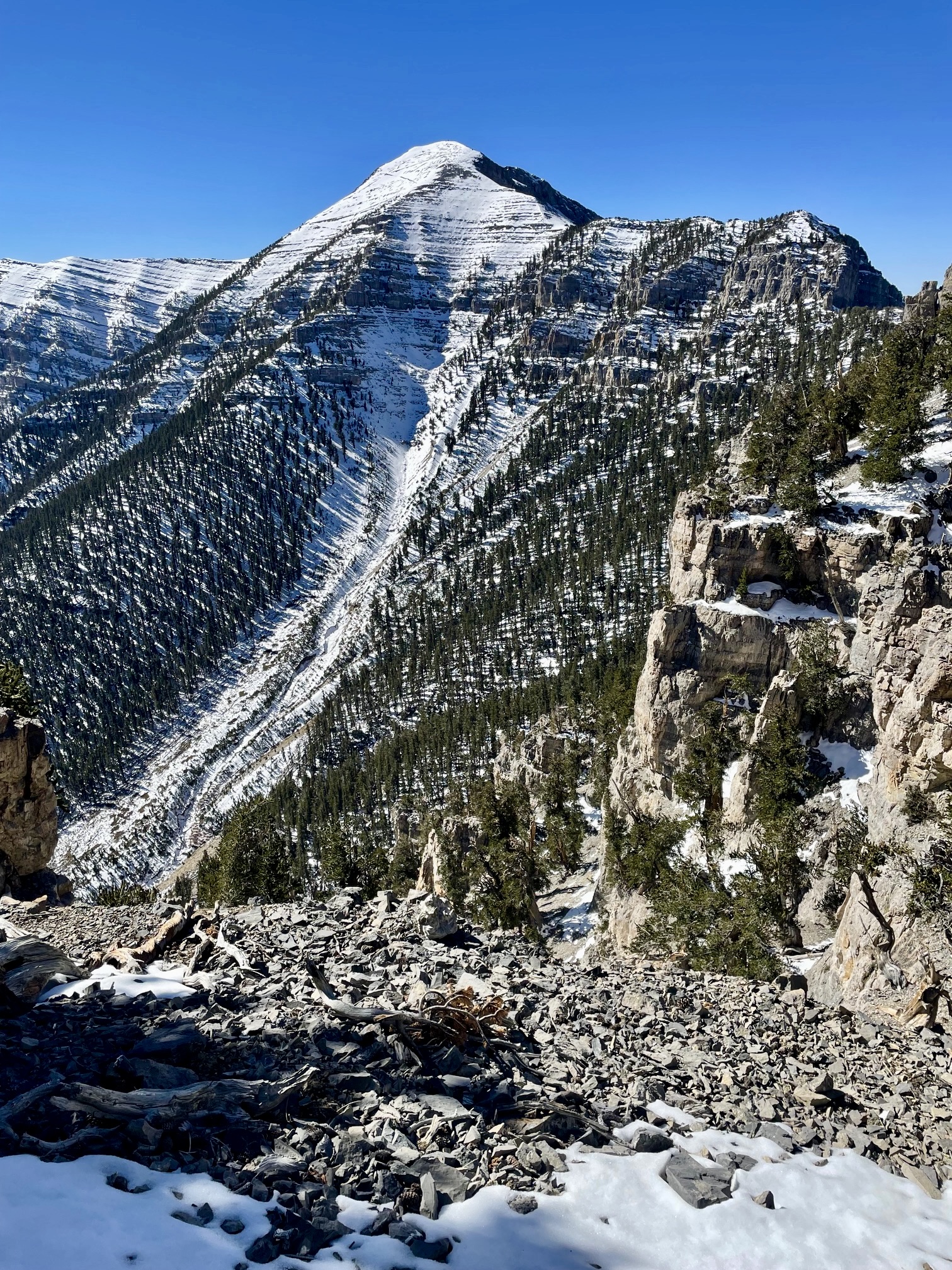 Leaving Mummy Pass on a chilly Monday morning, I followed the North Loop Trail on a rising traverse across the head of Trail Canyon. The broad summit of Charleston Peak came into view through the trees, and its snowy slopes stood in sharp contrast to the vivid blue sky. I could clearly see the trail switchbacking up the peak’s east slope, but it looked discouragingly far away.