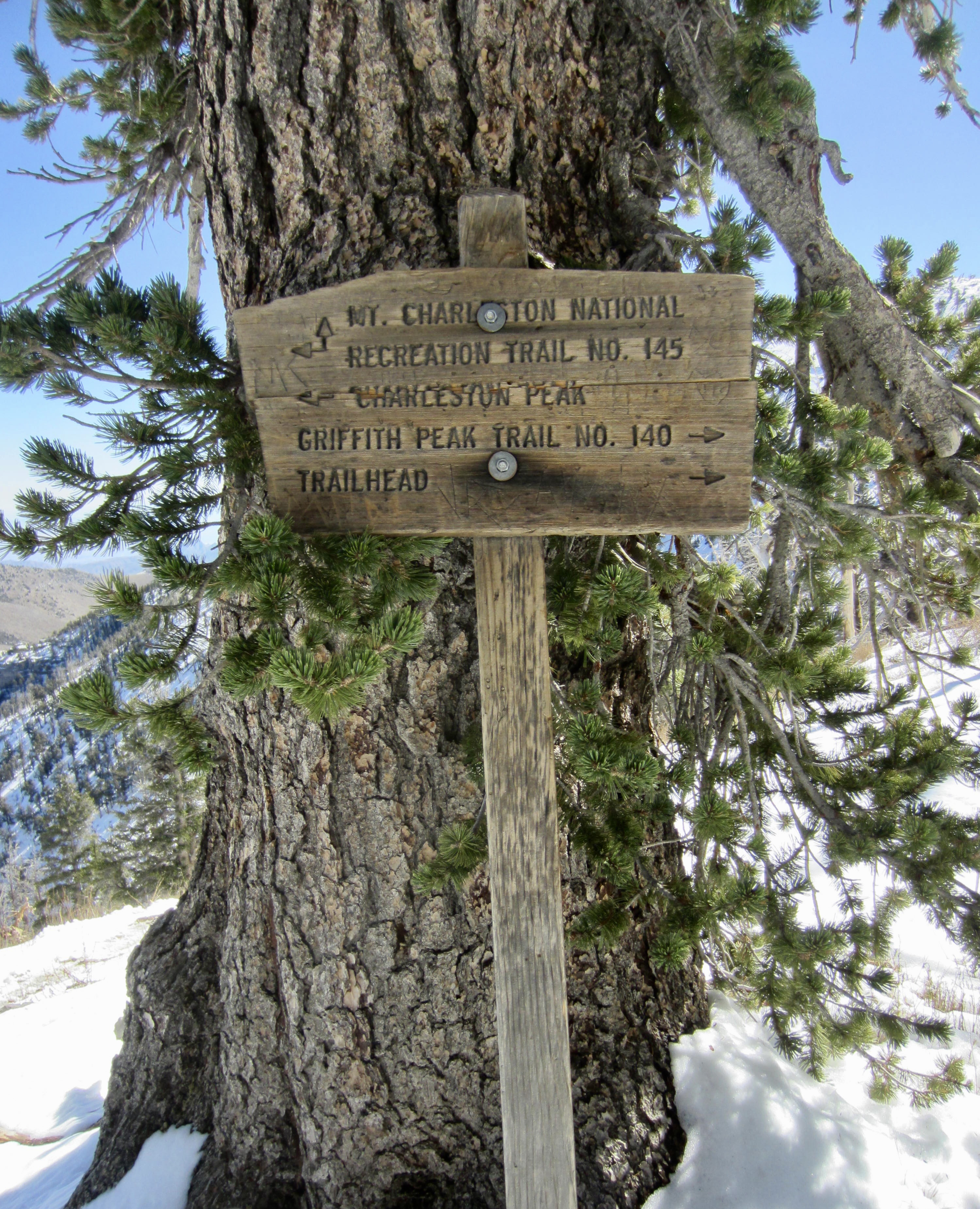 Charleston Peak can be readily accessed by either of two primary trails: the South Loop Trail via Griffith Junction or the North Loop Trail via Mummy Pass. Together, these trails constitute the Charleston Peak National Recreation Trail, which makes a big arc over the summit. An out-and-back summit hike on either trail results in a total distance ranging from 16 to 20 miles and a cumulative gain ranging from about 4700 to 5500 feet, depending on the specific starting point. Overall, the South Loop Trail is easier and more popular, whereas the North Loop Trail is harder but more interesting.