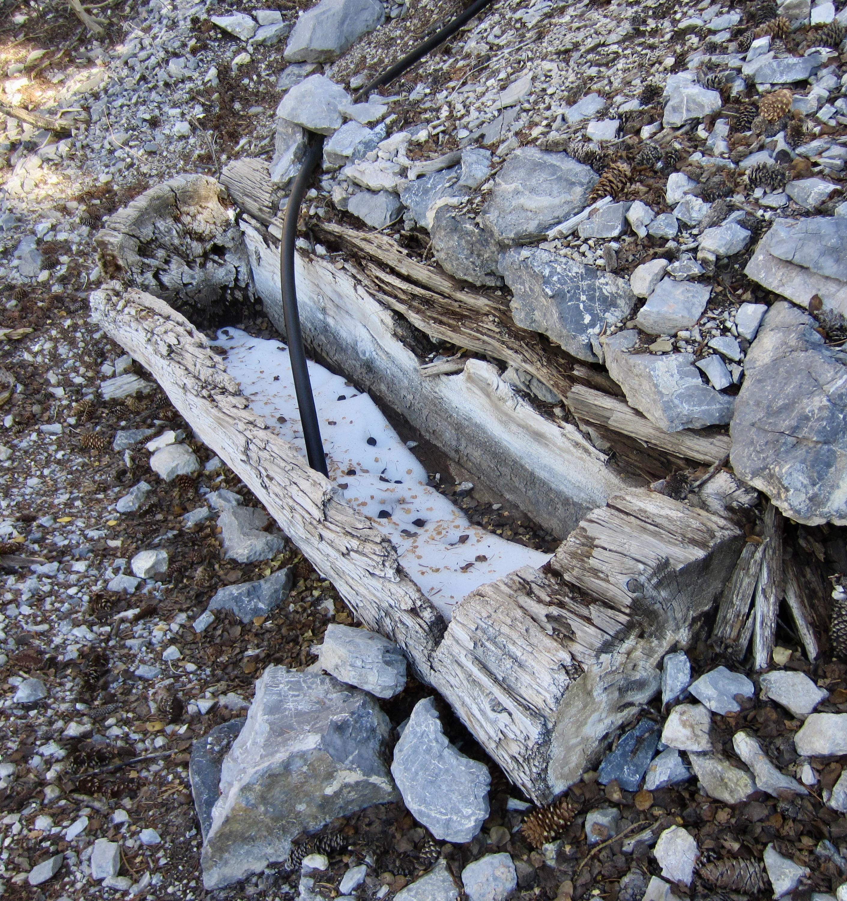 Very quickly, I entered the expansive burn zone of a 1940s-era forest fire. The entire hillslope within this zone is now vegetated with young aspen trees and widely spaced pine trees. I passed an old wooden water trough that marks the location of Cave Spring—presumably, the only summertime water source along the entire traverse but dry today.