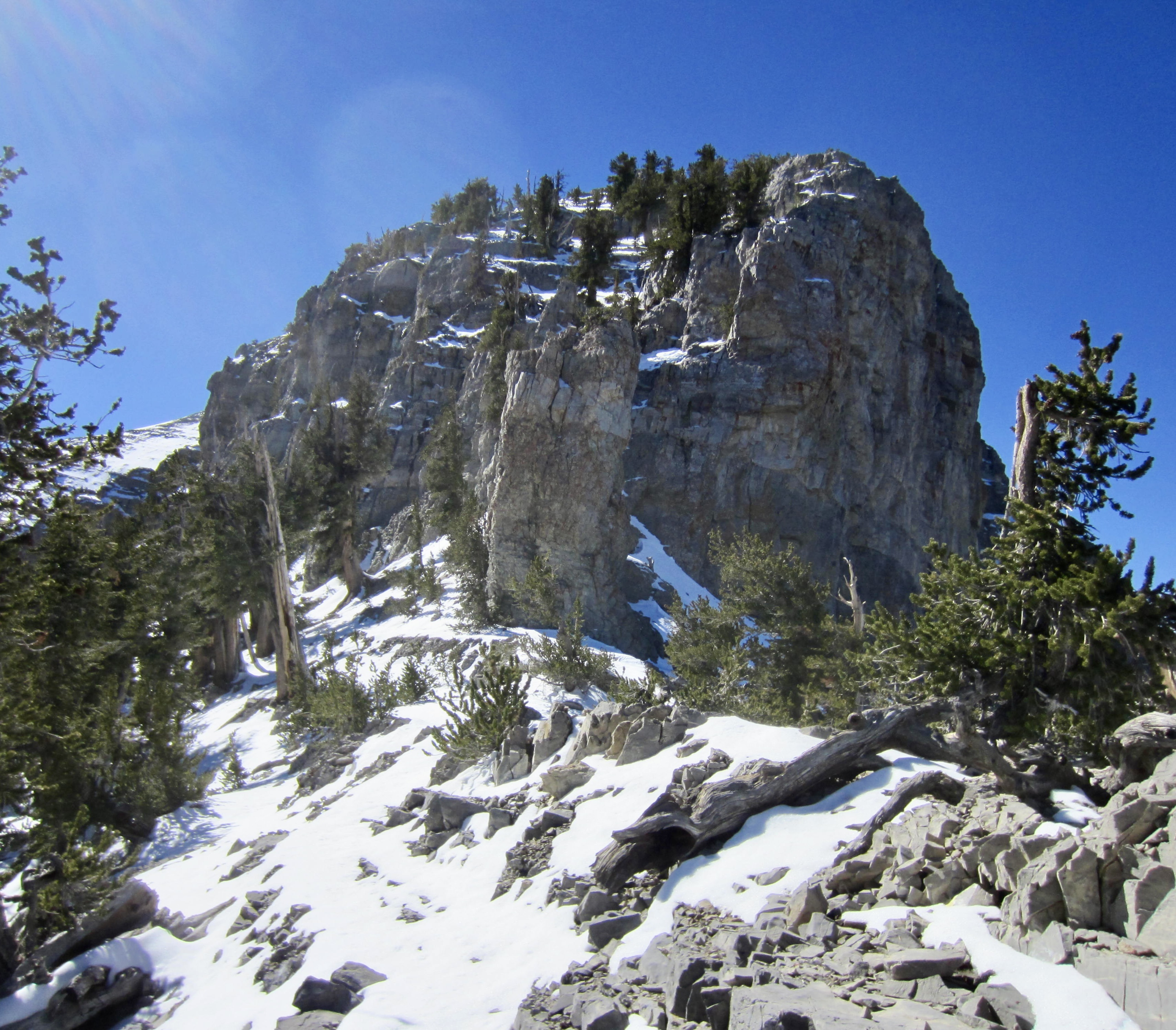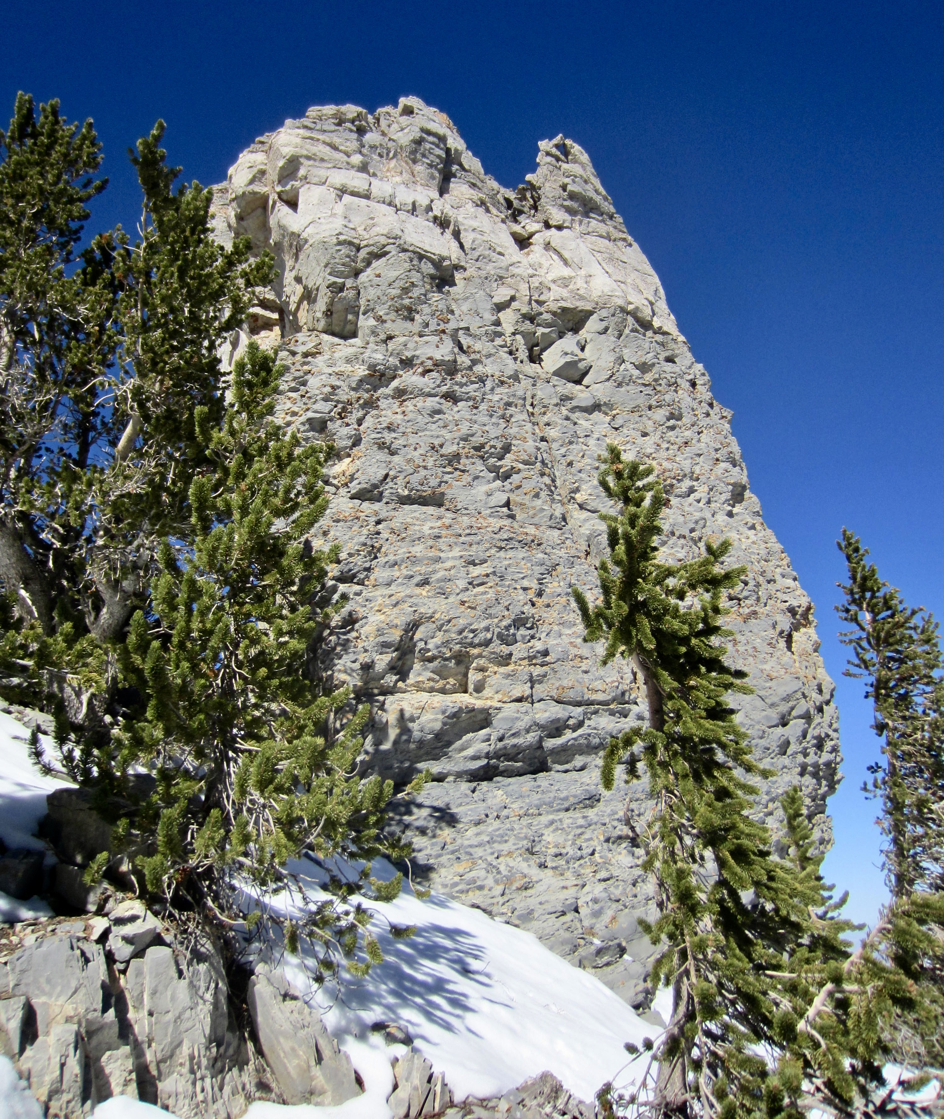 From Lee Overlook, the trail makes a left turn below Rocketship Peak and heads south for several hundred yards to reach Devil’s Thumb. This intriguingly named feature consists of a 40-foot-high limestone pinnacle that stands in a saddle on Charleston Peak’s north ridge. It looks like a worthwhile crag climb for anyone willing to haul gear this far.