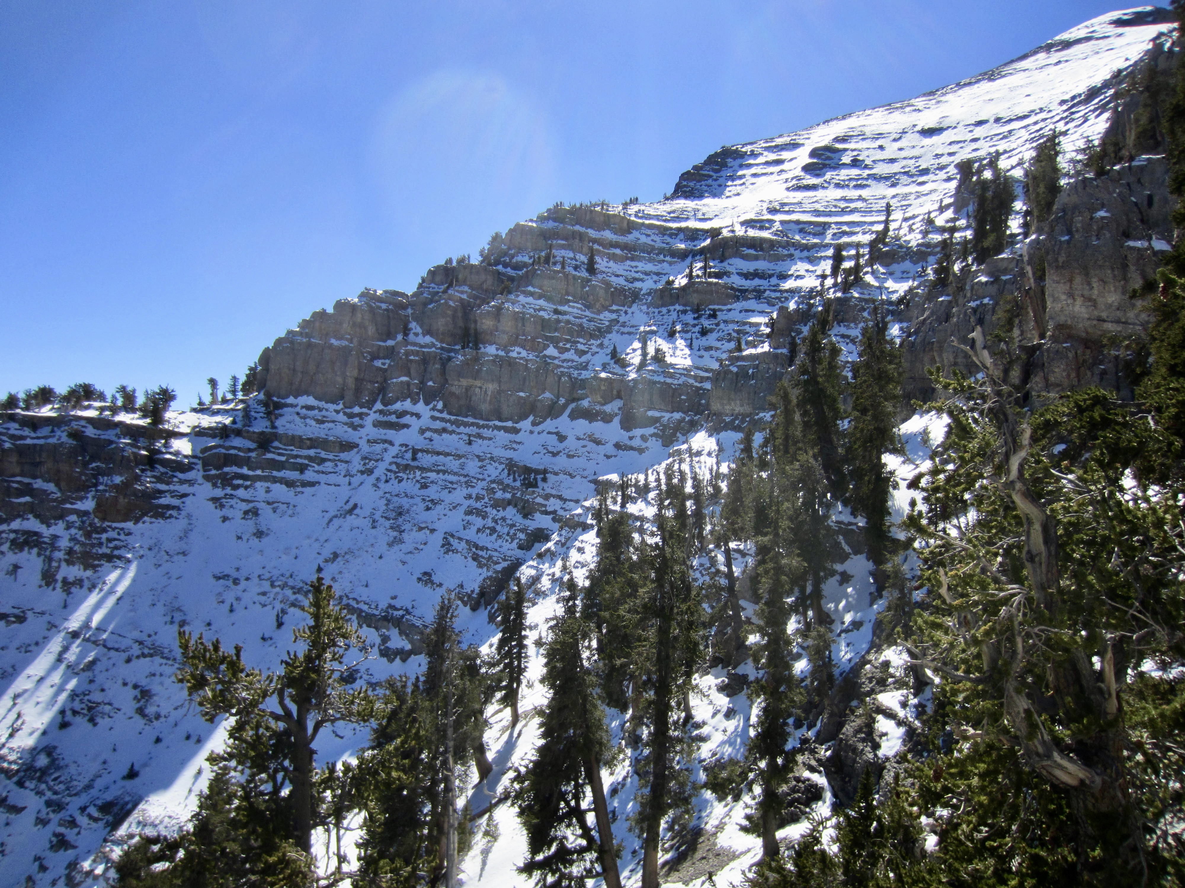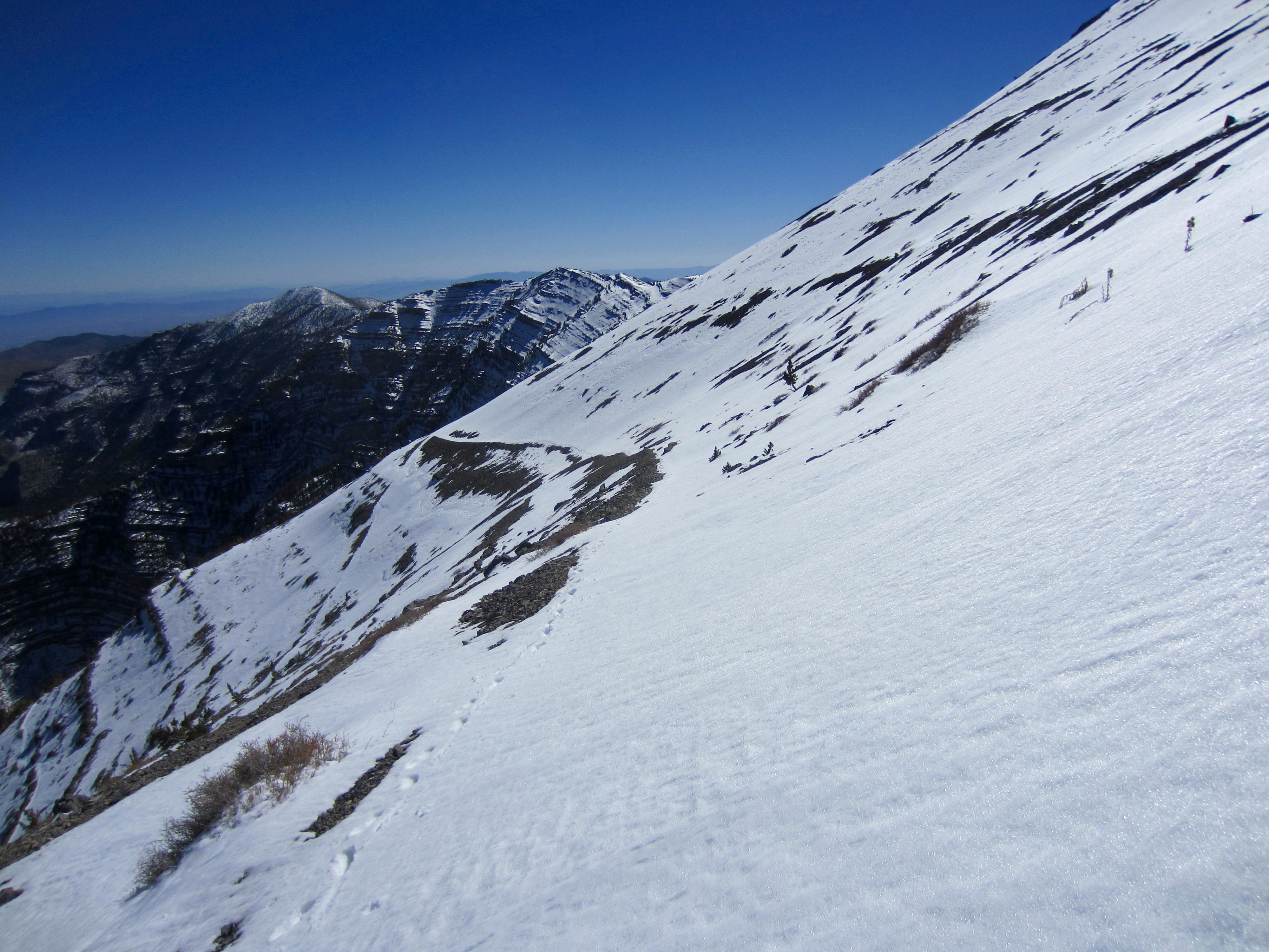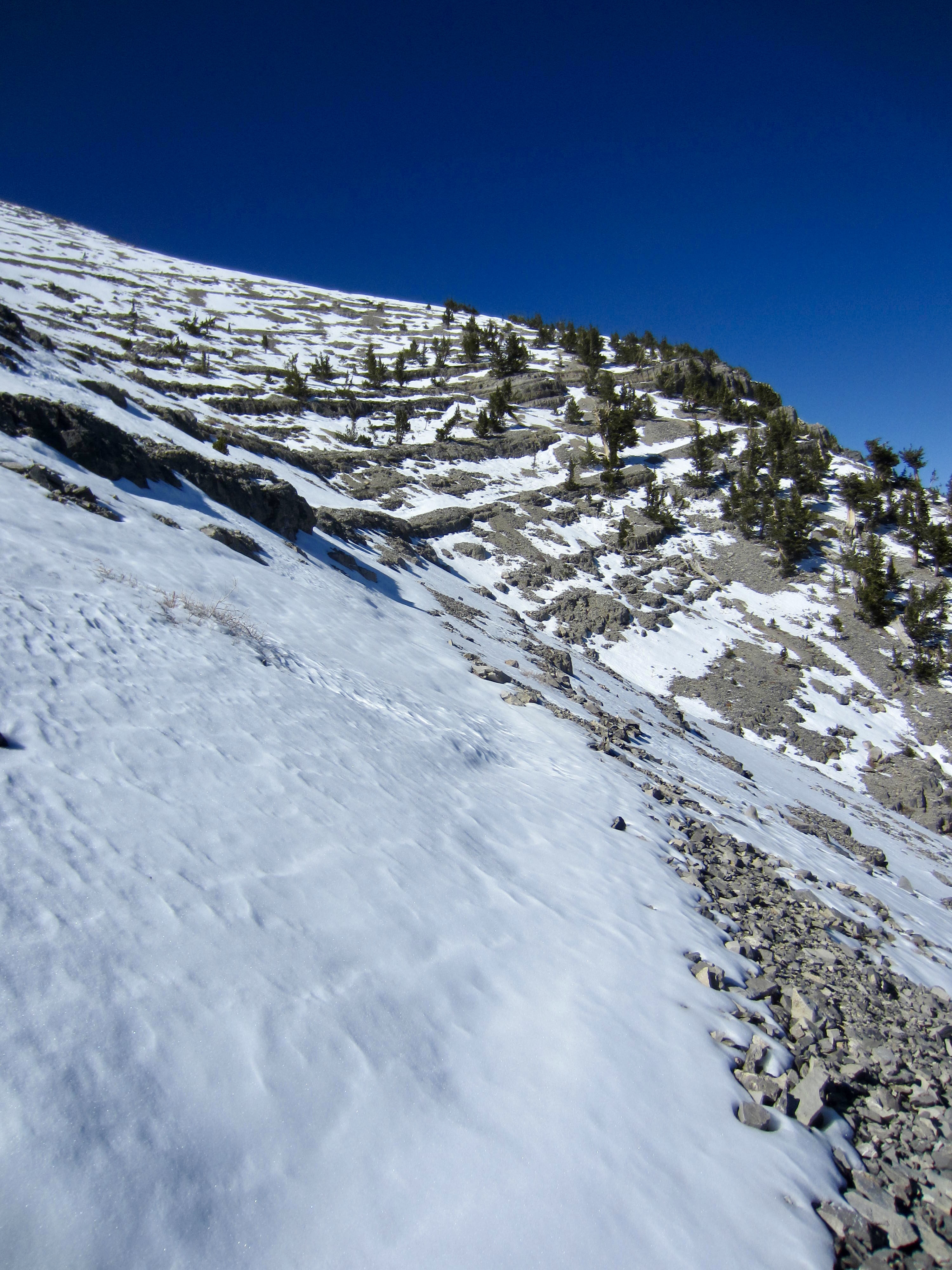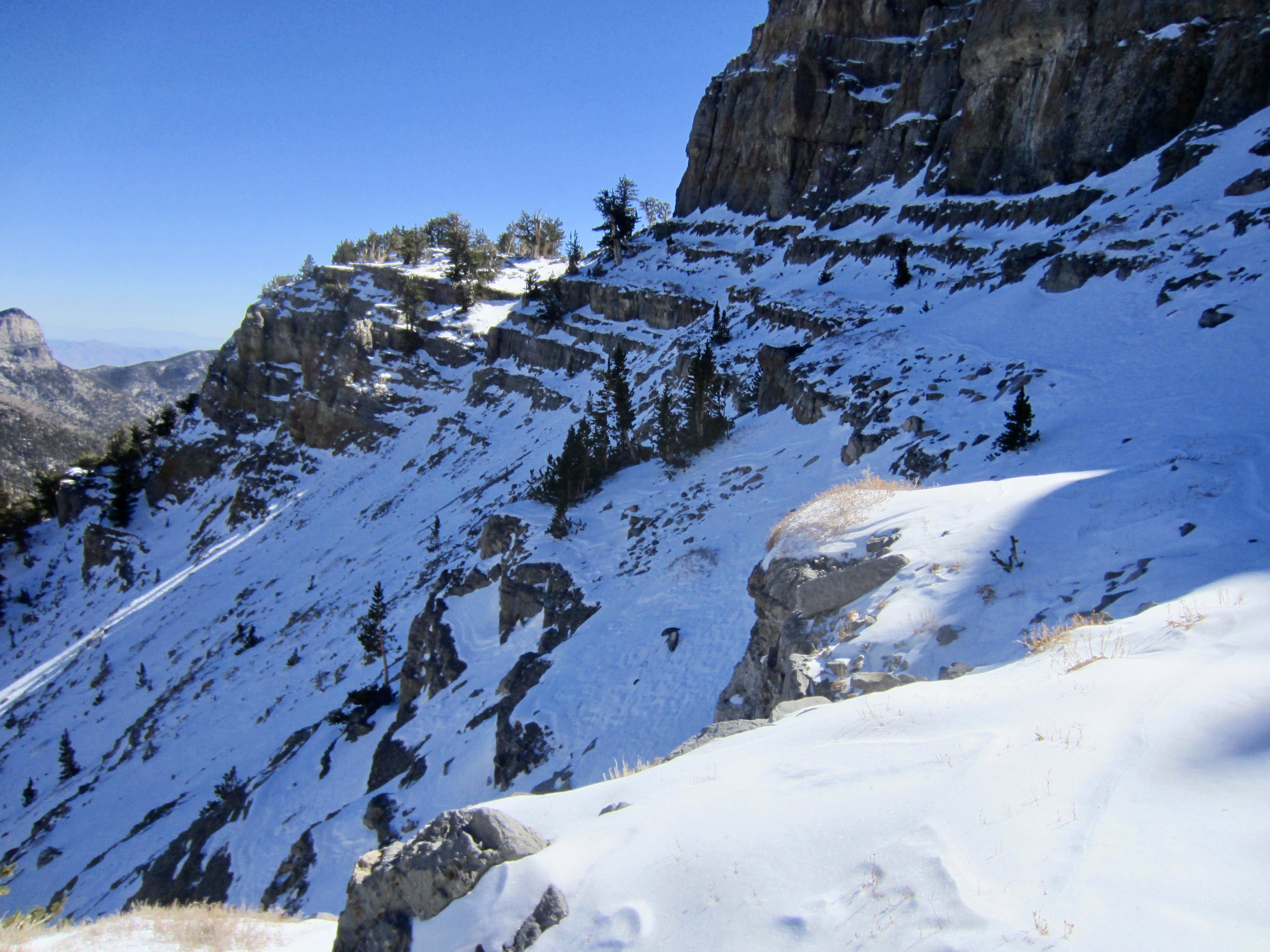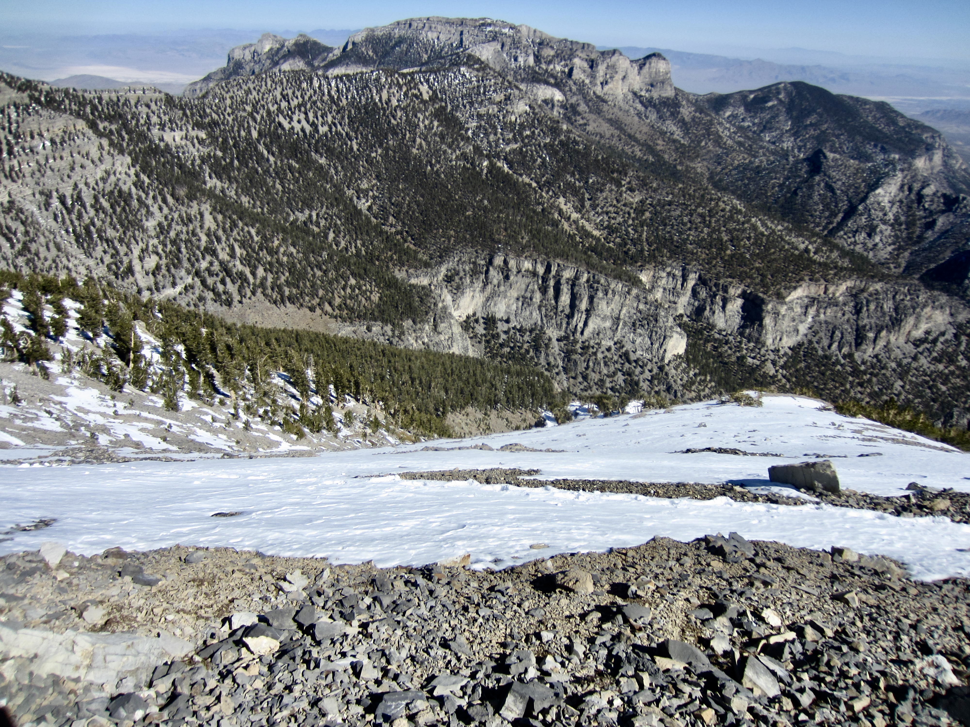 Over to the right was Charleston Peak, now looking very close. Its precipitous, tightly banded northeast face stared back at me, and I wondered whether I could safely cross those snow-covered ledges to reach the east slope. There seemed to be a good possibility that I would get stymied and need to retrace my approach hike. I considered my chances to be 50-50 at this point.