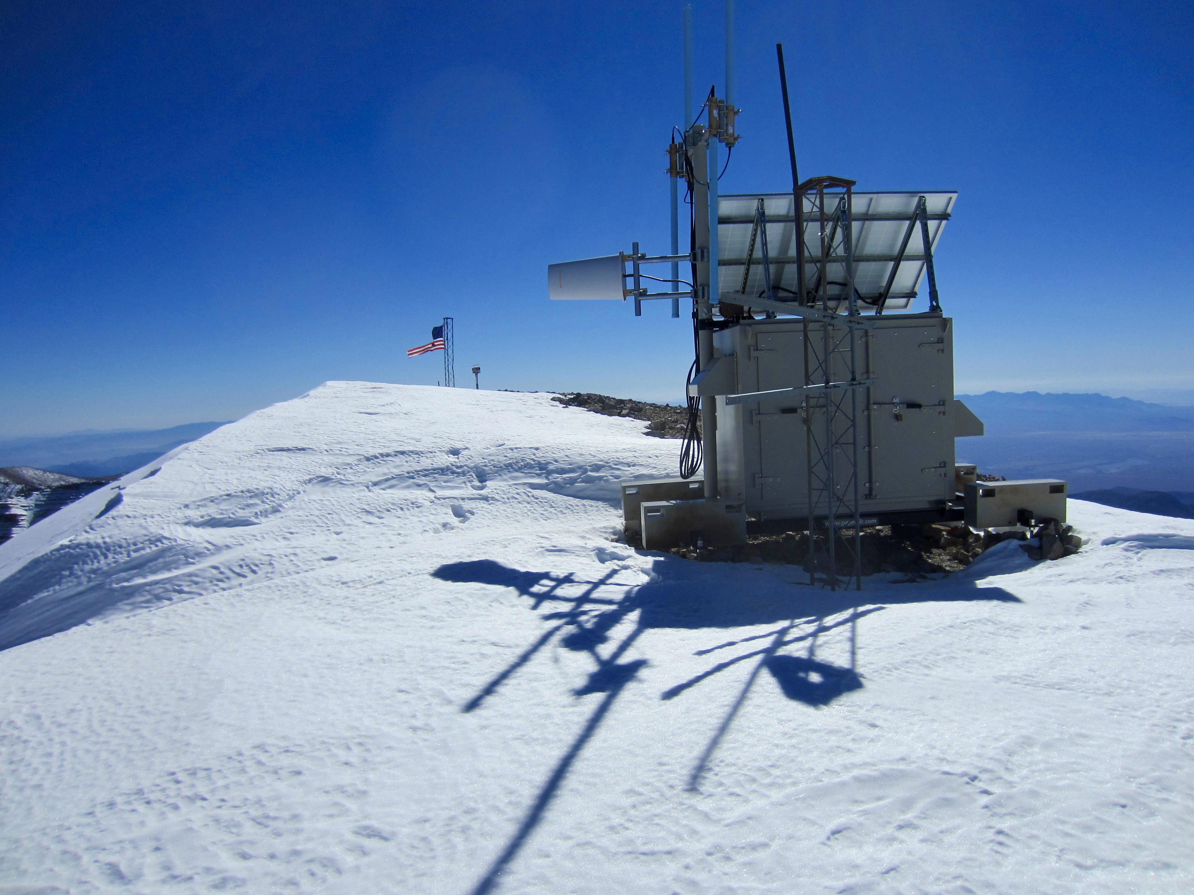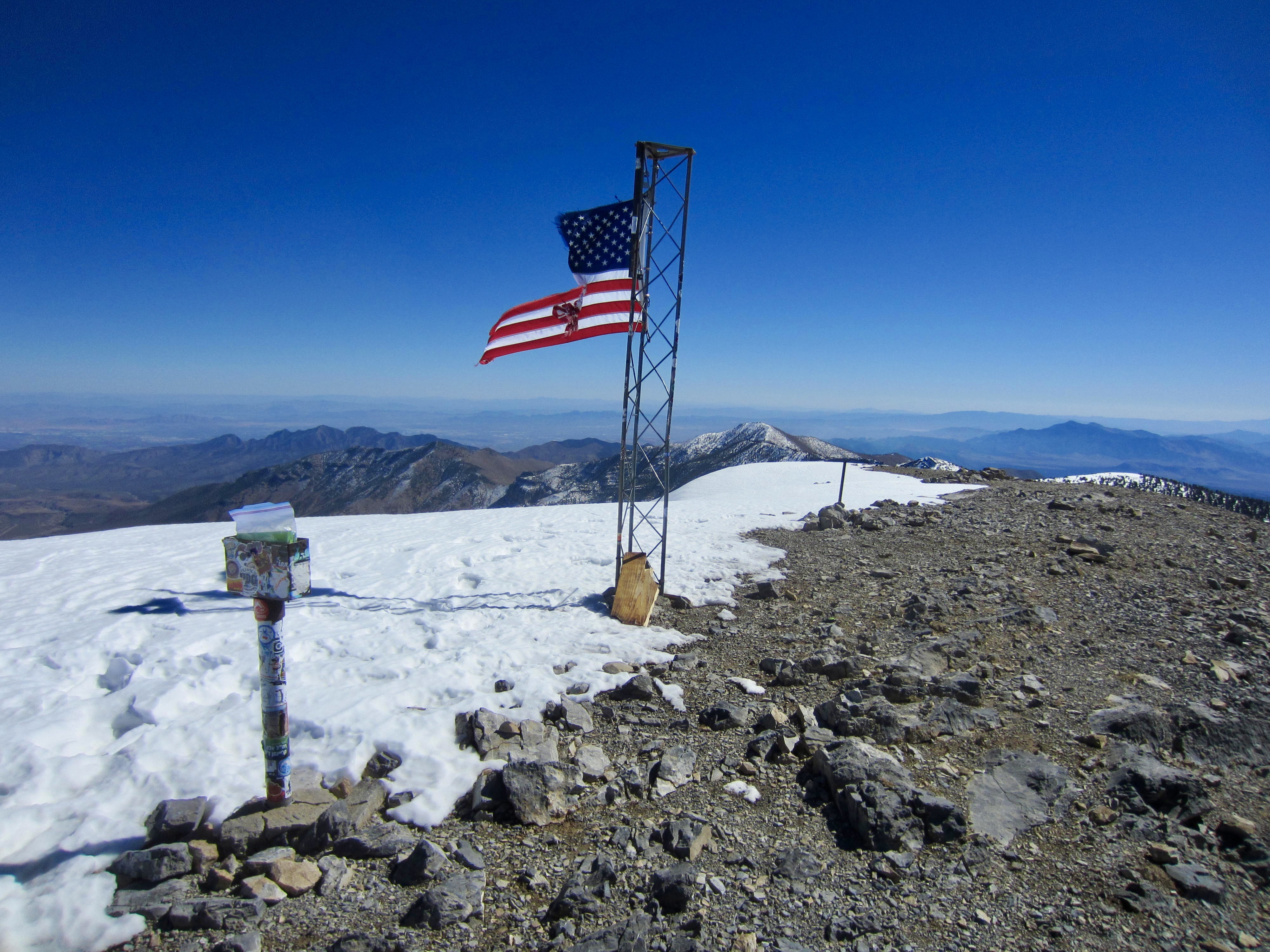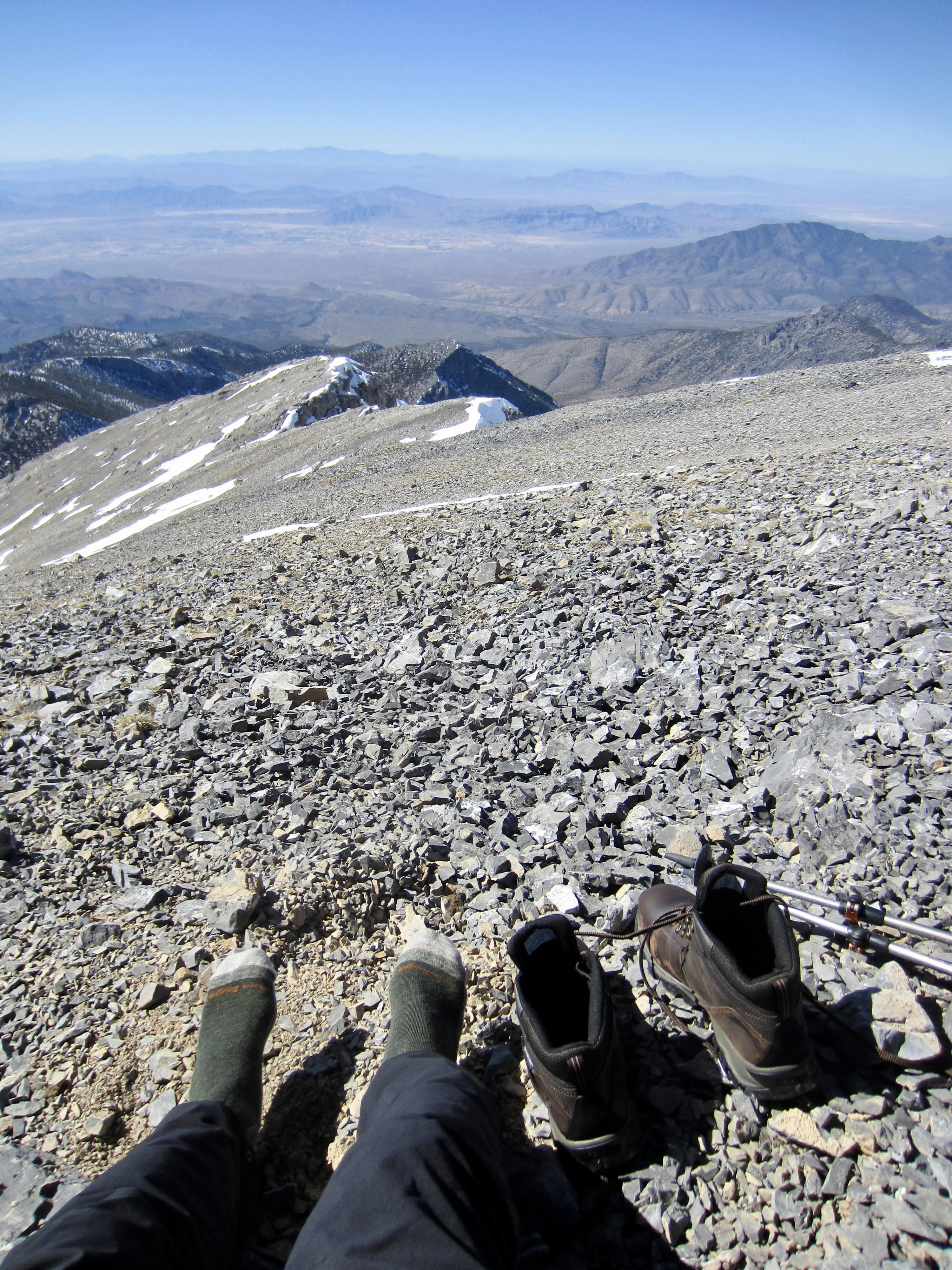A summit communication structure and flagpole eventually came into view, and a final tack brought me to the top of Charleston Peak at 1:00pm (5.9 miles + 2900 feet from Mummy Pass). I was exhausted but ecstatic—and not just because I could change into dry socks!